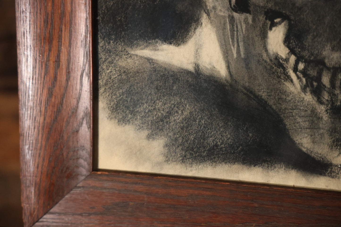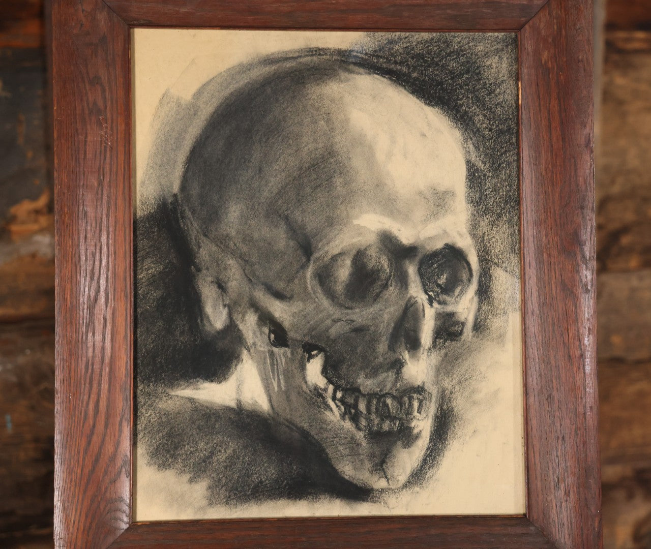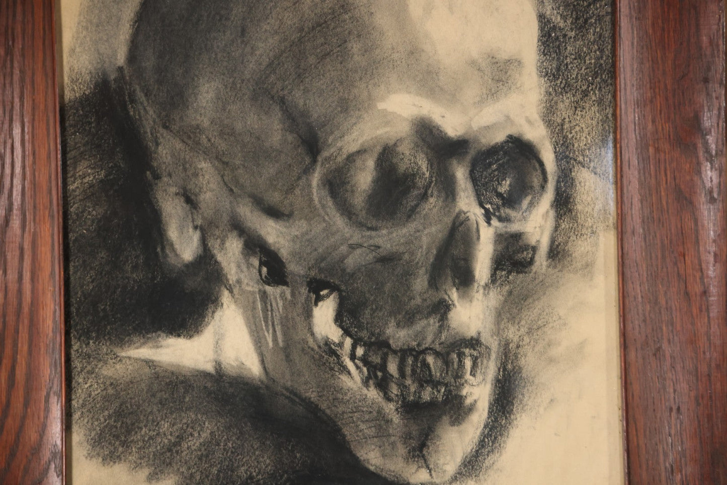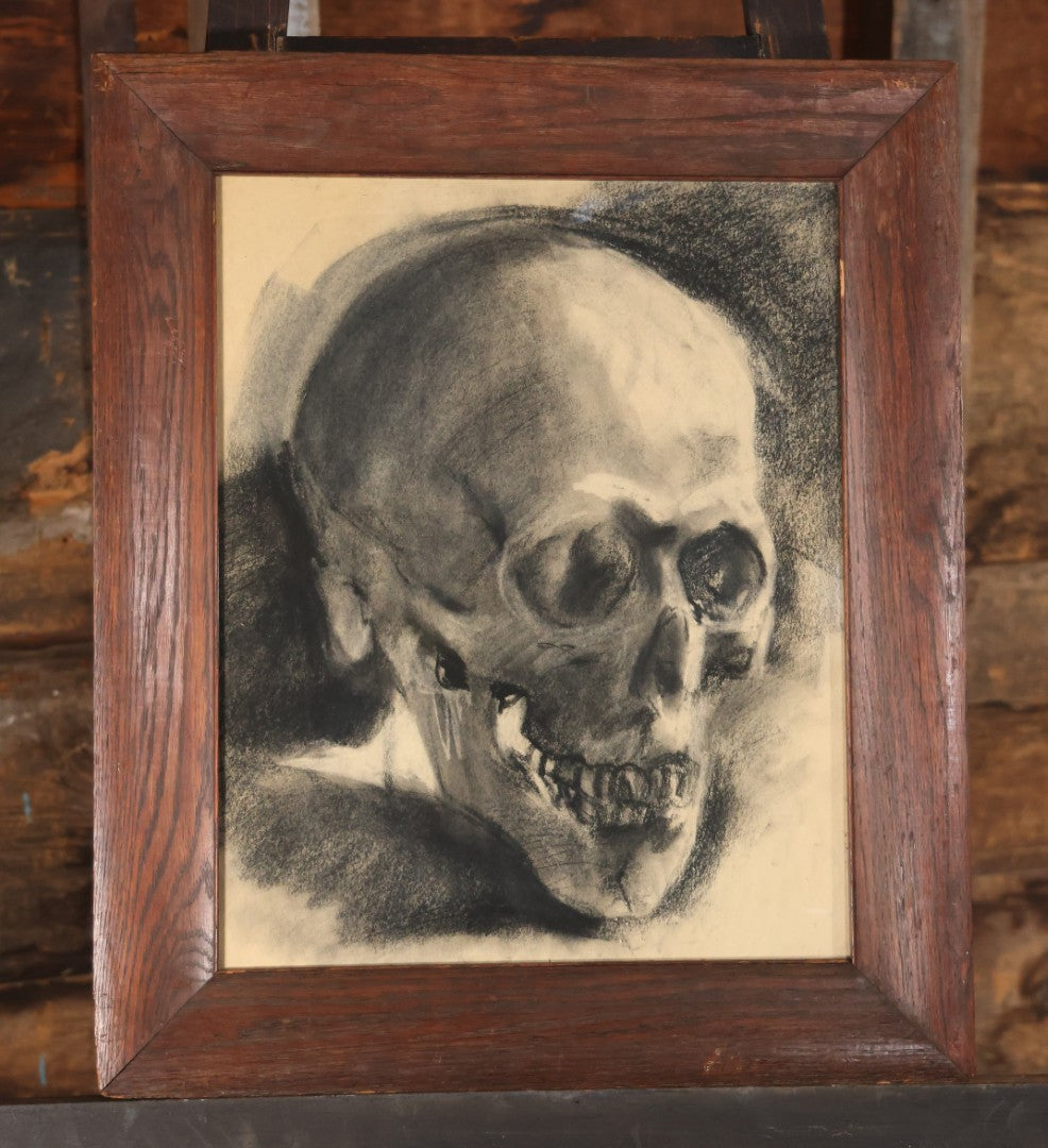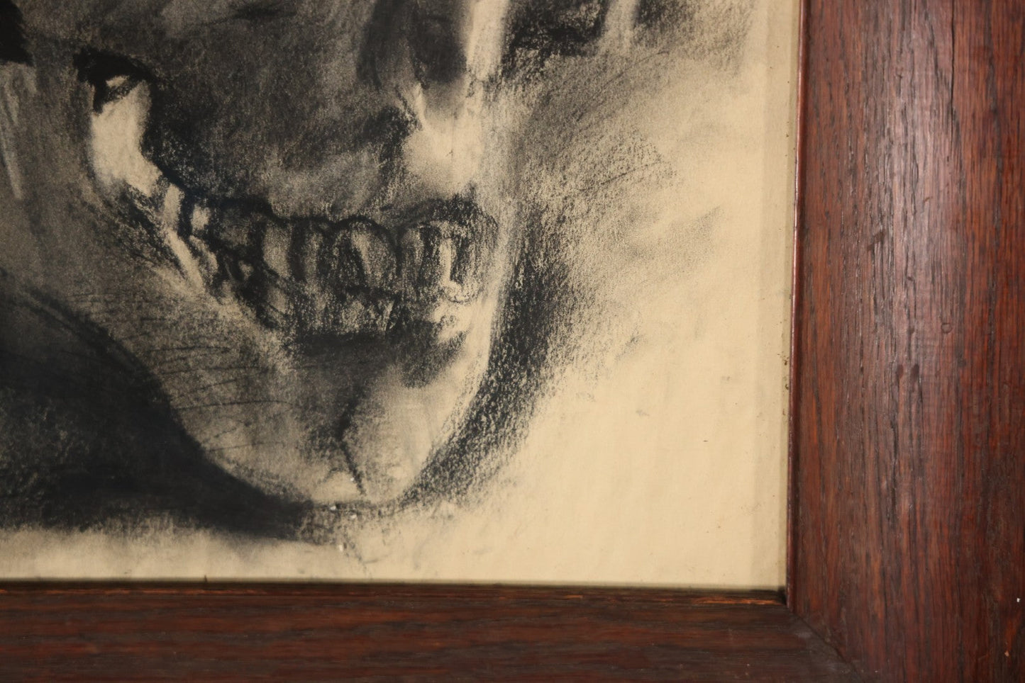Vintage Charcoal Drawing Still Life Human Skull Study On Paper In Solid Wood Frame, 21-5/8" x 25-5/8"