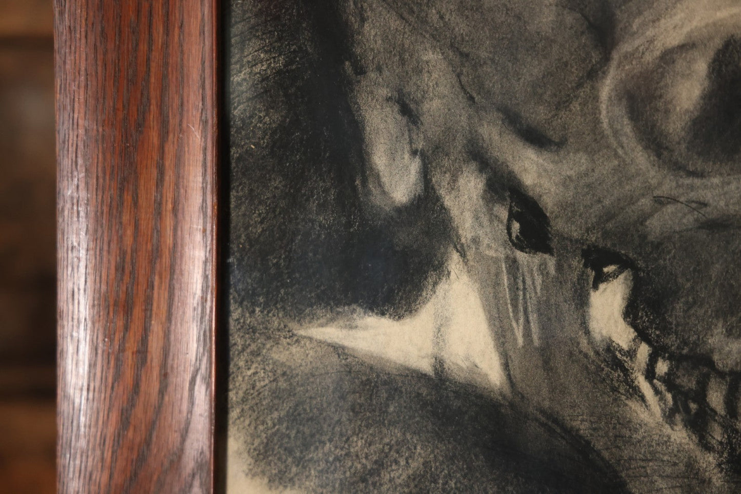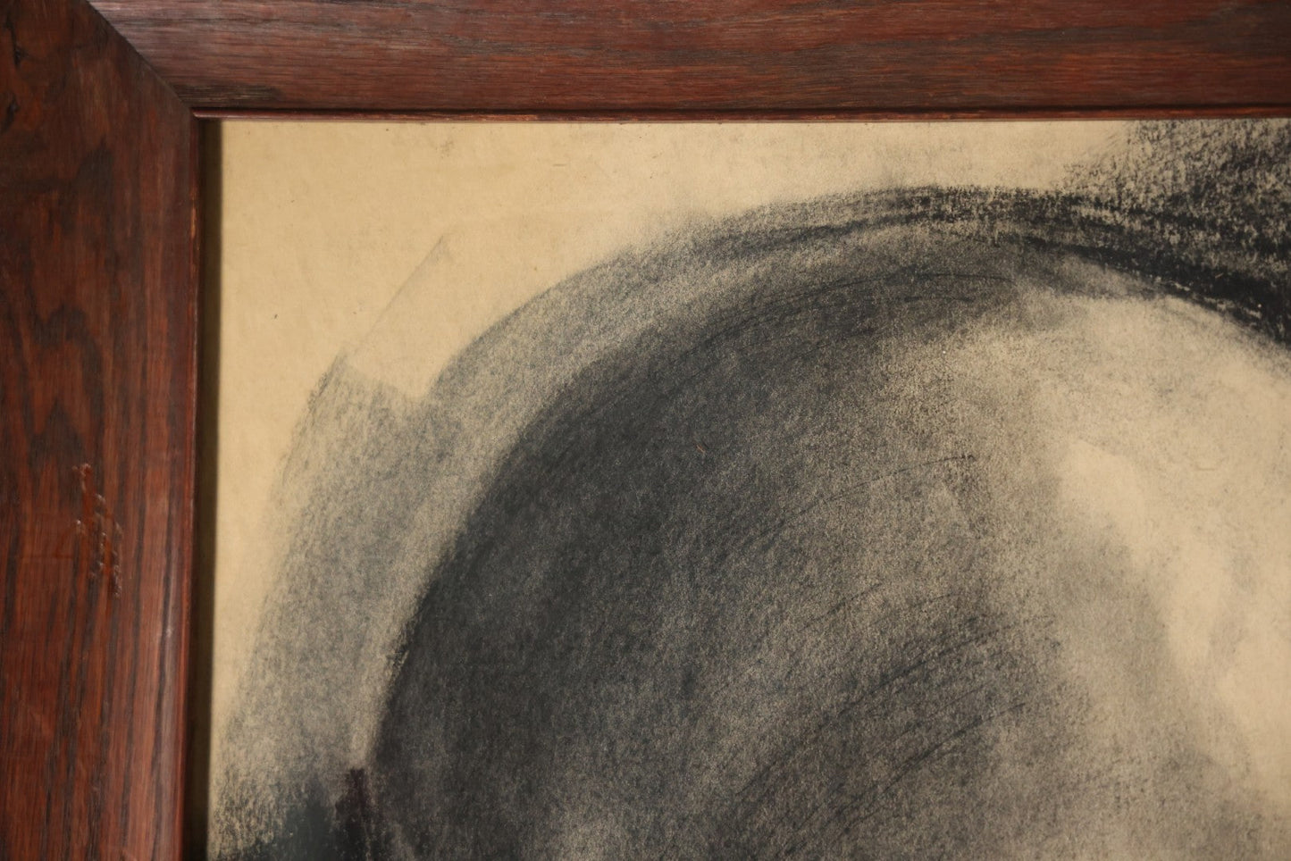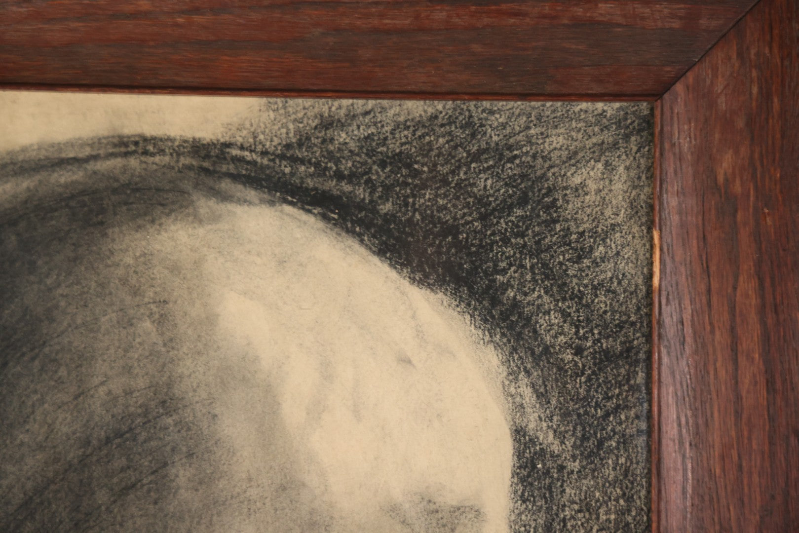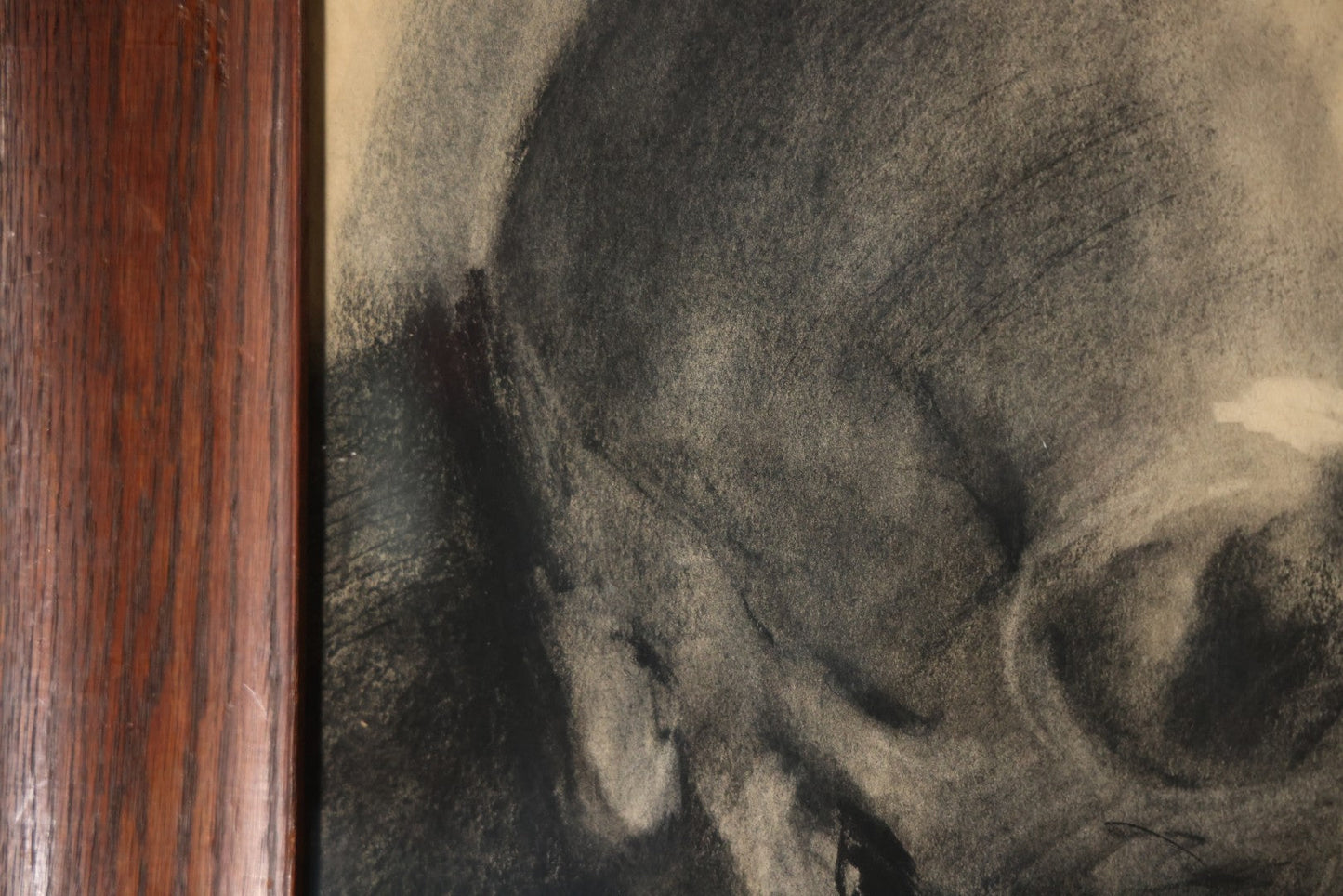 Vintage Charcoal Drawing Still Life Human Skull Study On Paper In Solid Wood Frame, 21-5/8" x 25-5/8"
