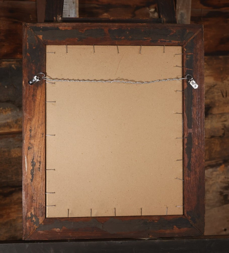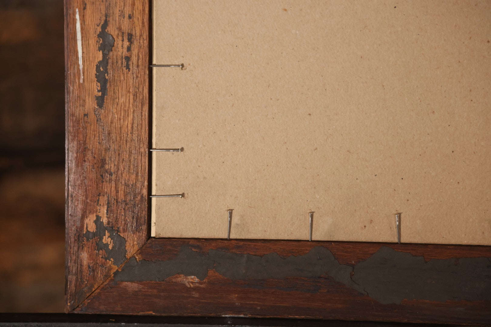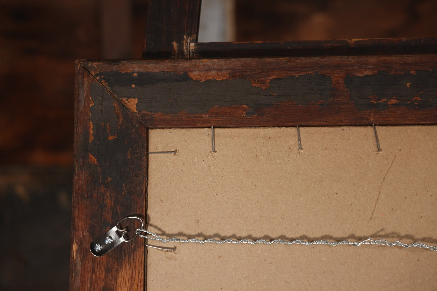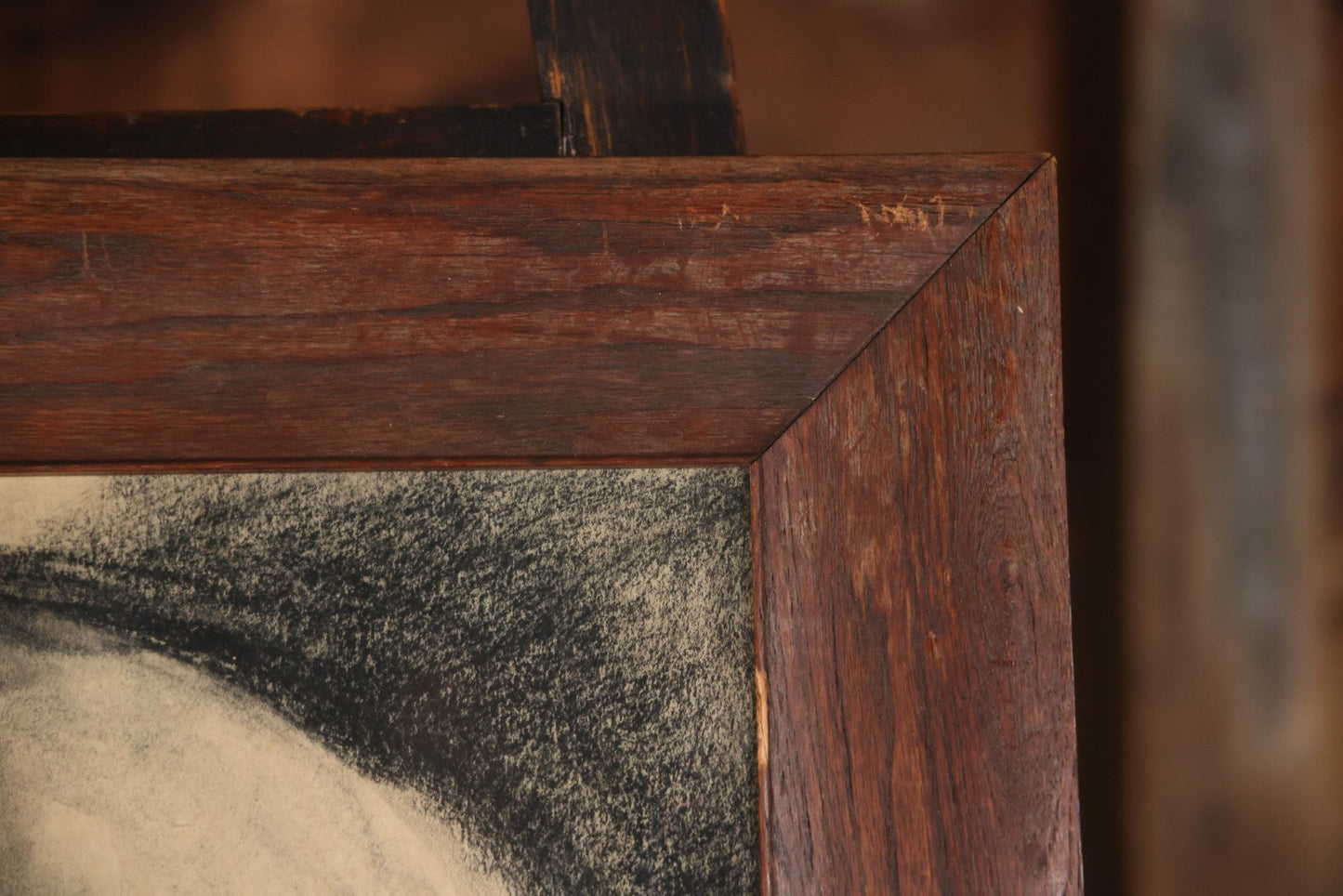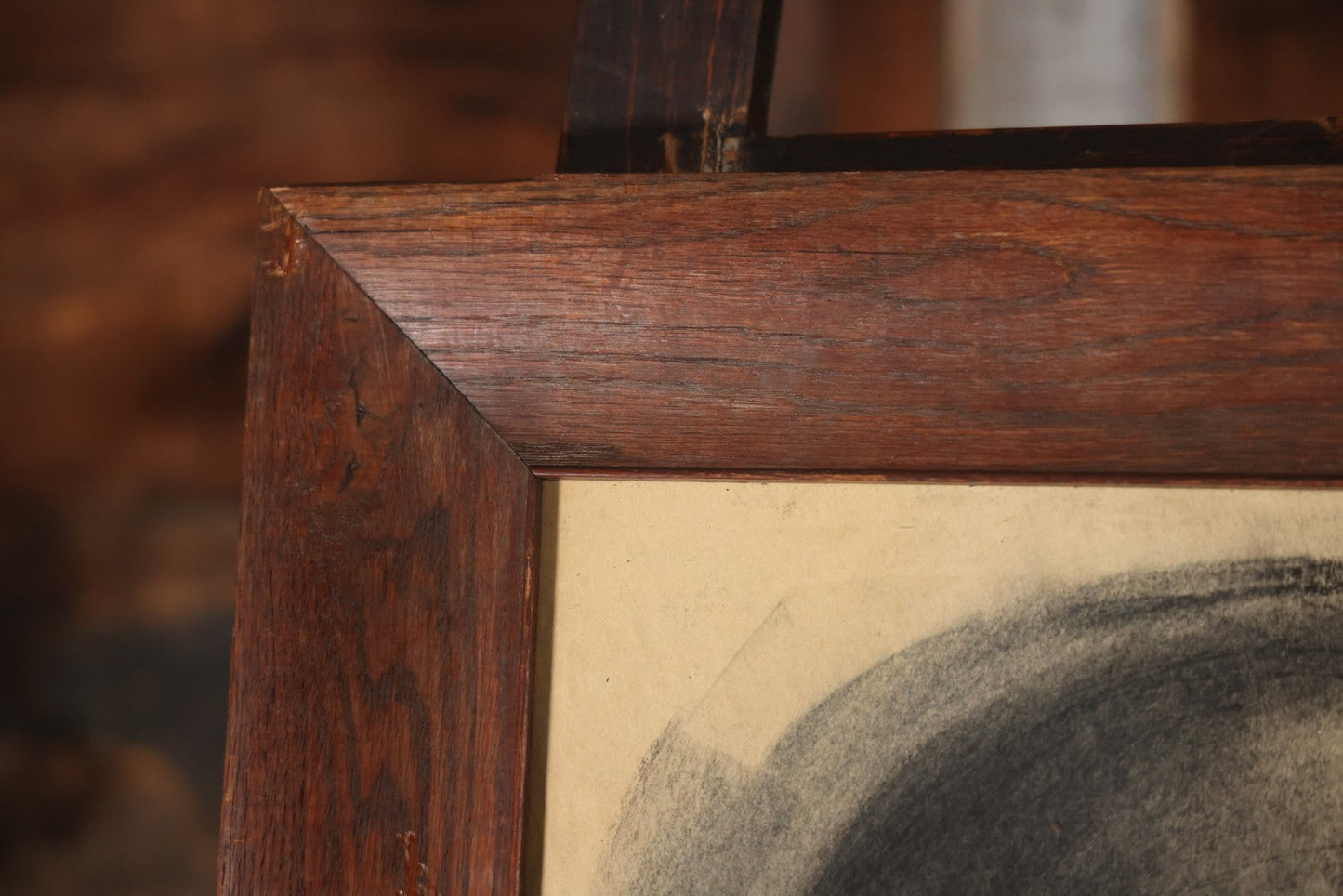 Framed in house. Found in a bundle of artwork by an unknown artist. Excess paper cut down to frame size. Wear to drawing and frame as seen.
