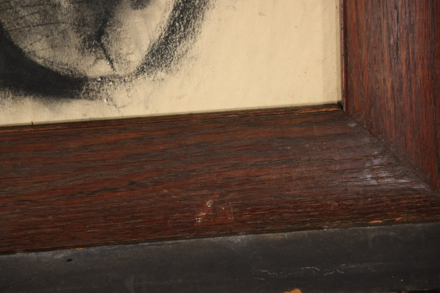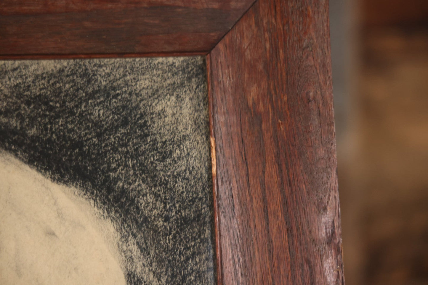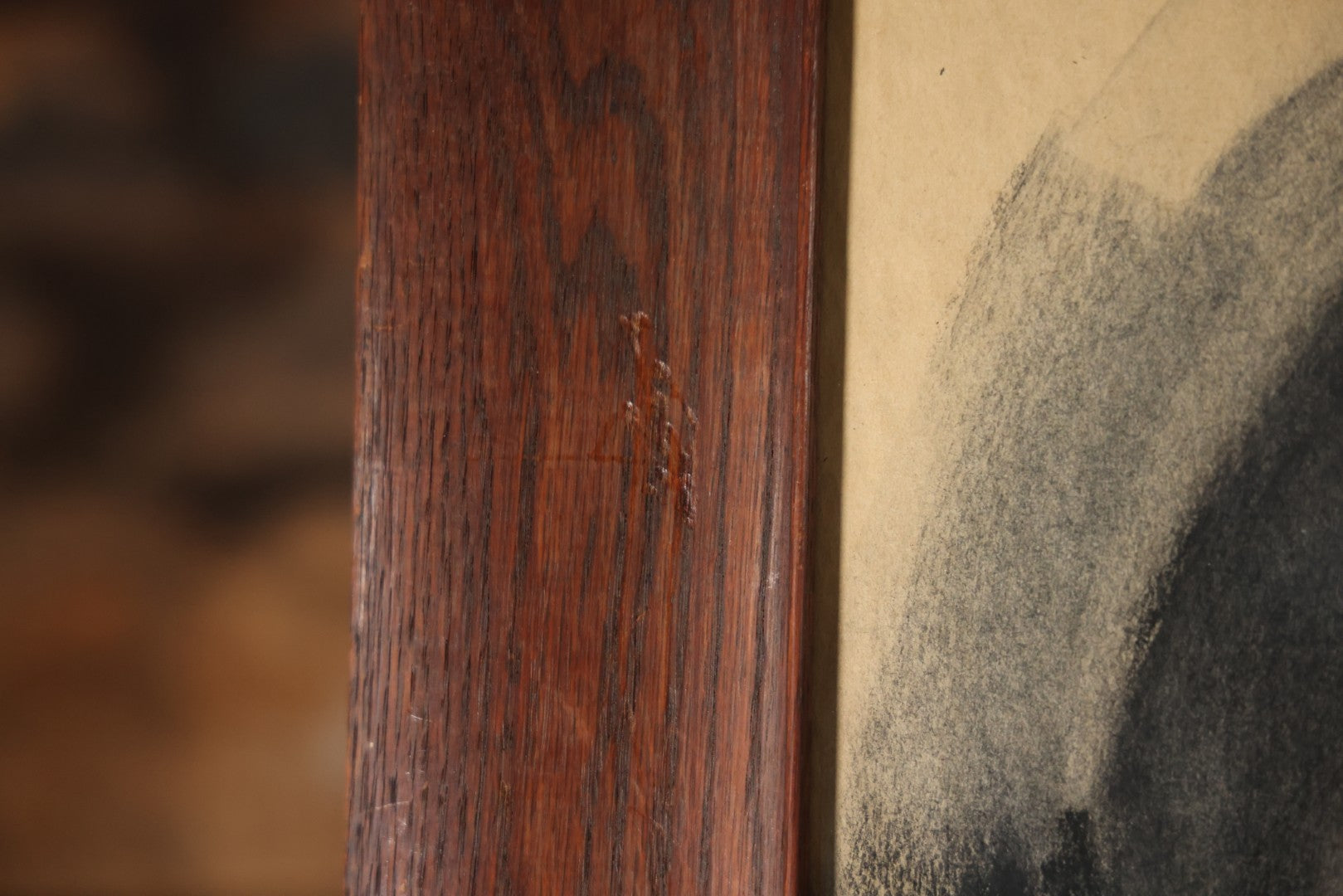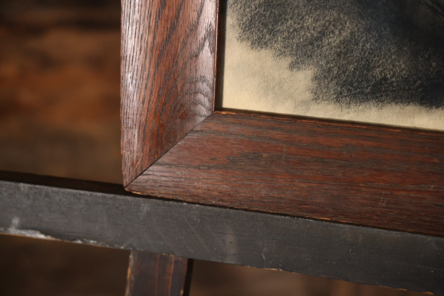 Framed in house. Found in a bundle of artwork by an unknown artist. Excess paper cut down to frame size. Wear to drawing and frame as seen.