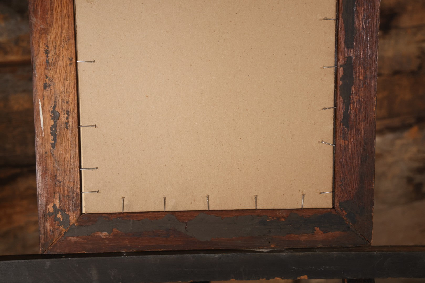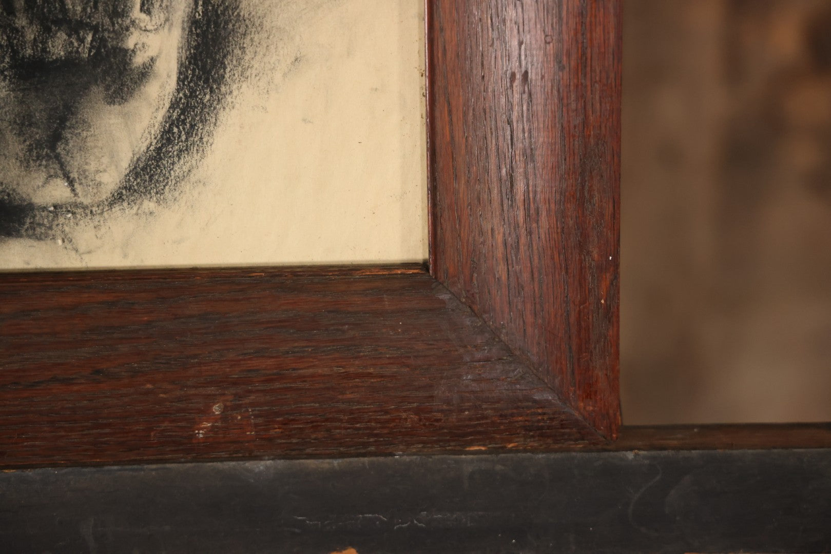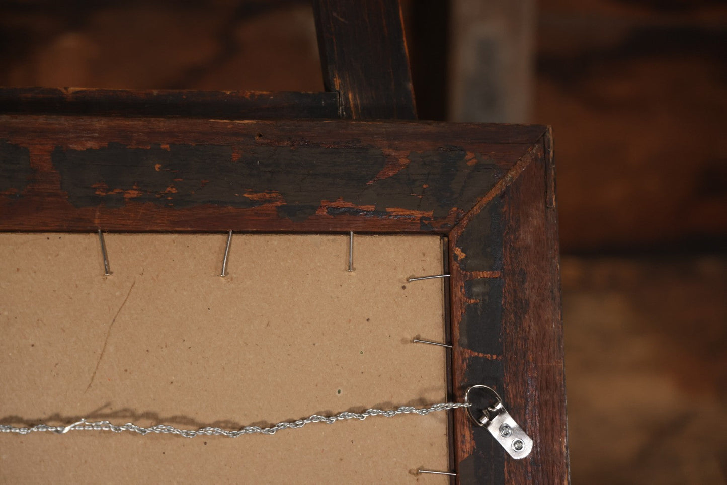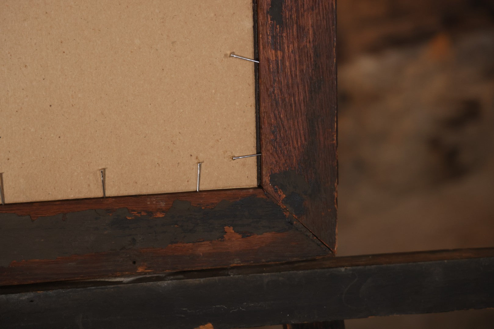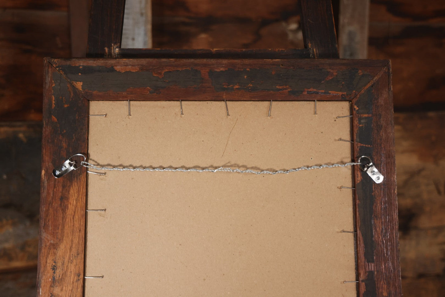 Framed in house. Found in a bundle of artwork by an unknown artist. Excess paper cut down to frame size. Wear to drawing and frame as seen.