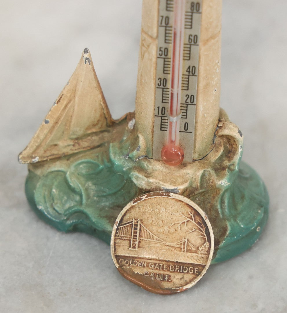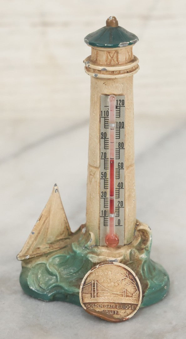 Lot 111 - Vintage Cold Painted Cast Pot Metal Souvenir Lighthouse And Sailboat Thermometer From Golden Gate Bridge, San Francisco California