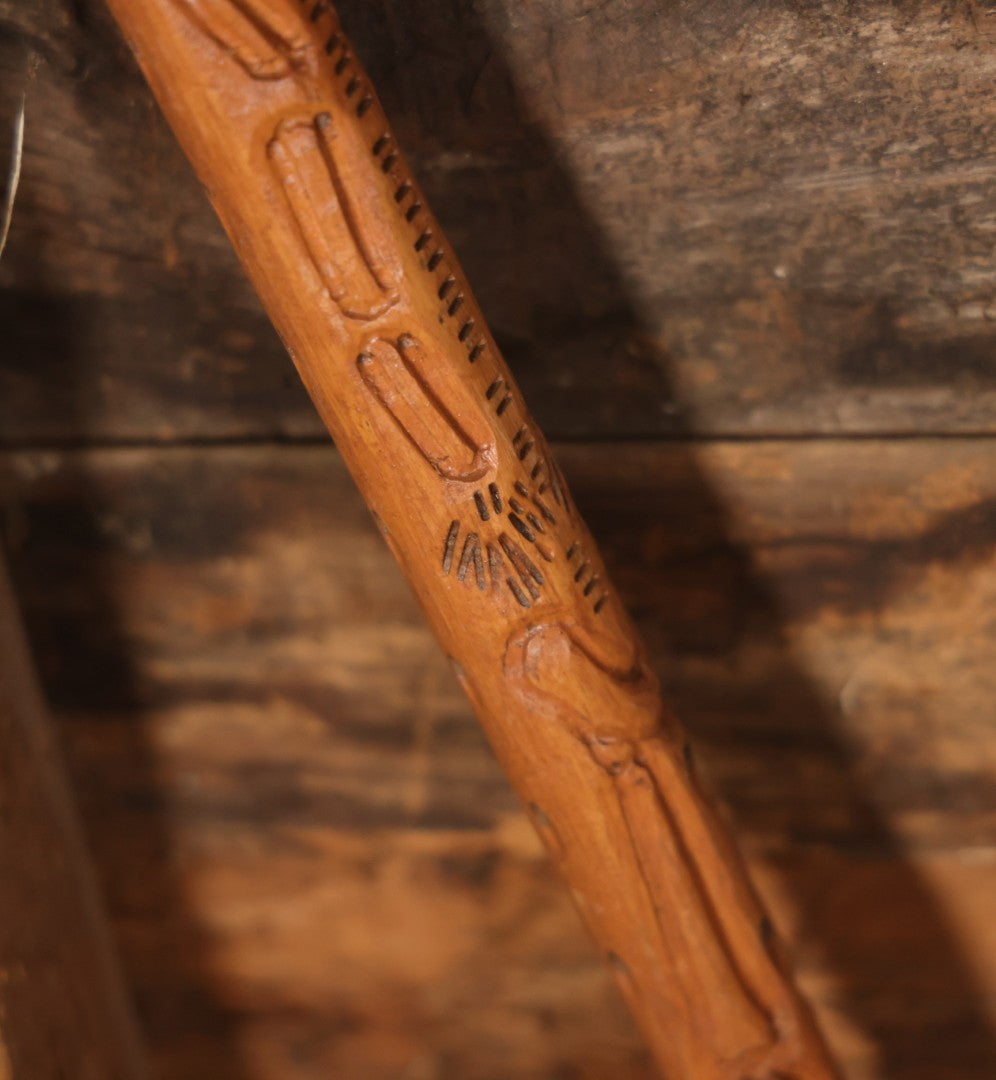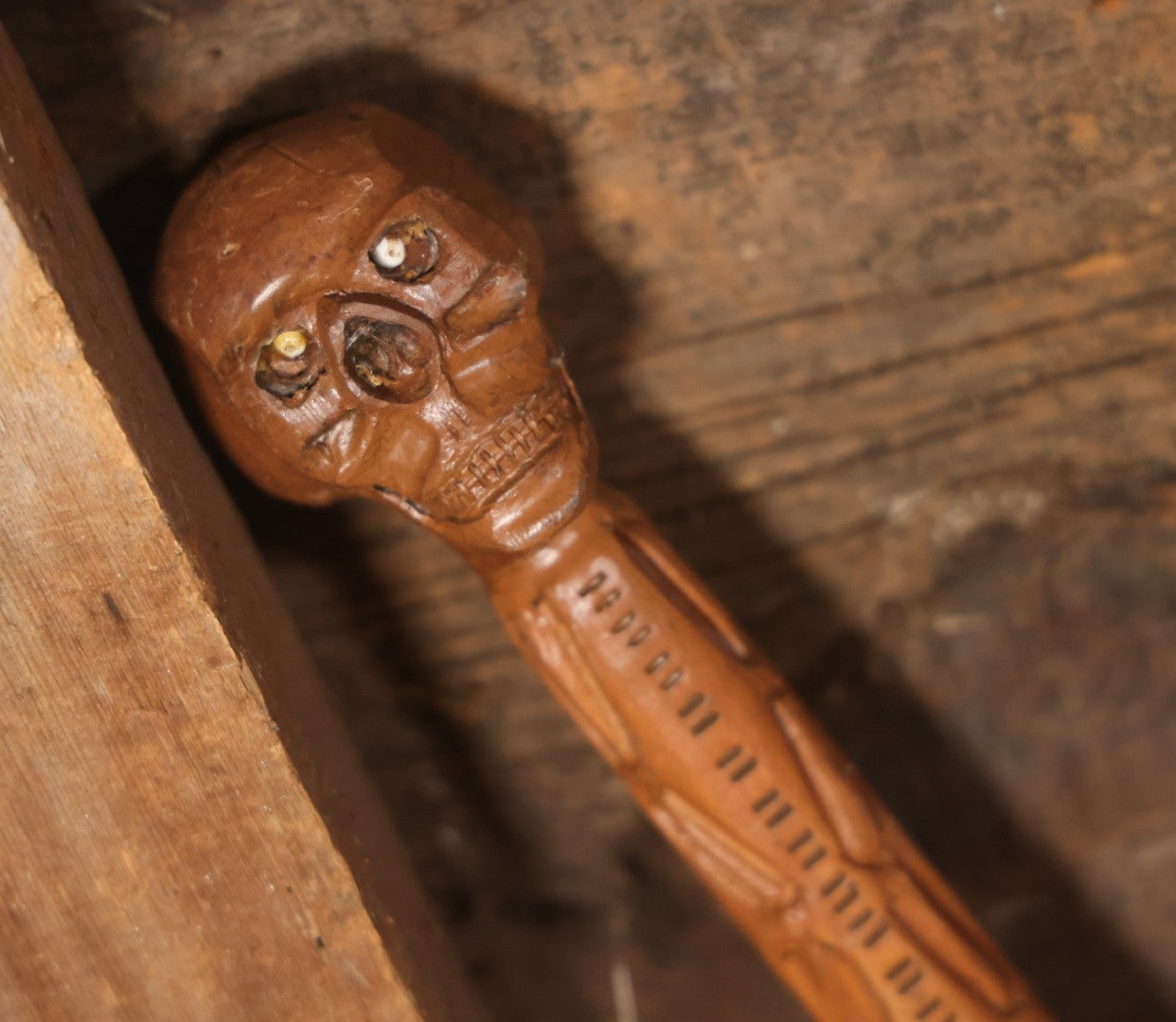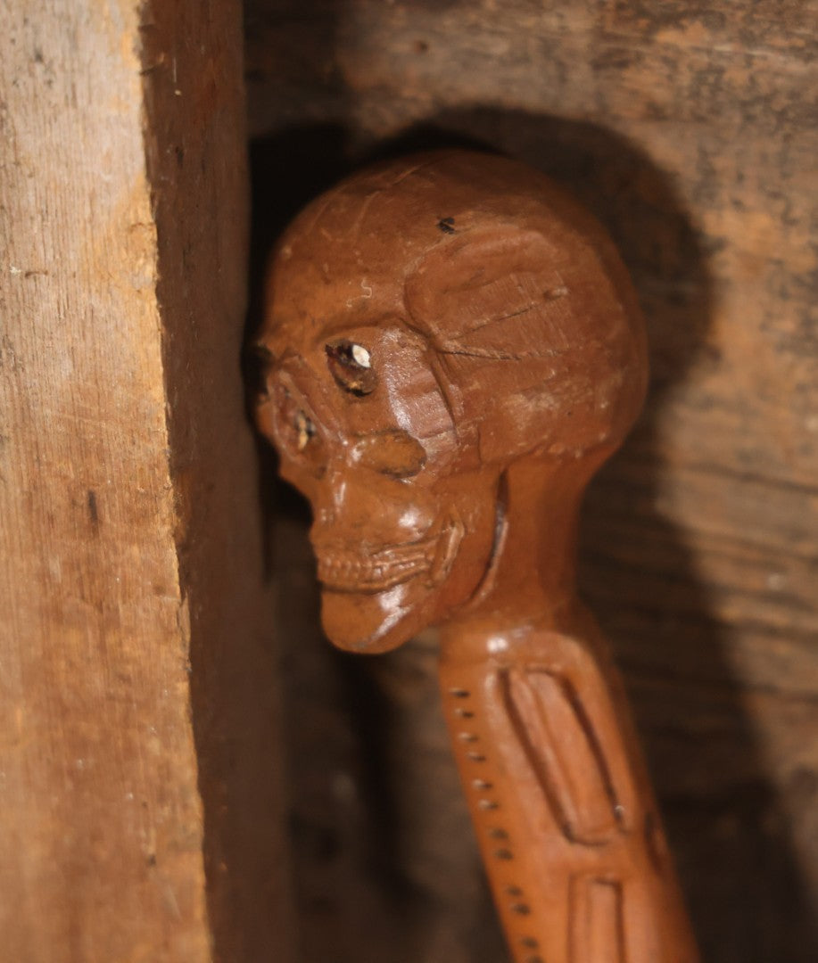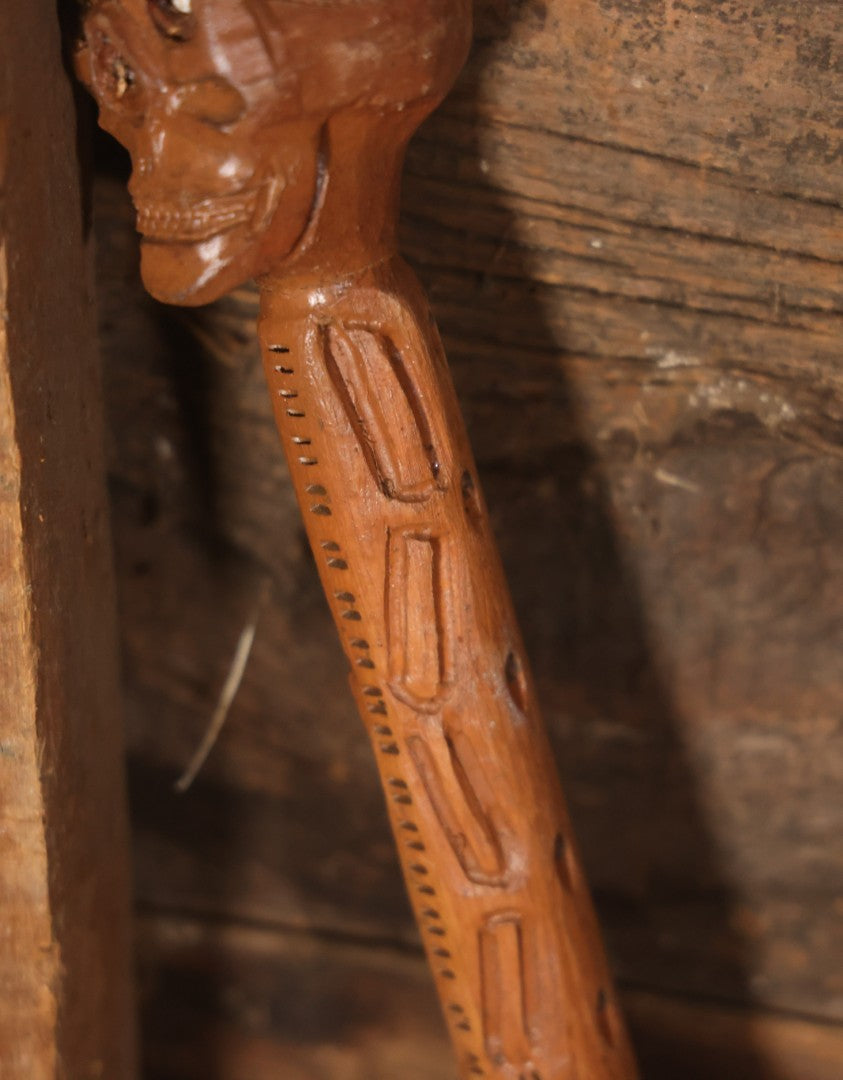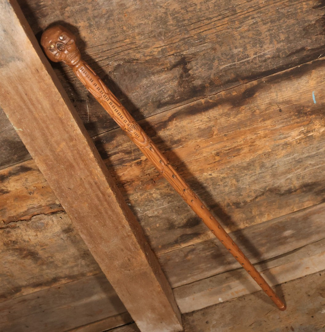 Vintage Folk Art Hand Carved Skeleton Walking Stick, With Skull With Beaded Eyes, Skeleton Body Carved Along Length, Copper Tip, Artist Signed R.A.M., 34" Length