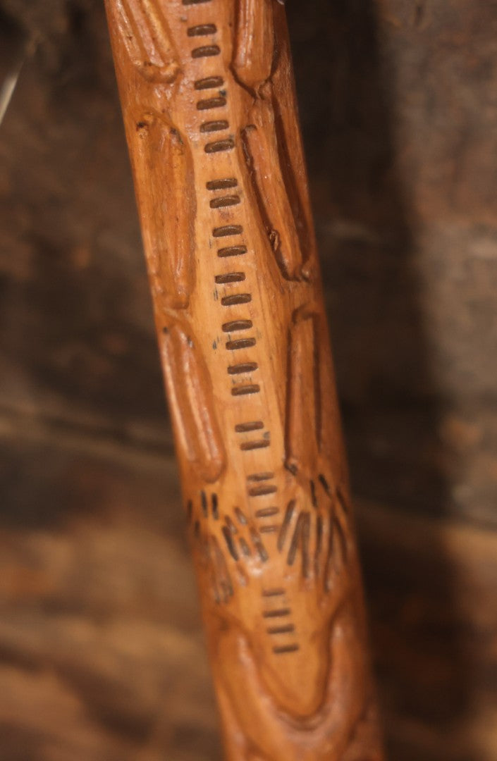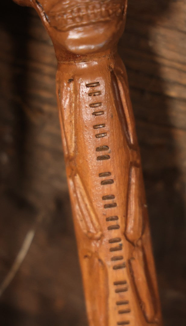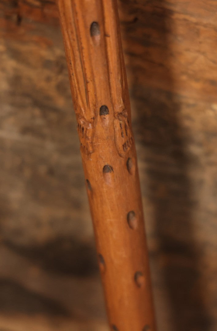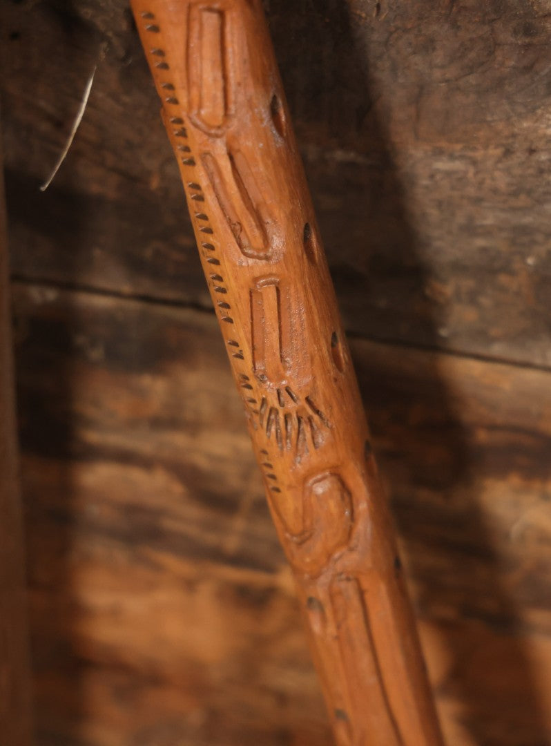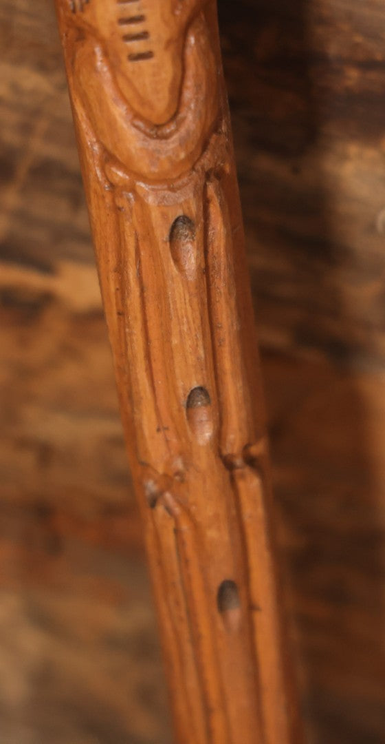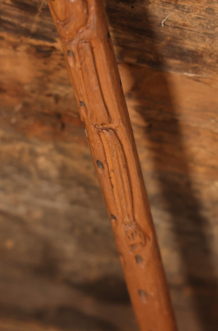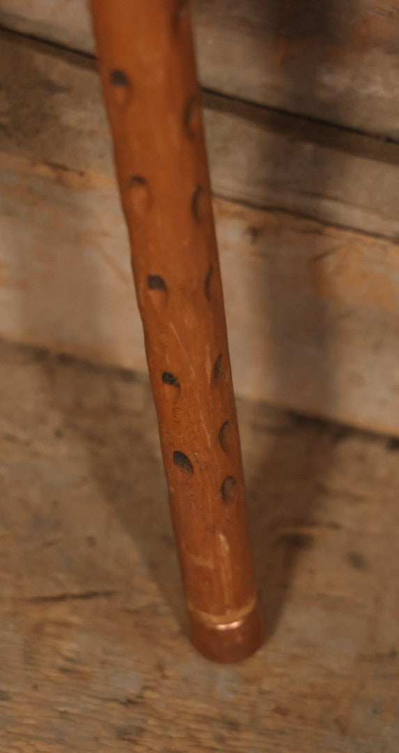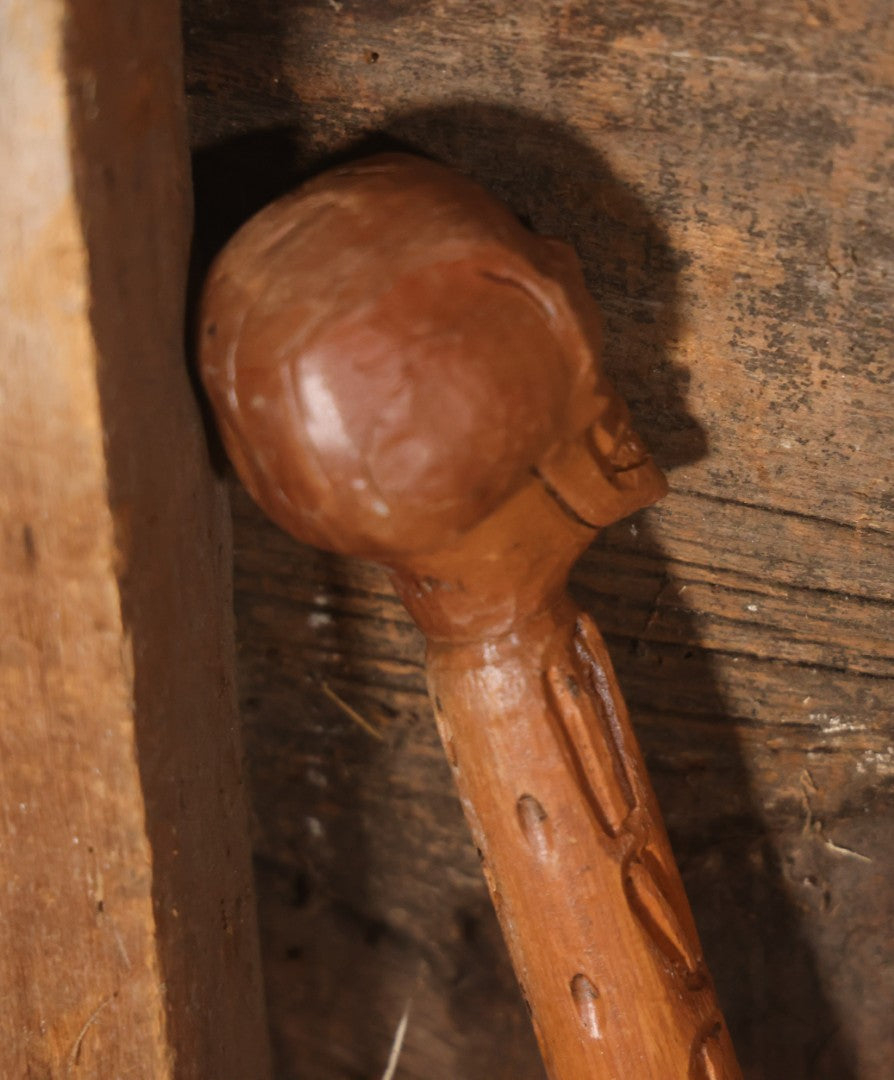 Vintage Folk Art Hand Carved Skeleton Walking Stick, With Skull With Beaded Eyes, Skeleton Body Carved Along Length, Copper Tip, Artist Signed R.A.M., 34" Length