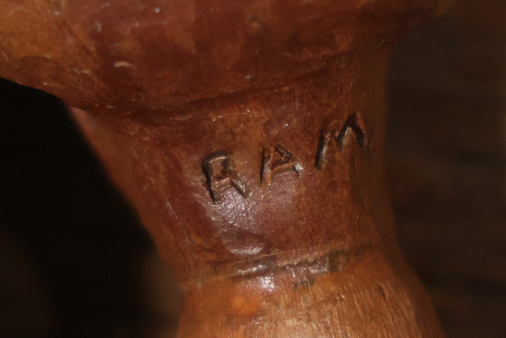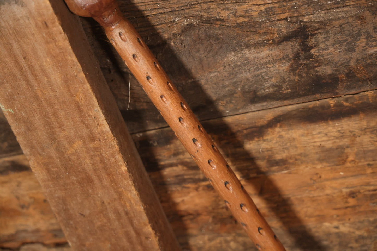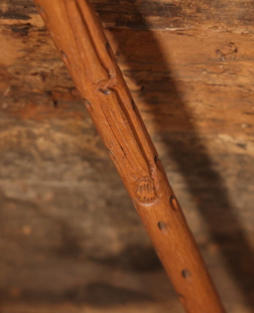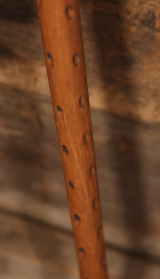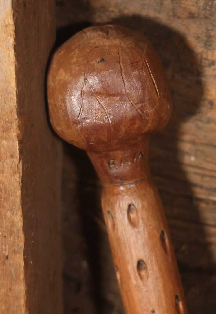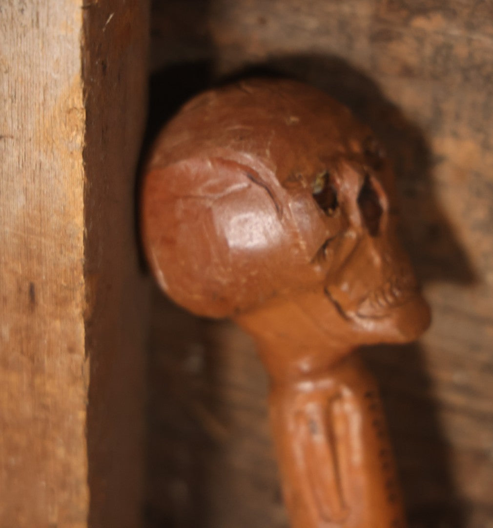 Vintage Folk Art Hand Carved Skeleton Walking Stick, With Skull With Beaded Eyes, Skeleton Body Carved Along Length, Copper Tip, Artist Signed R.A.M., 34" Length