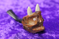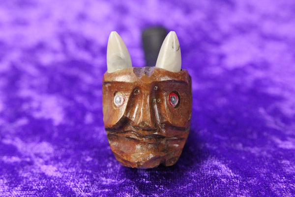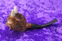 Here is a vintage hand carved tobacco pipe in the likeness of a horned devil, imported from Italy. It is in good, likely never used condition. It has one red eye and one white eye marbled resin horns. It measures 4.5" in length.