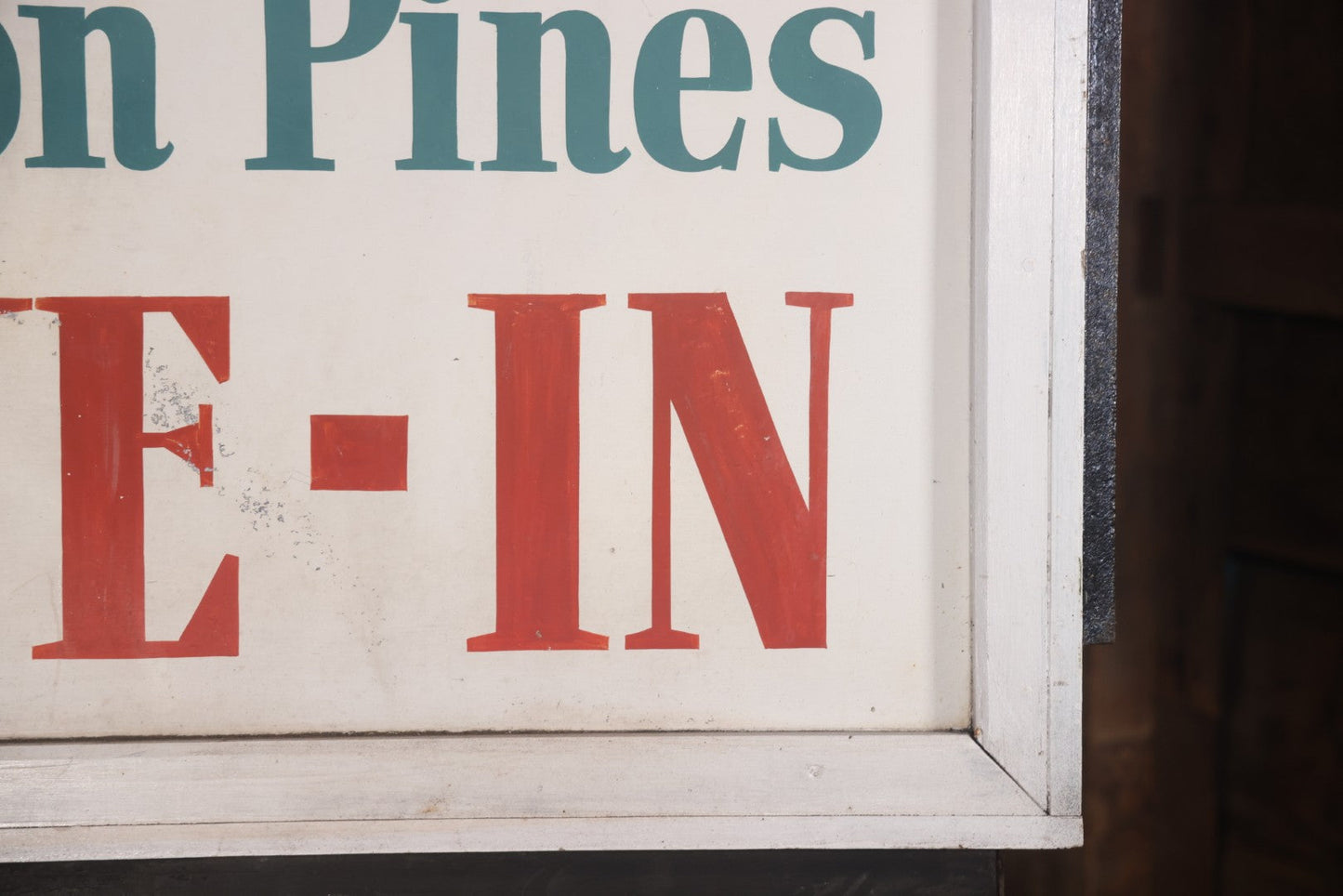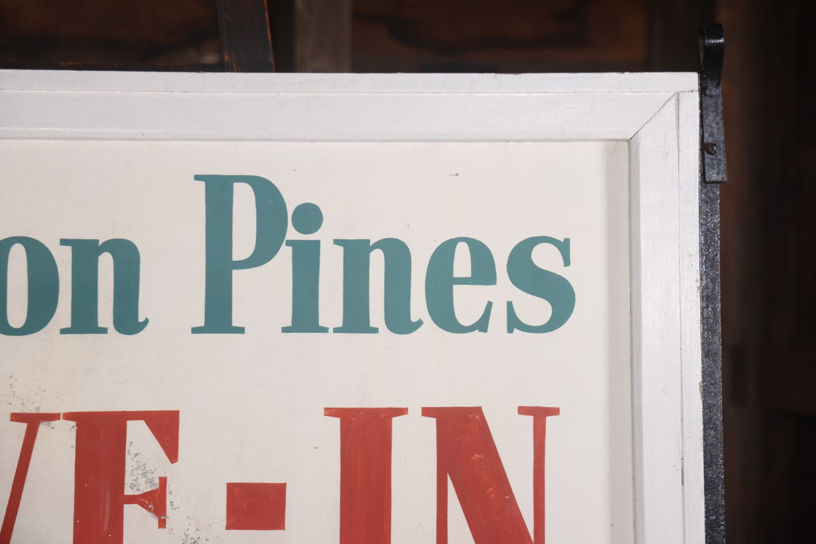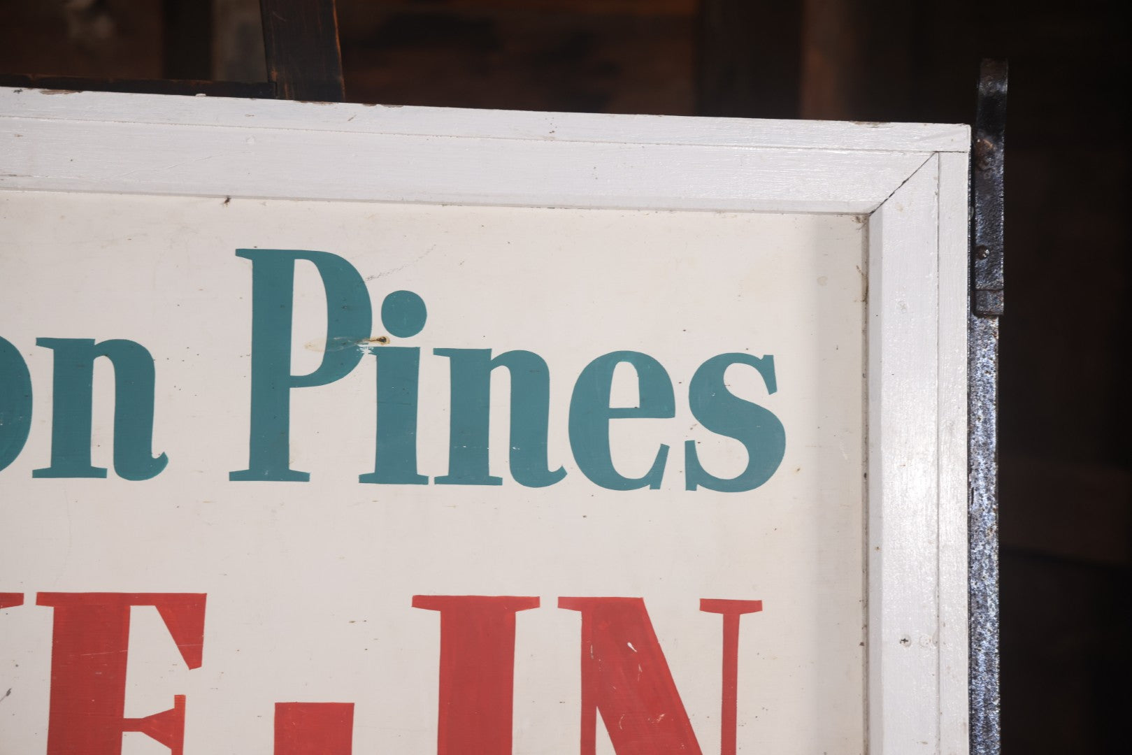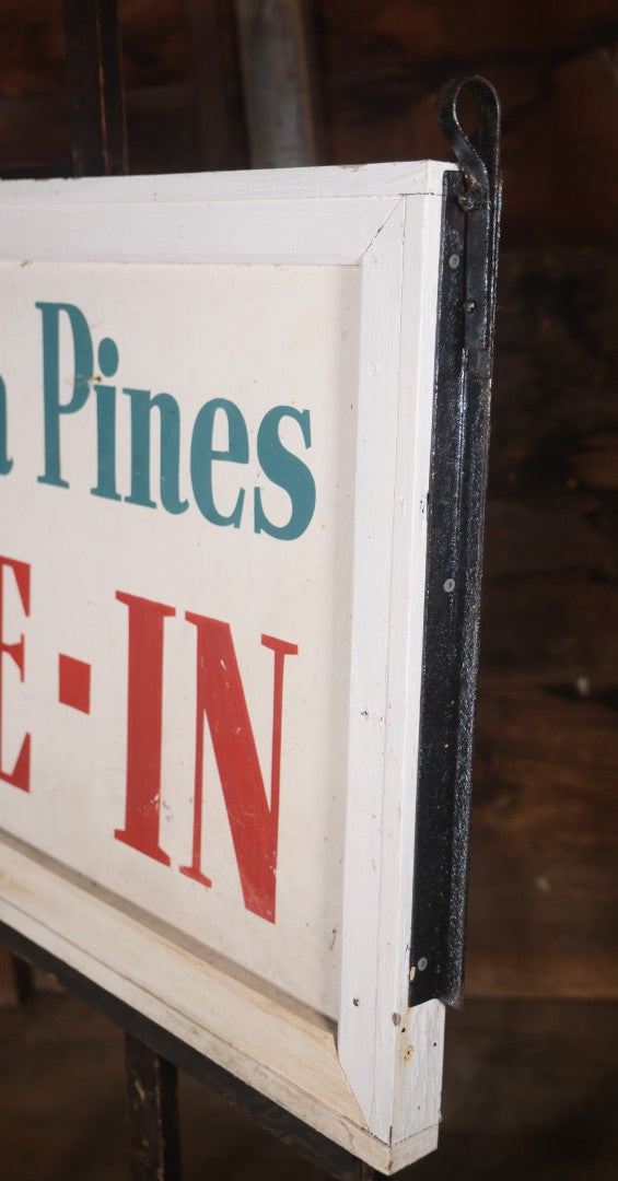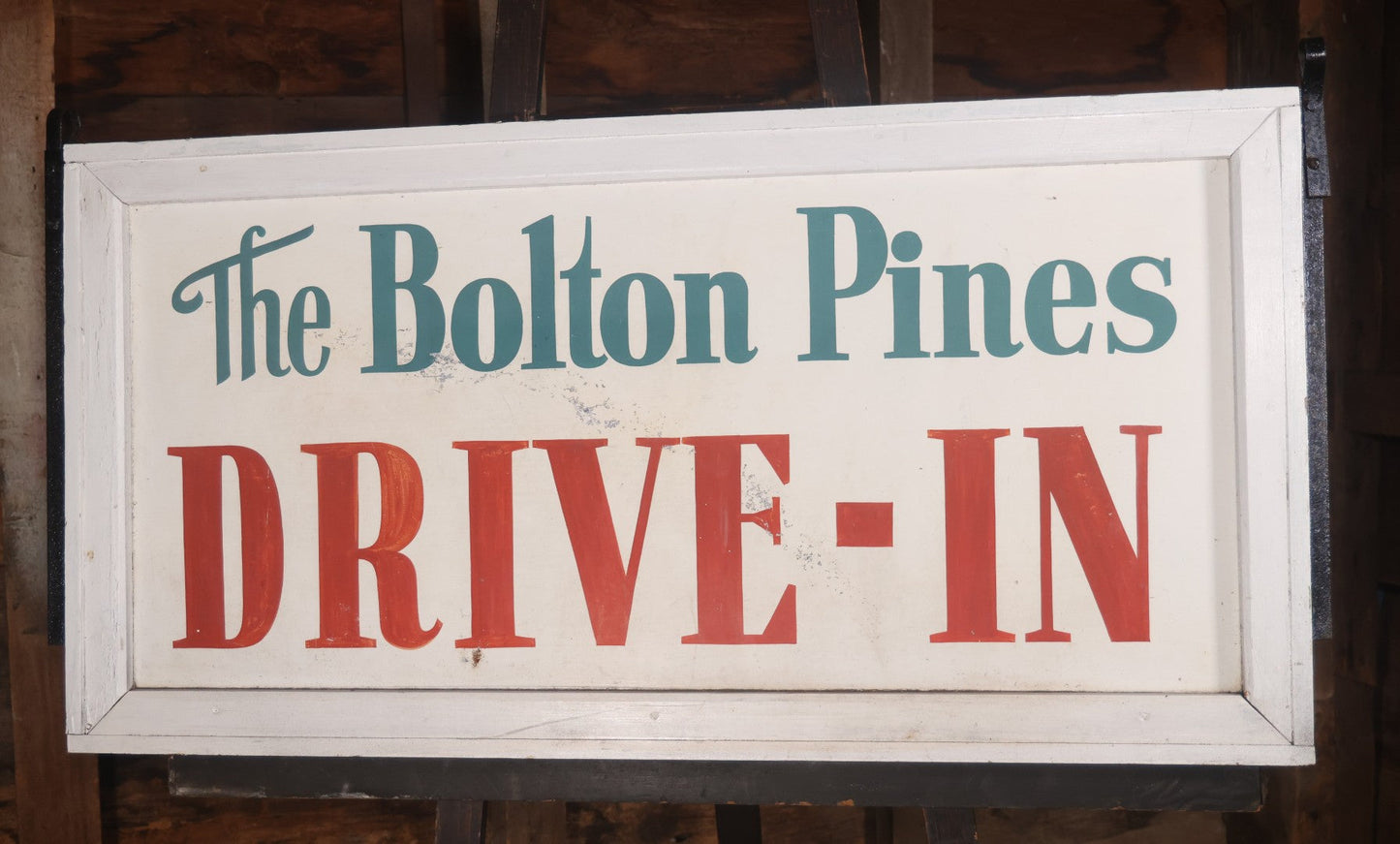 Vintage Hand Painted Sign For "The Bolton Pines Drive-In" Movie Theater, On Tin With Wood Frame, Cast Iron Hangers, Unknown Origin, Likely From New England, 52-1/2" x 27-3/4"