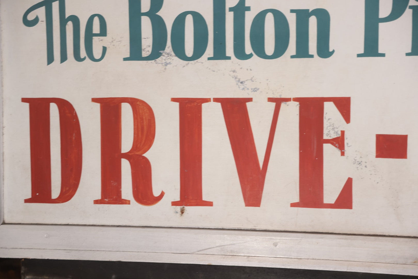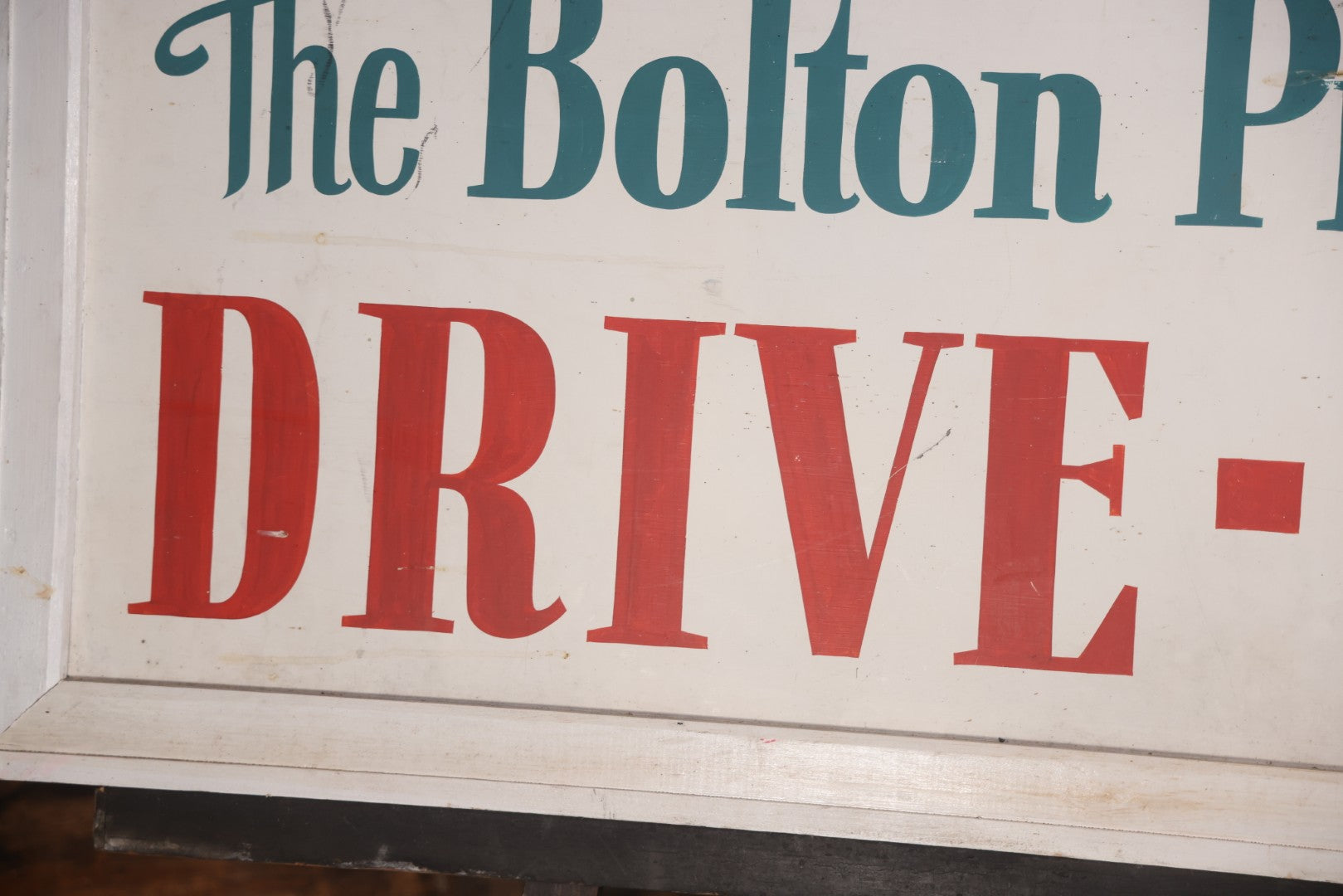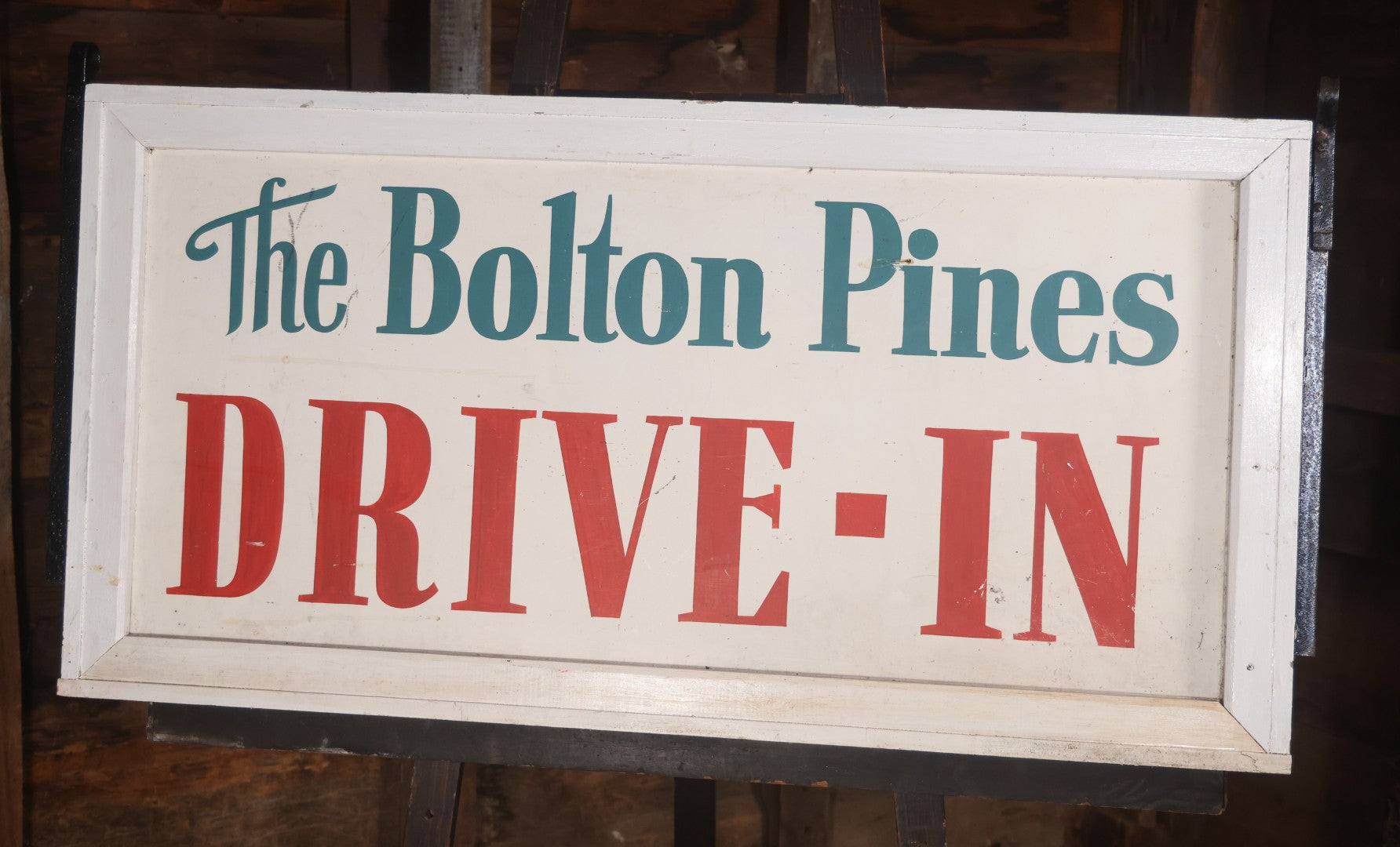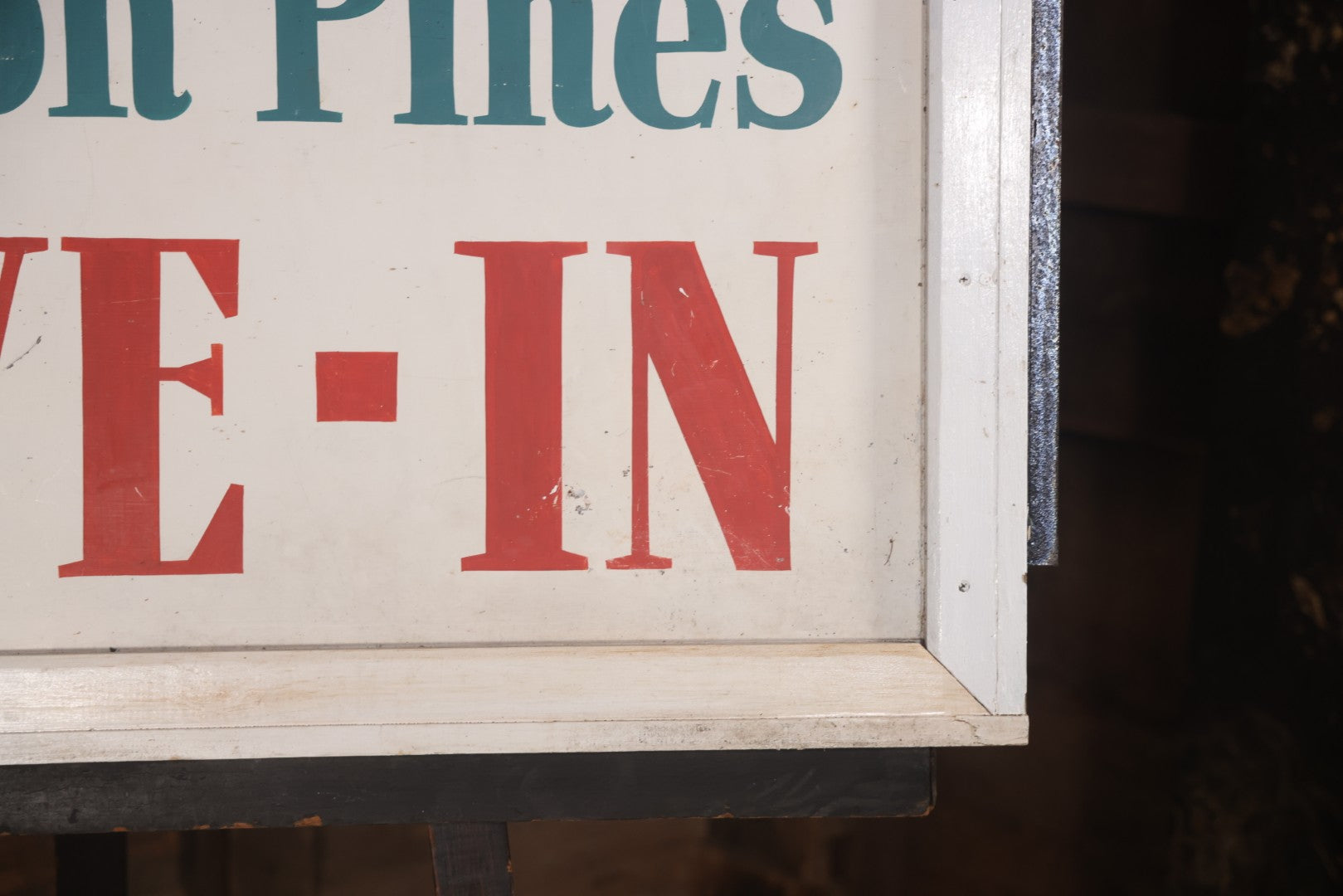 Vintage Hand Painted Sign For "The Bolton Pines Drive-In" Movie Theater, On Tin With Wood Frame, Cast Iron Hangers, Unknown Origin, Likely From New England, 52-1/2" x 27-3/4"