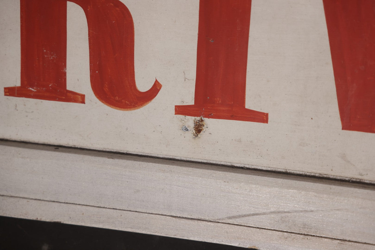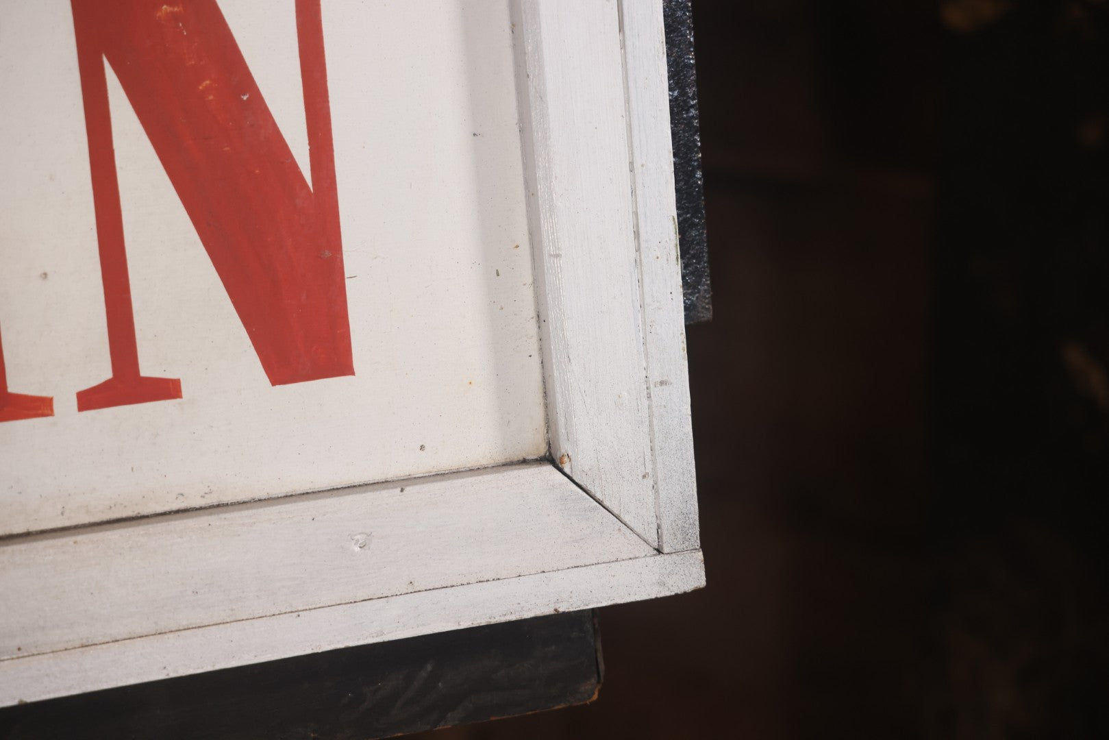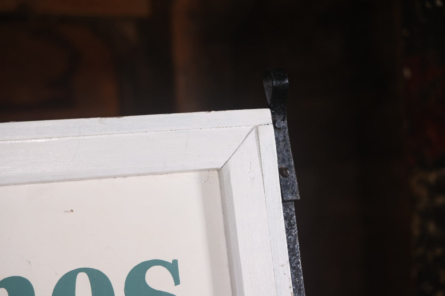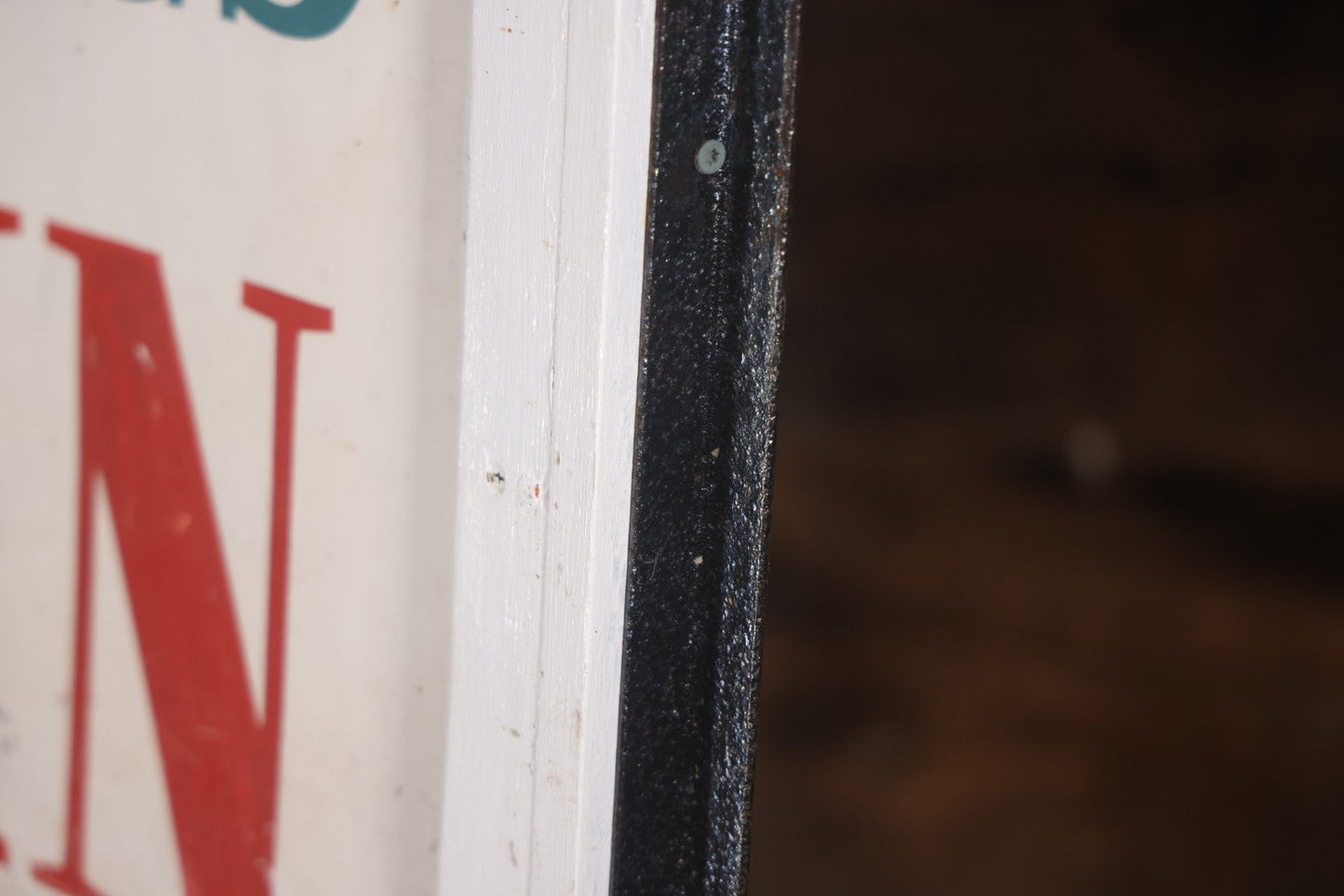Vintage sign on tin with wood frame. Various losses, stains, and blemishes throughout sign.