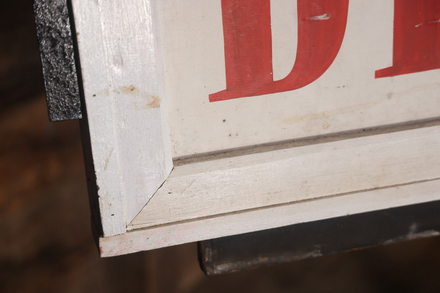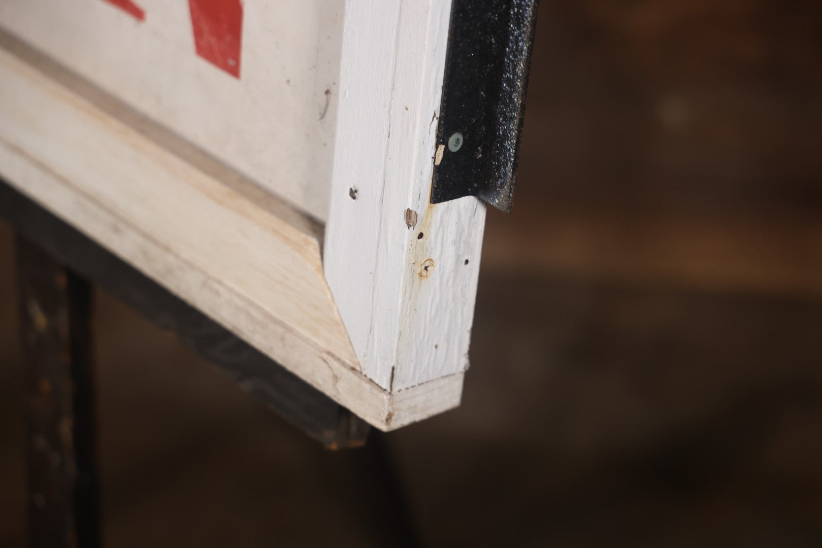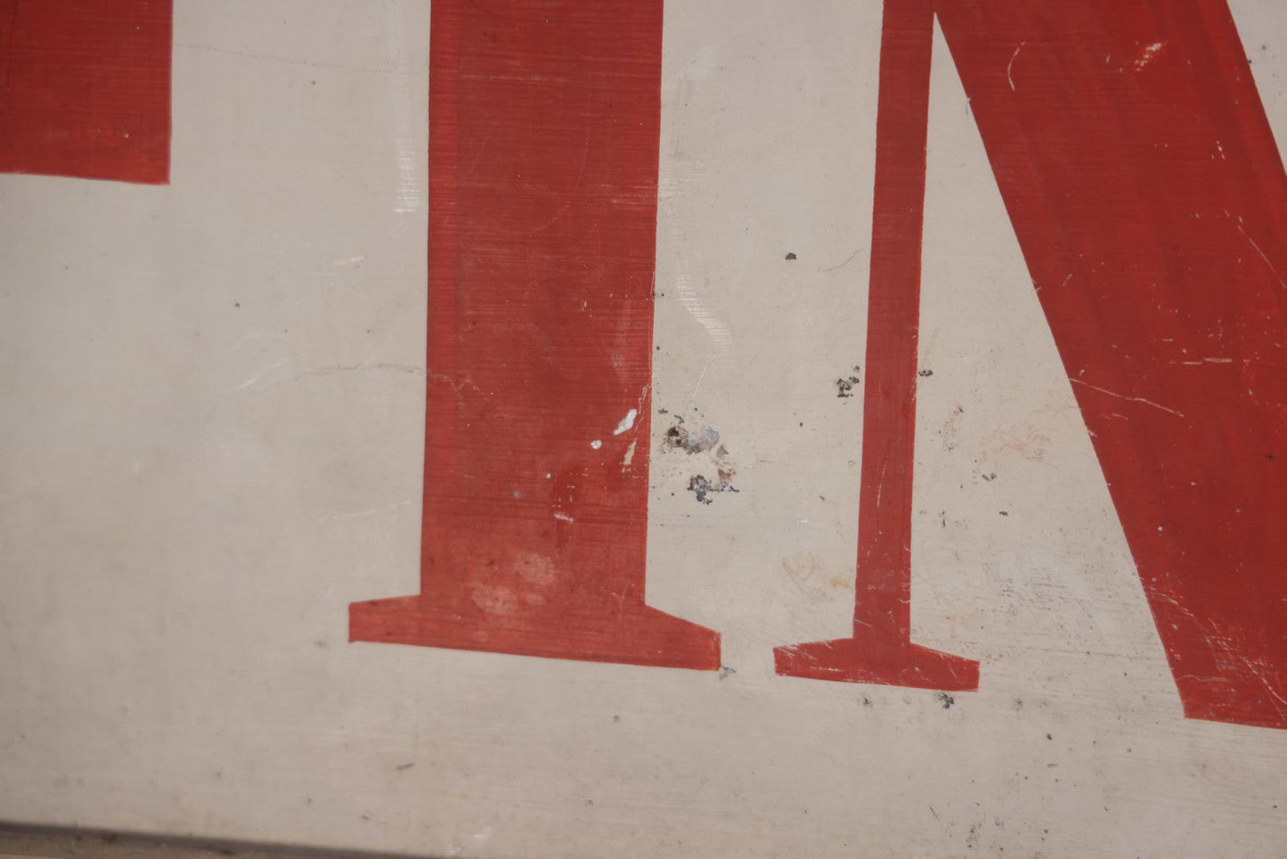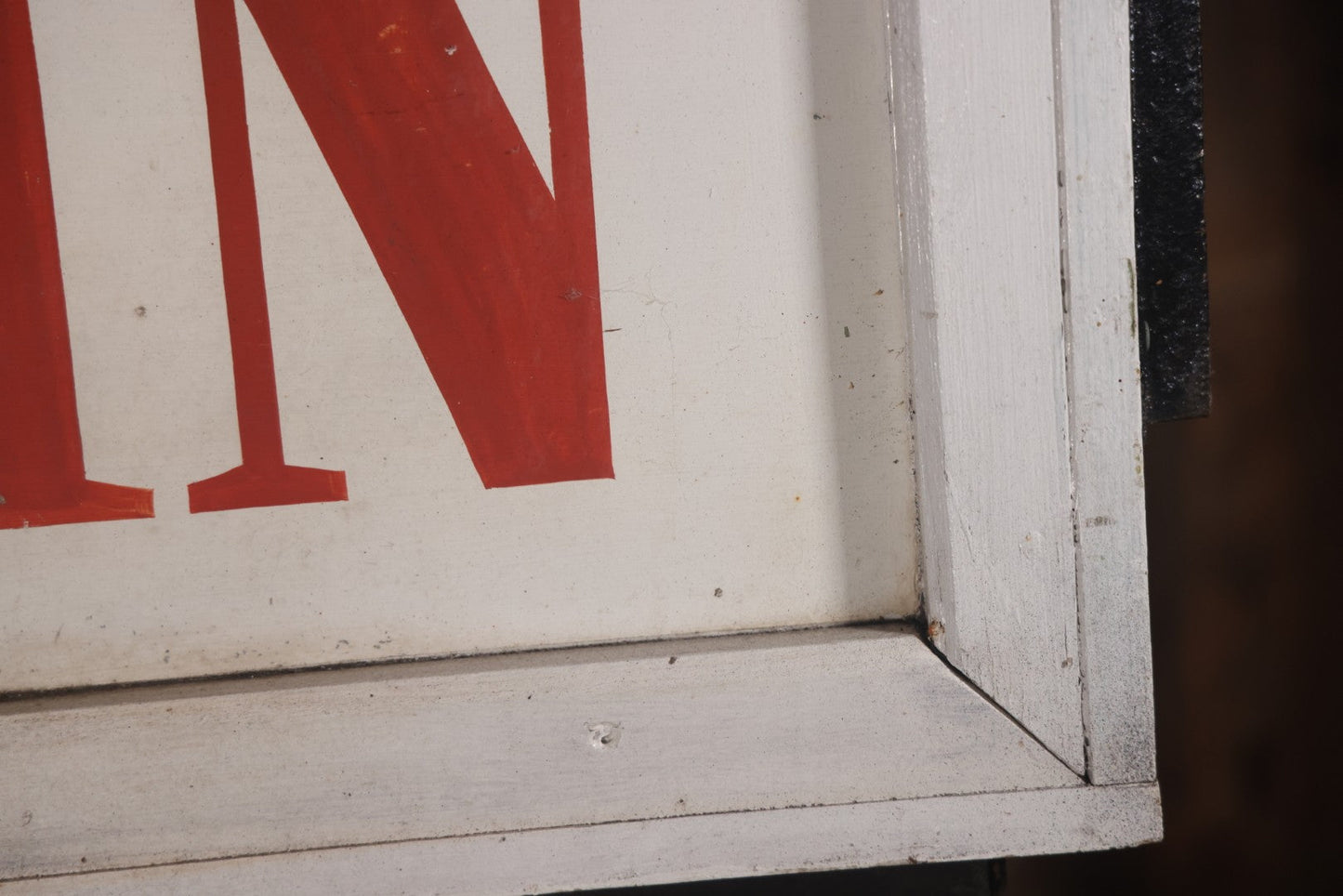 Vintage sign on tin with wood frame. Various losses, stains, and blemishes throughout sign.