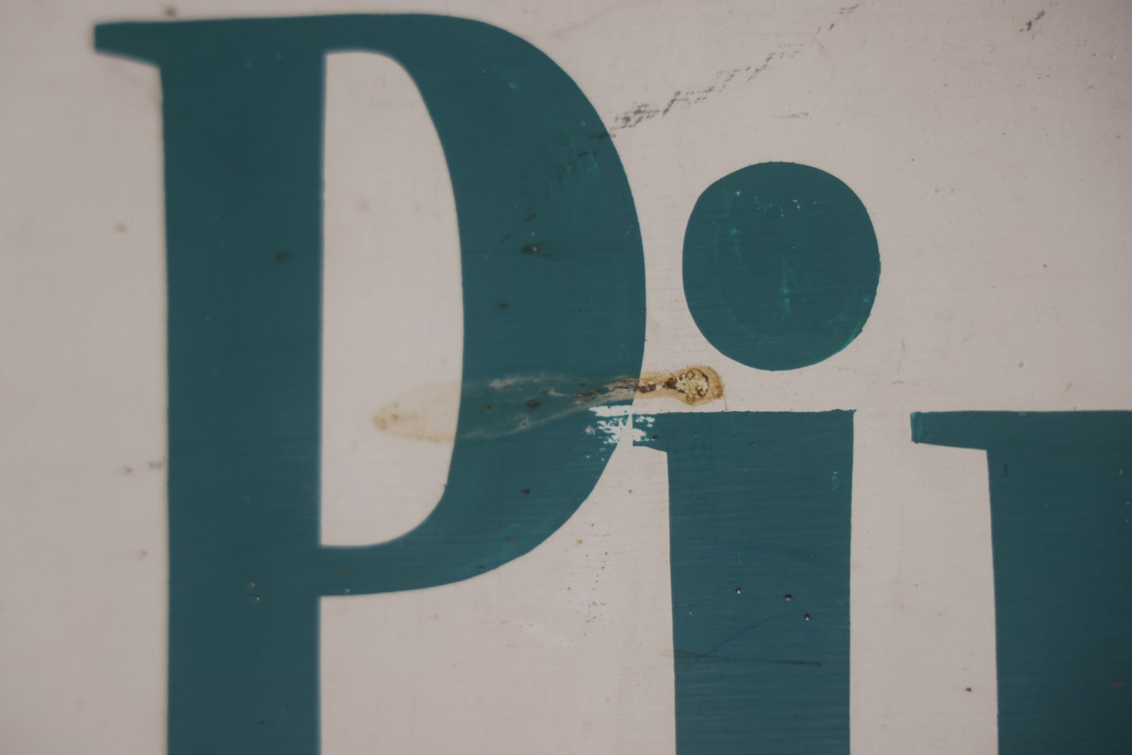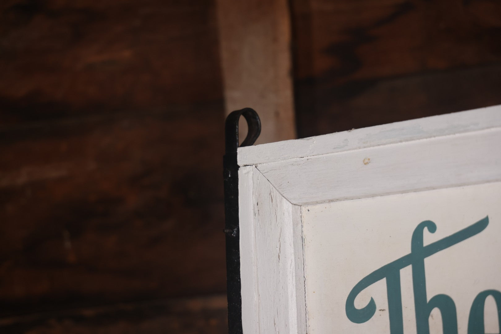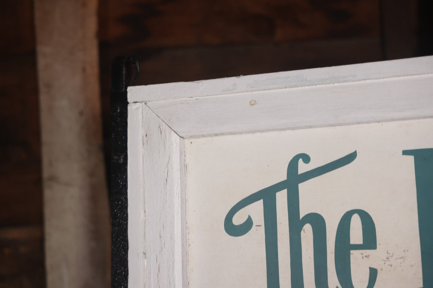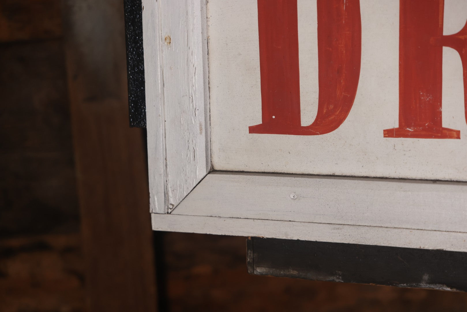 Vintage sign on tin with wood frame. Various losses, stains, and blemishes throughout sign.