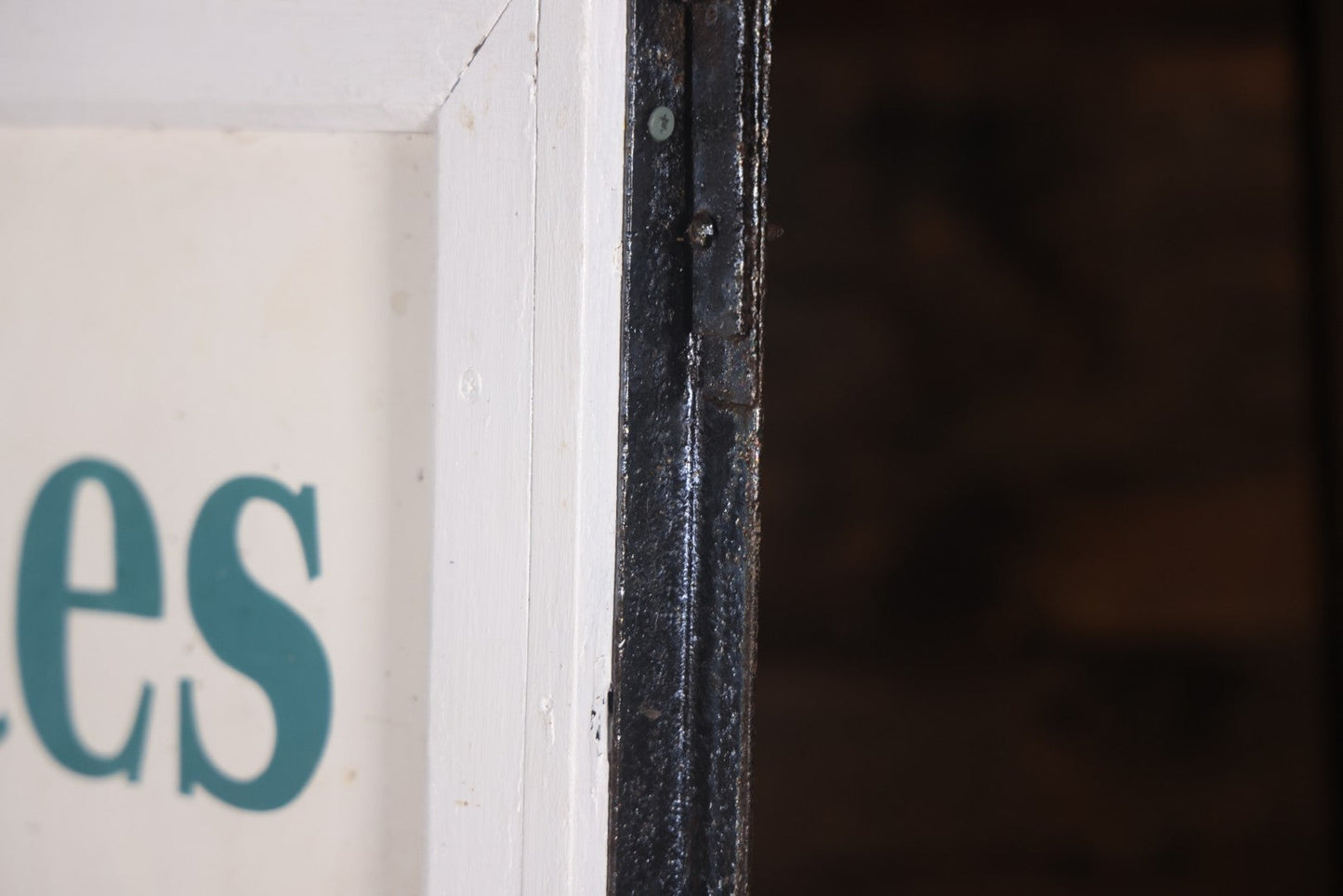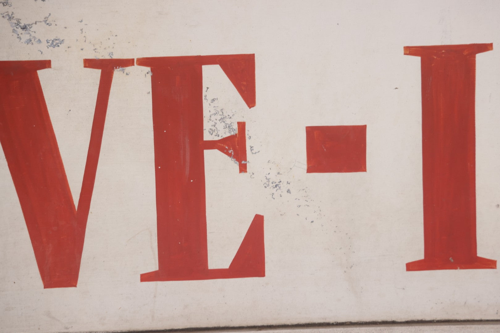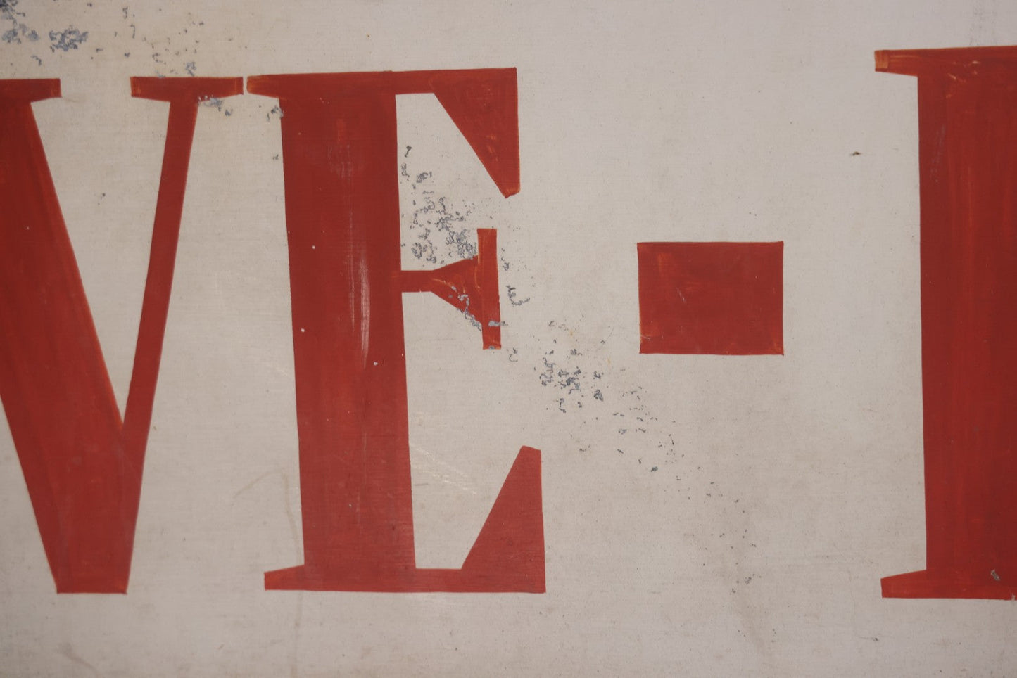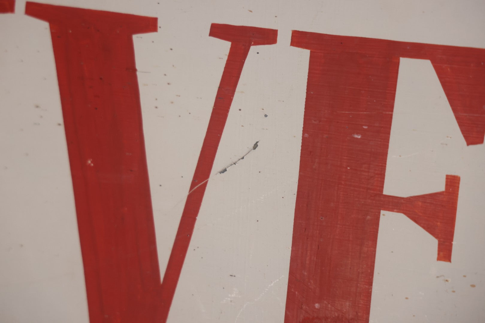 Vintage sign on tin with wood frame. Various losses, stains, and blemishes throughout sign.