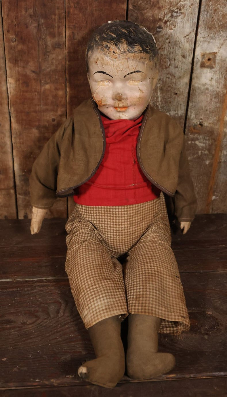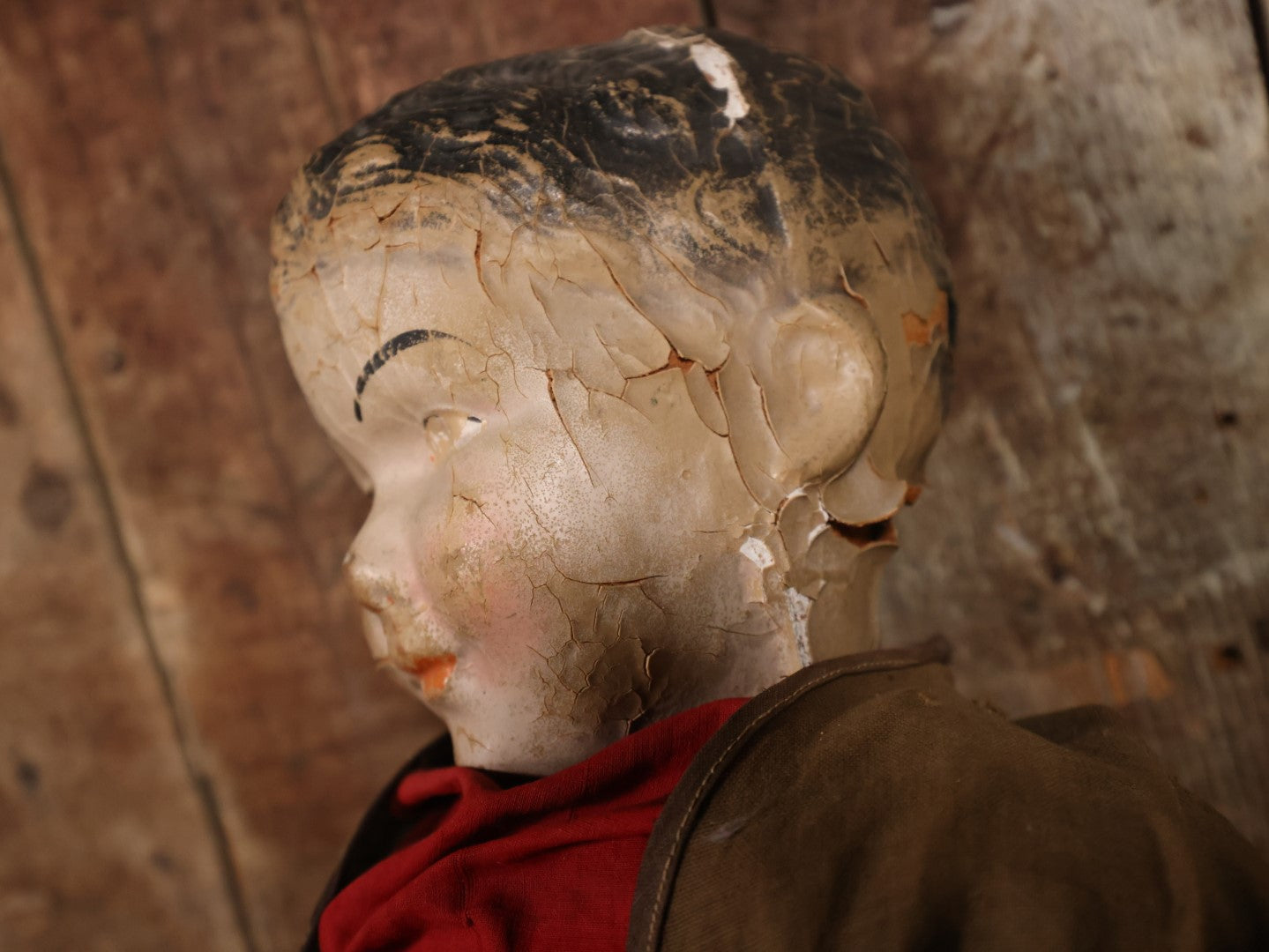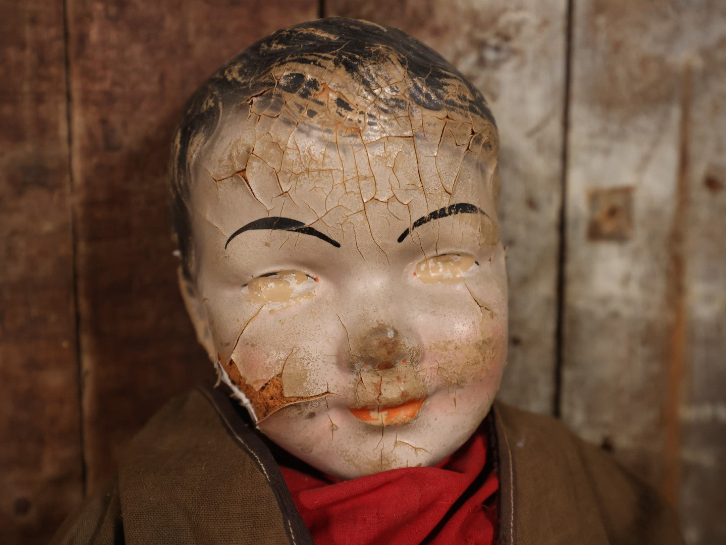 Vintage Large Size Composition Little Boy Doll With Clothes, Crackly Wear, Creepy Doll, With Hole In Head