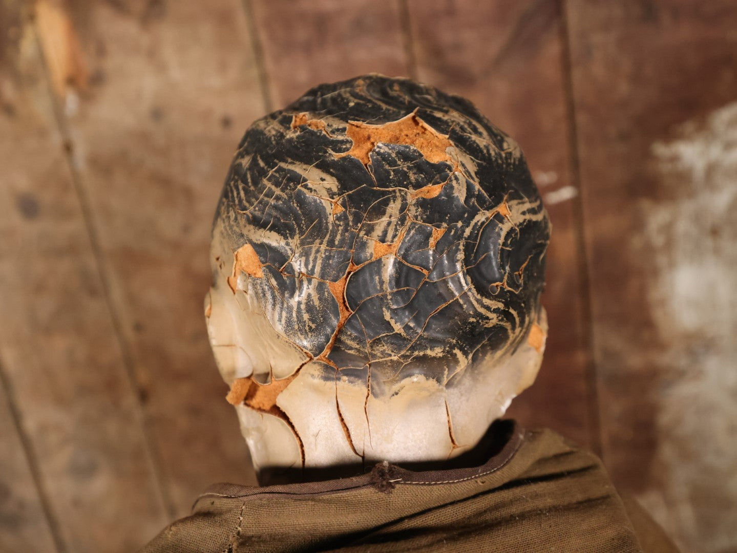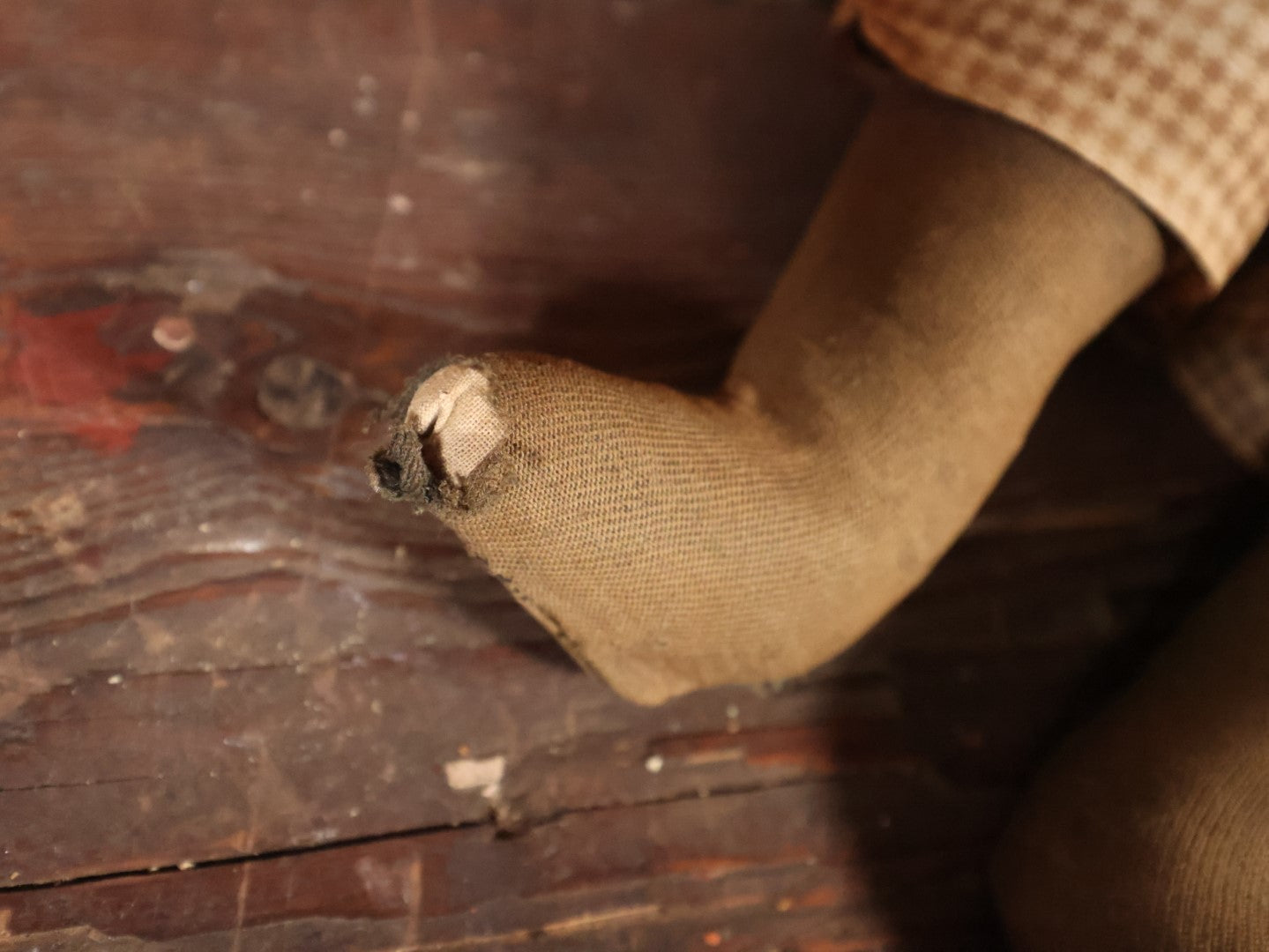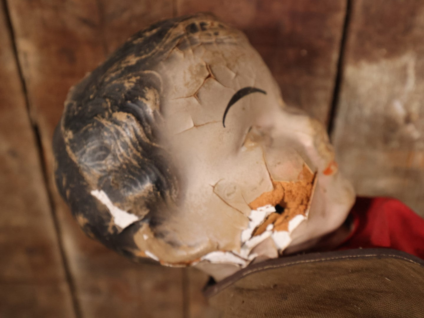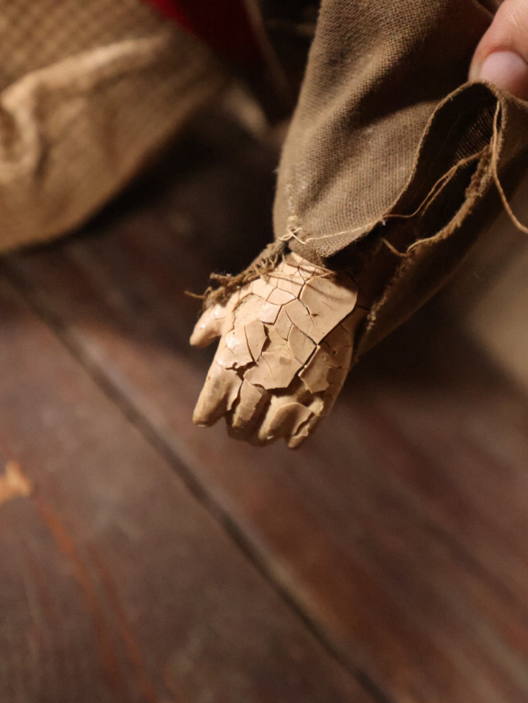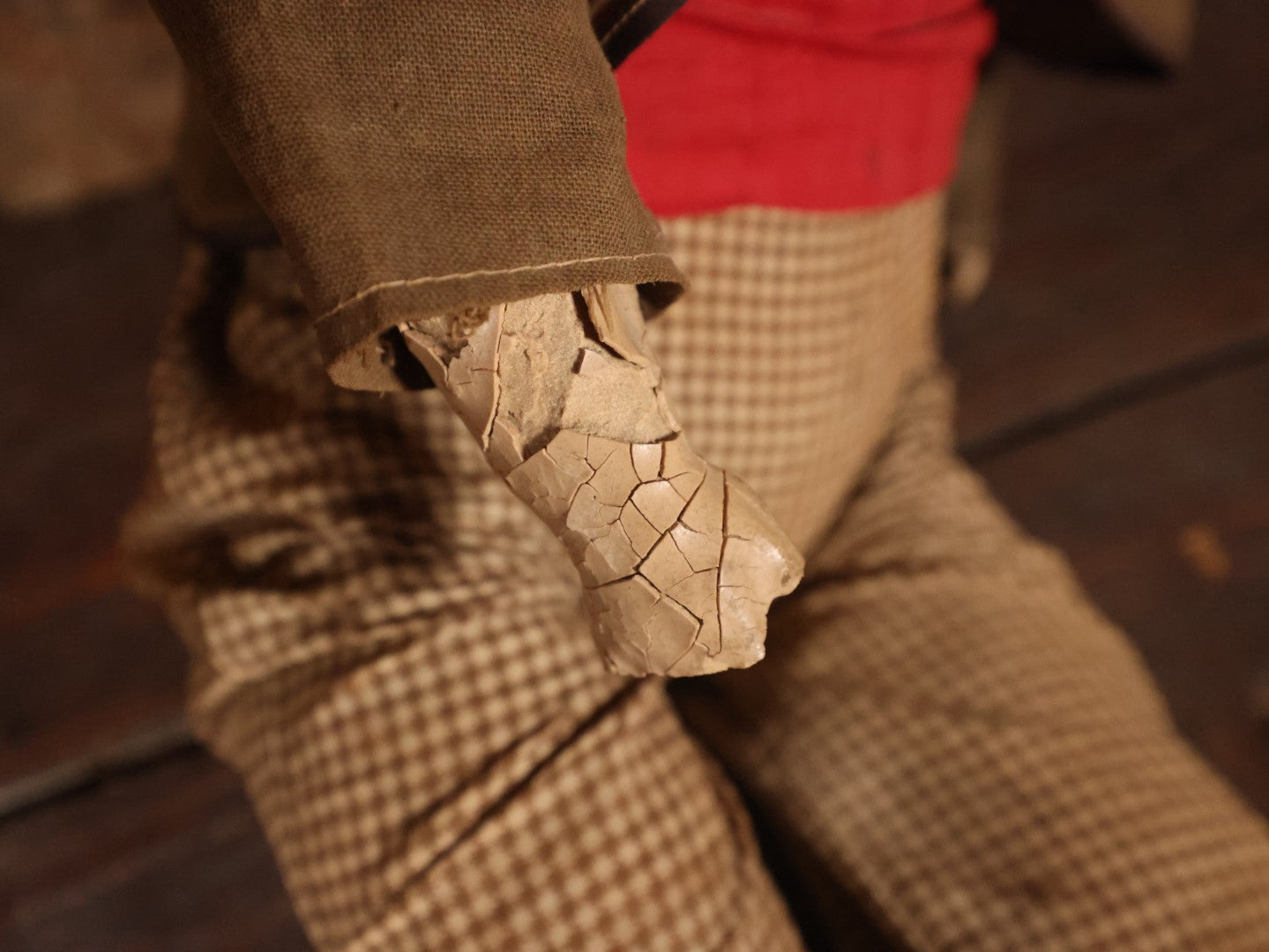 Severe wear and tear throughout, significant cracking and holes in composition, tears in cloth and clothes, as-is for display