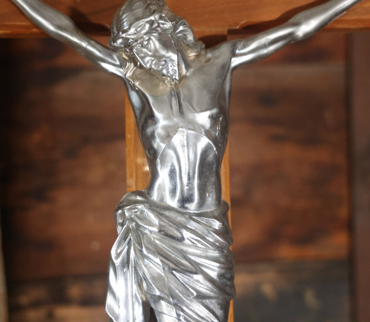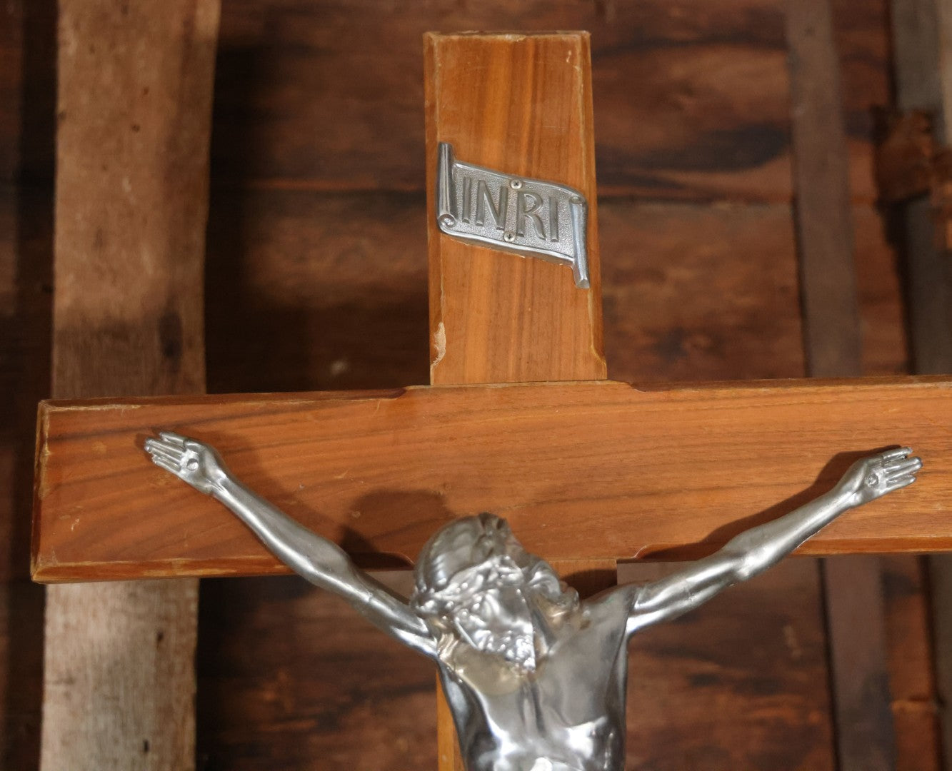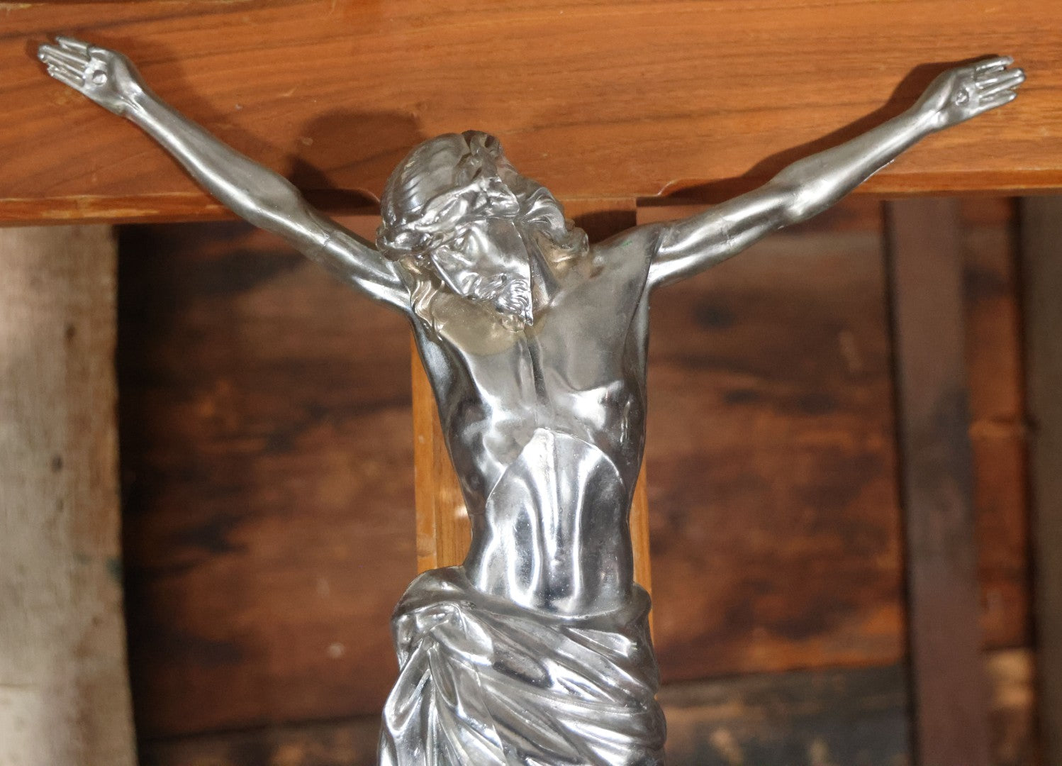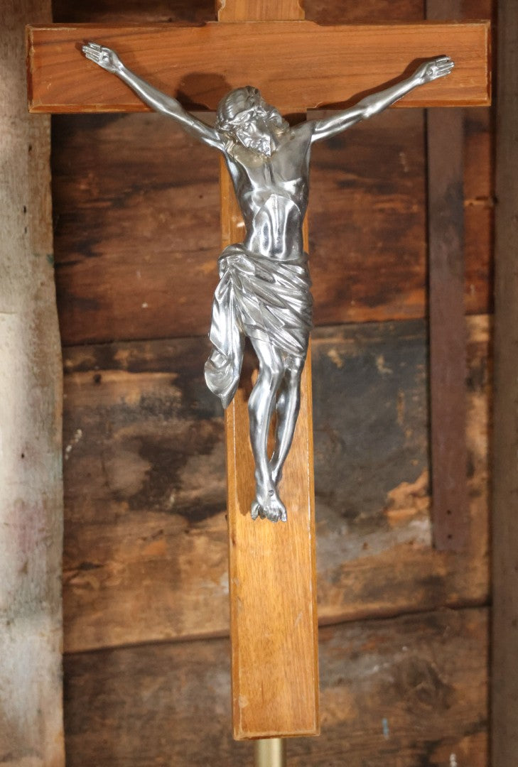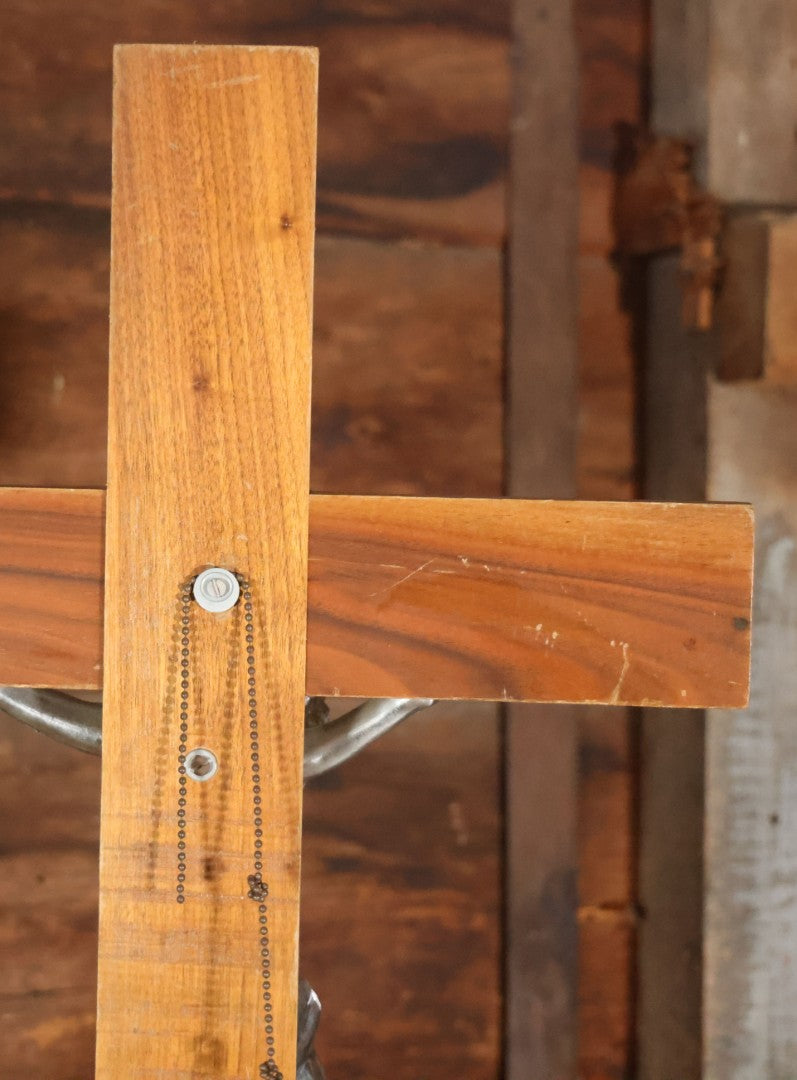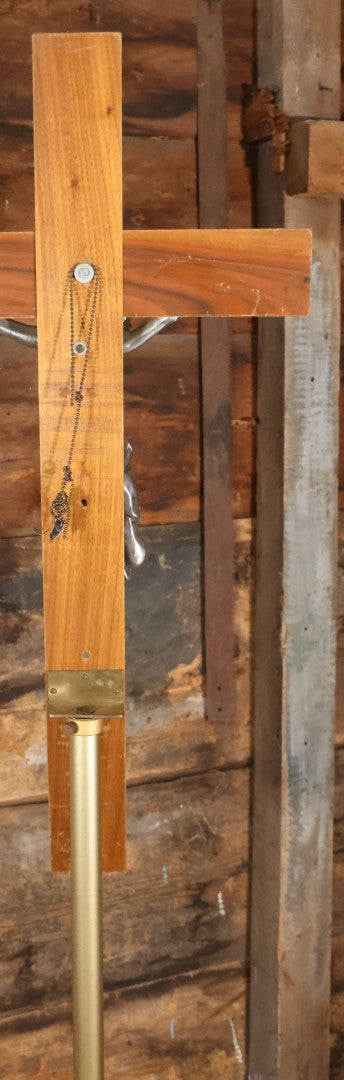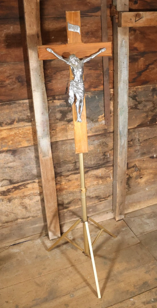 Various wear and tear. Crucifix hardware loosening slightly. Sold together. Dimensions are of crucifix only, note height of stand is adjustable.