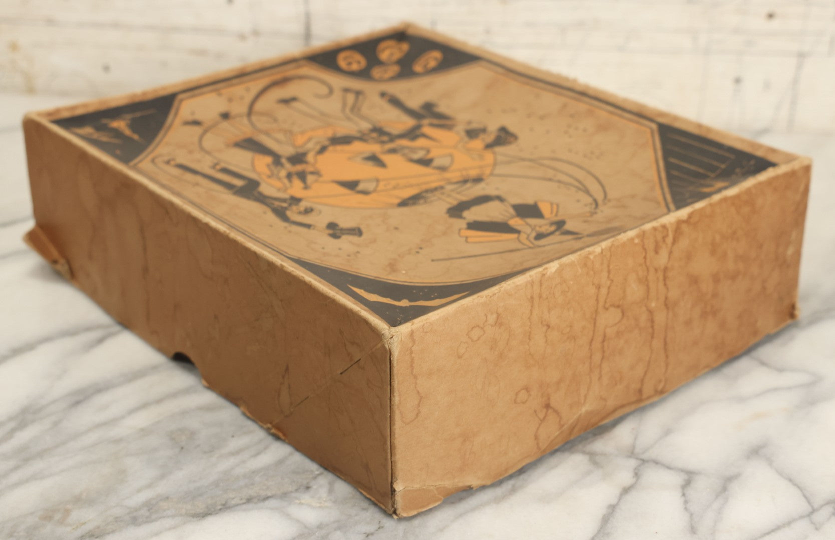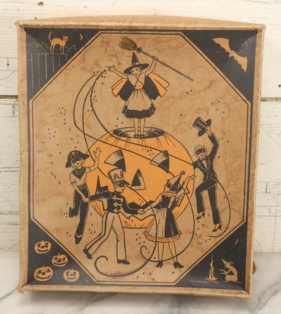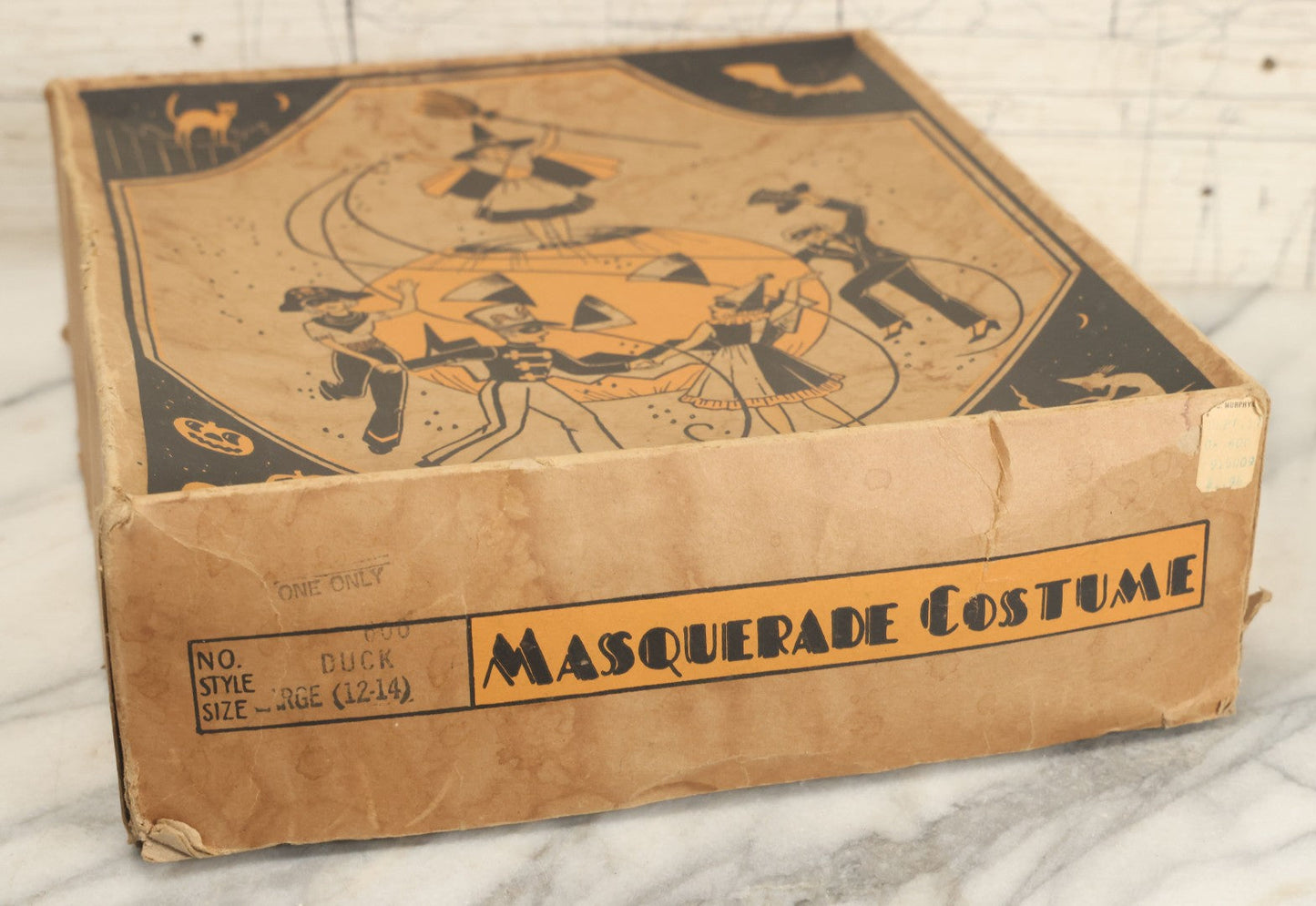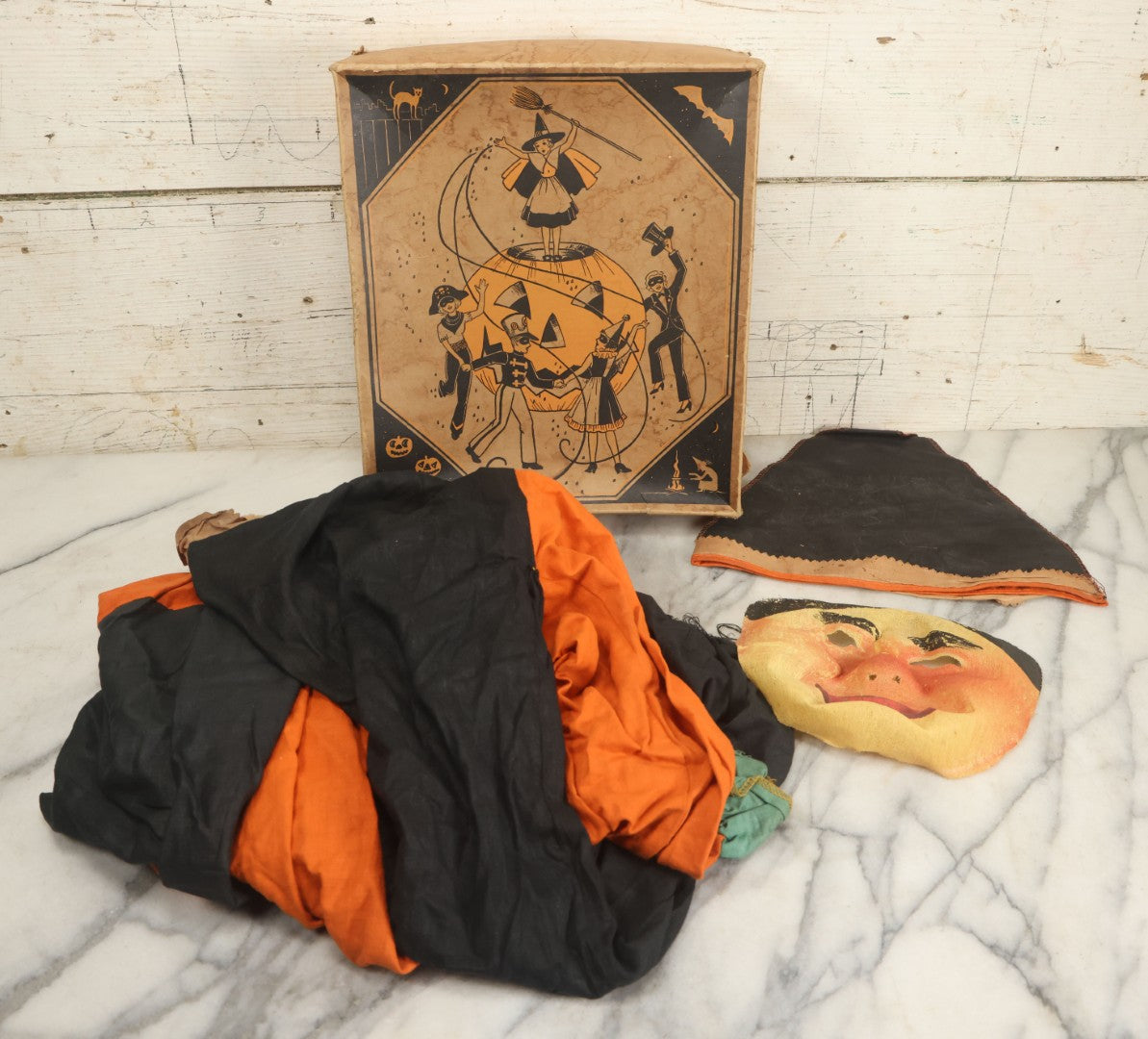 Lot 006 - Vintage Masquerade Halloween Costume In Cardboard Box With Halloween Party, Witch Graphics, Including Mask, Hat, And Costume