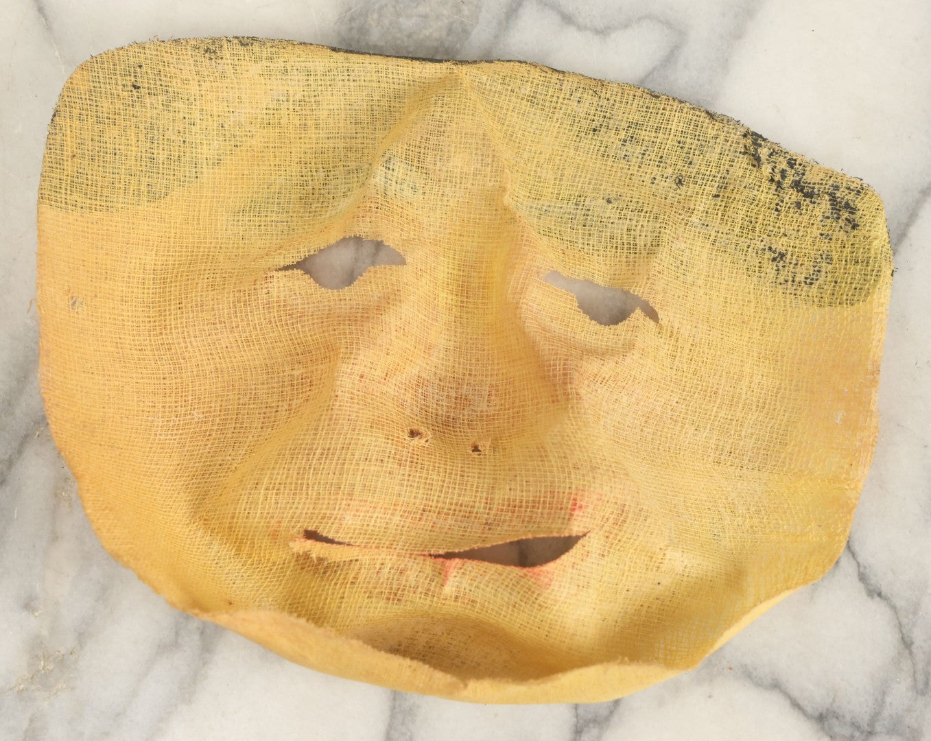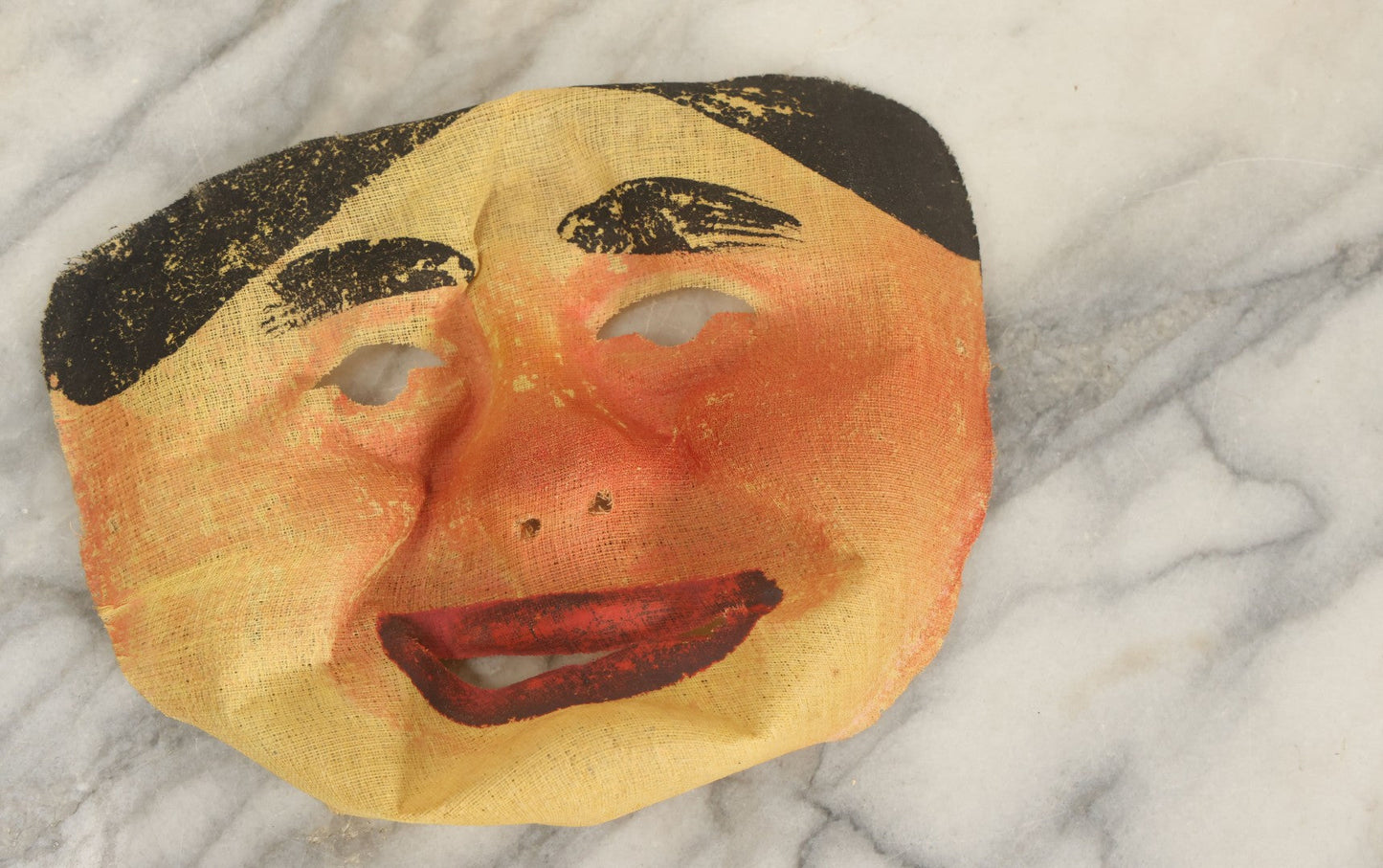 Your absentee bid for Lot 006 - Vintage Masquerade Halloween Costume In Cardboard Box With Halloween Party, Witch Graphics, Including Mask, Hat, And Costume was successfully submitted—thank you for bidding with us!