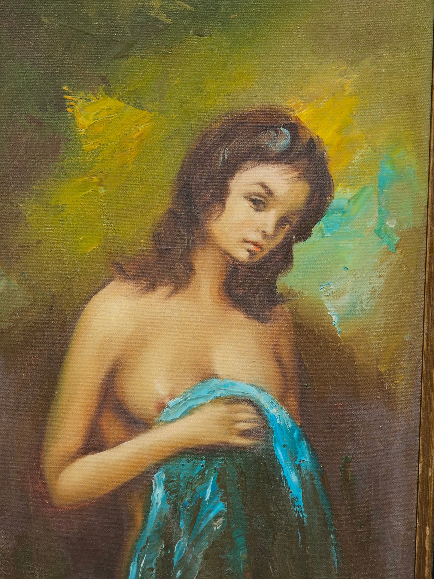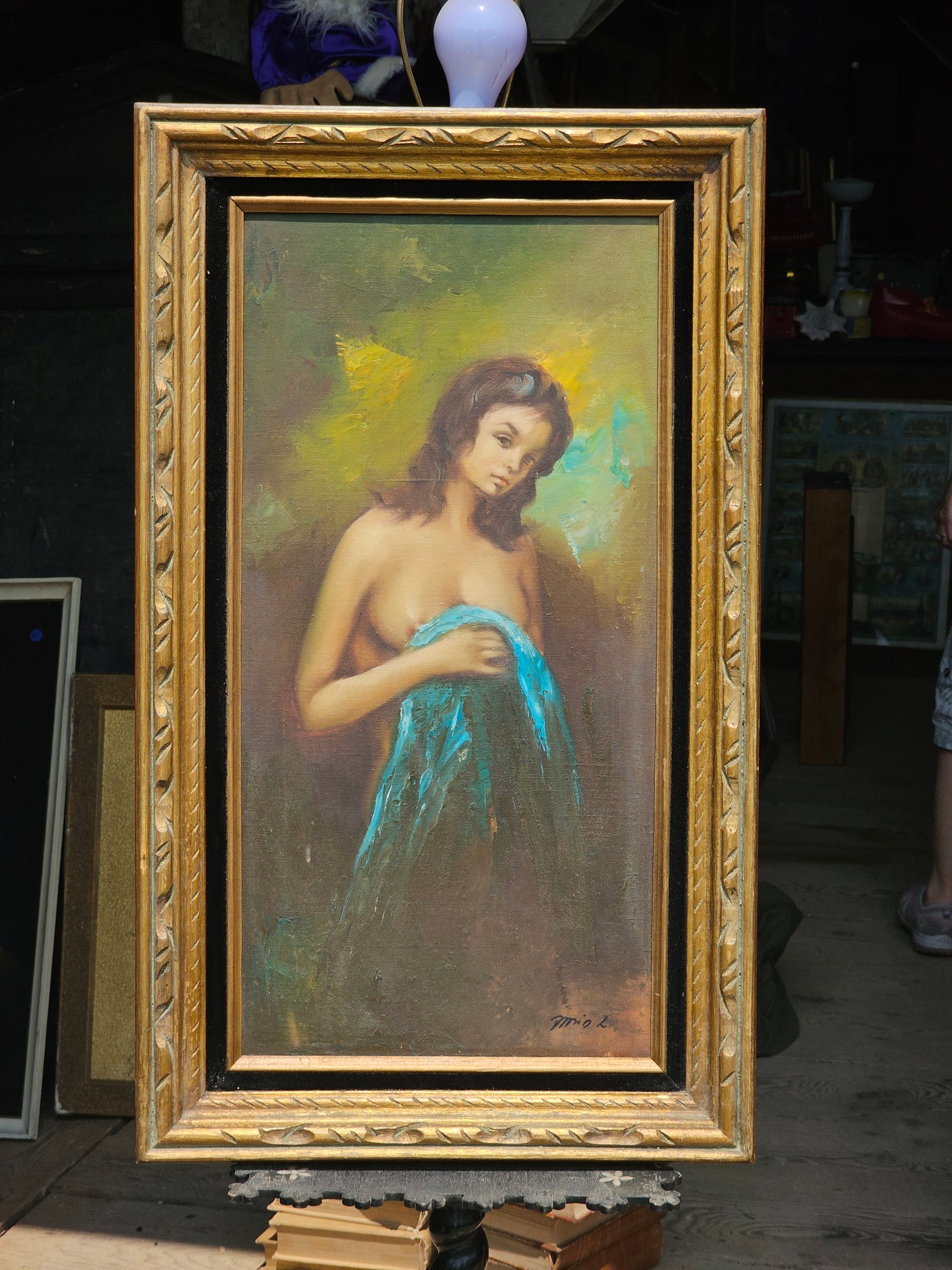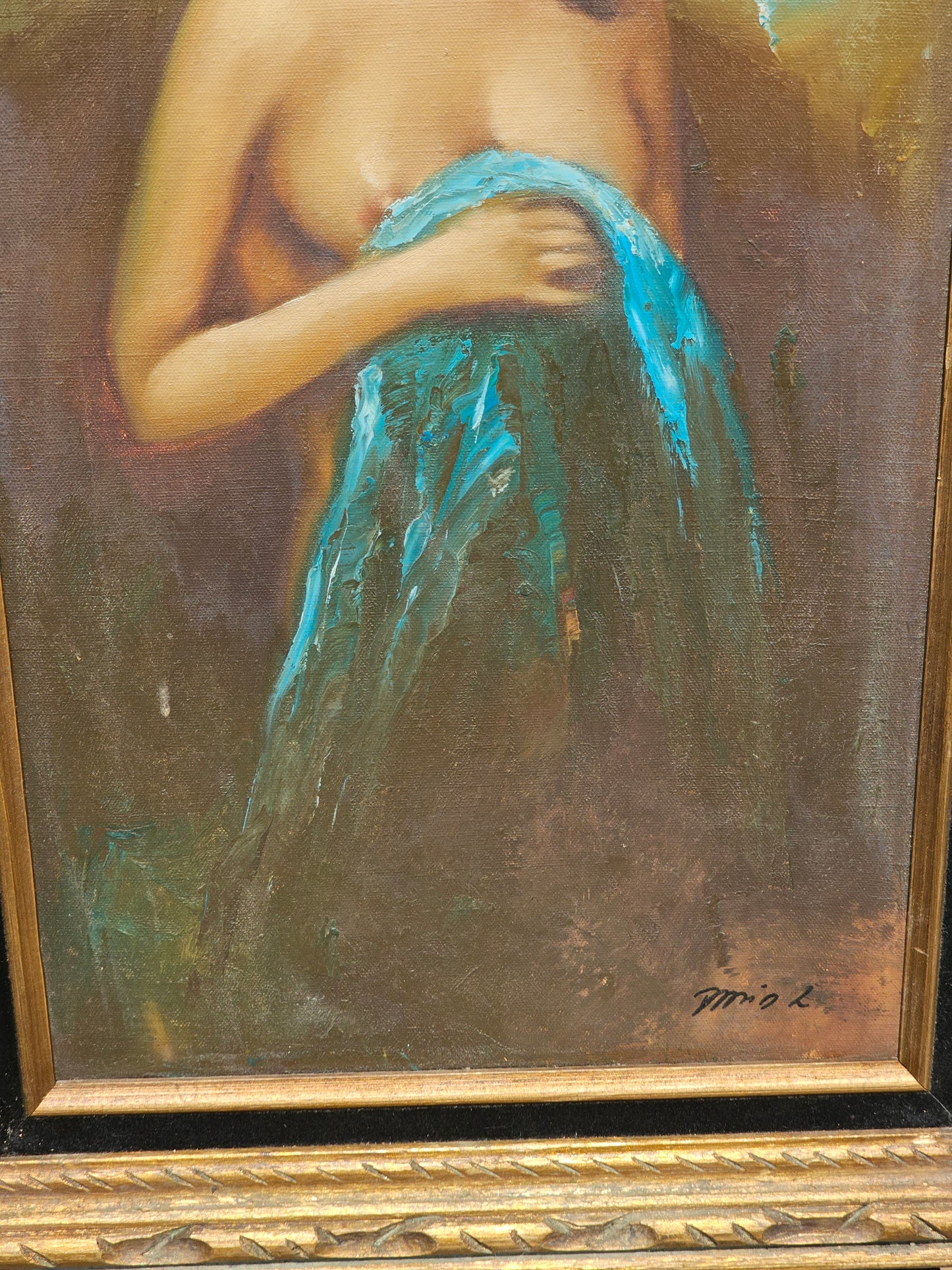 Vintage Mexican Nude Woman Oil on Canvas Framed Painting, Hecho en Mexico, Signed Mio L., 17.25" x 29"