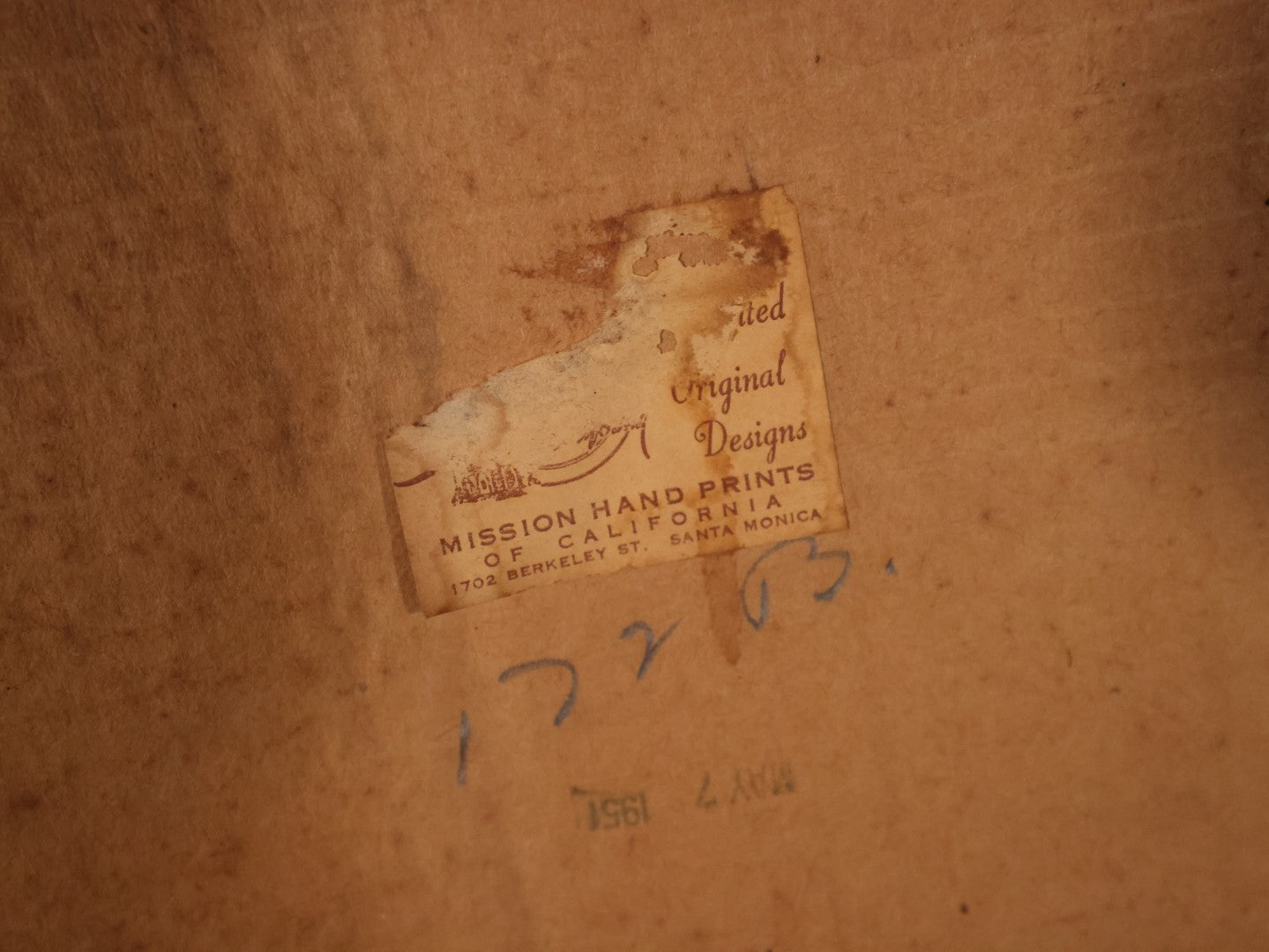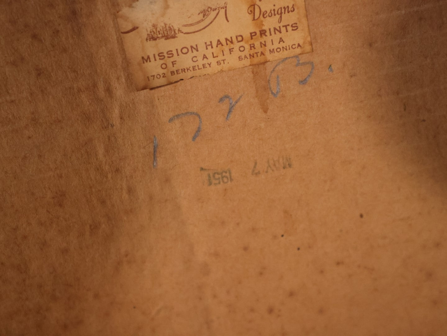 Various wear, overall good, frame marked "mission hand prints of california," paper label on back