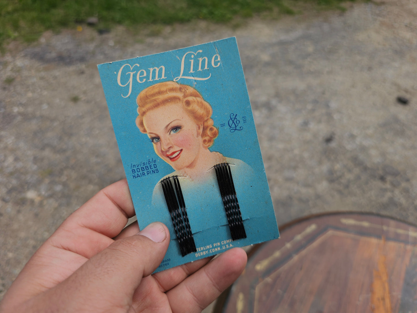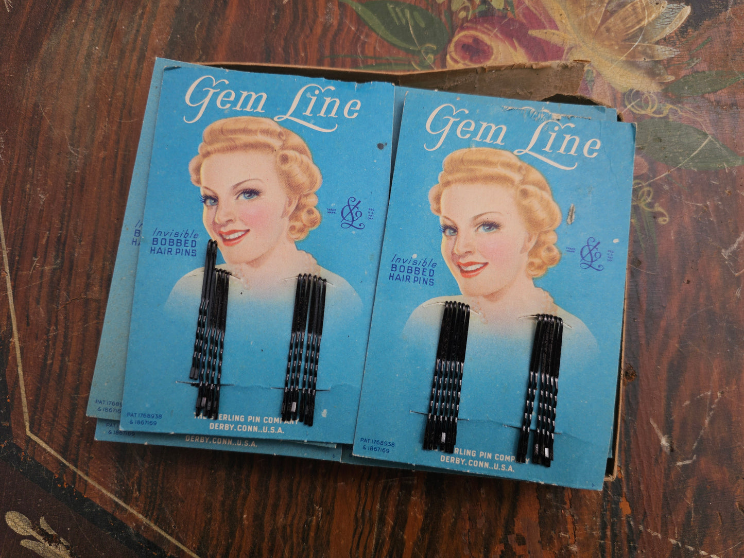 Vintage NOS lot of 21 carded gem line invisible bobbed hair pins, the sterling pin company, derby, conn., usa