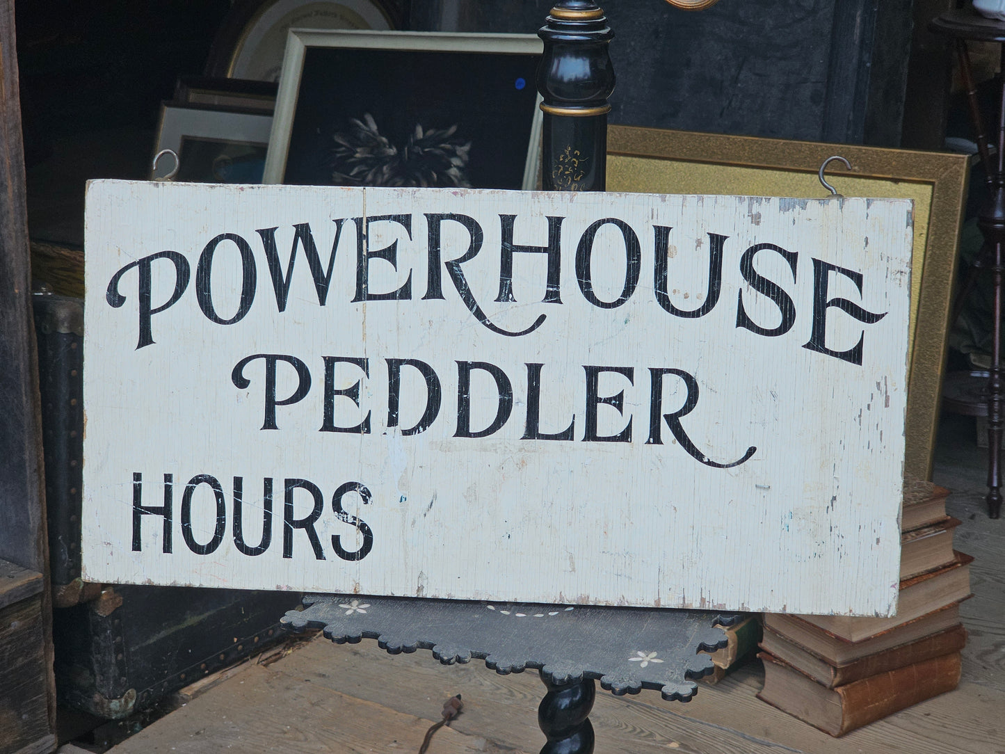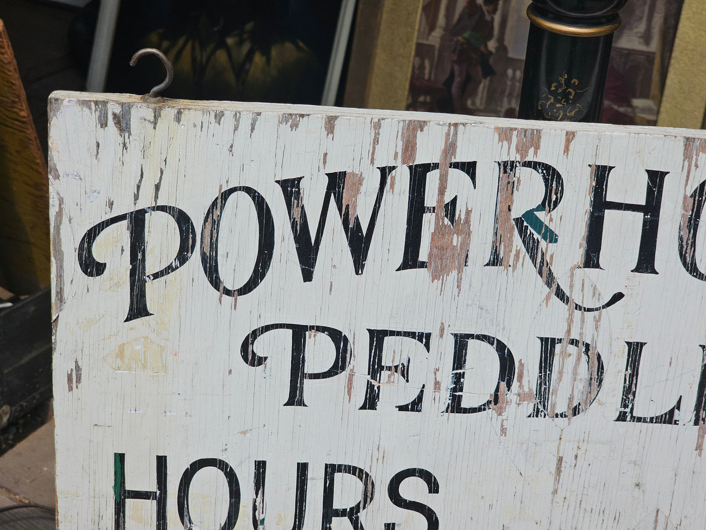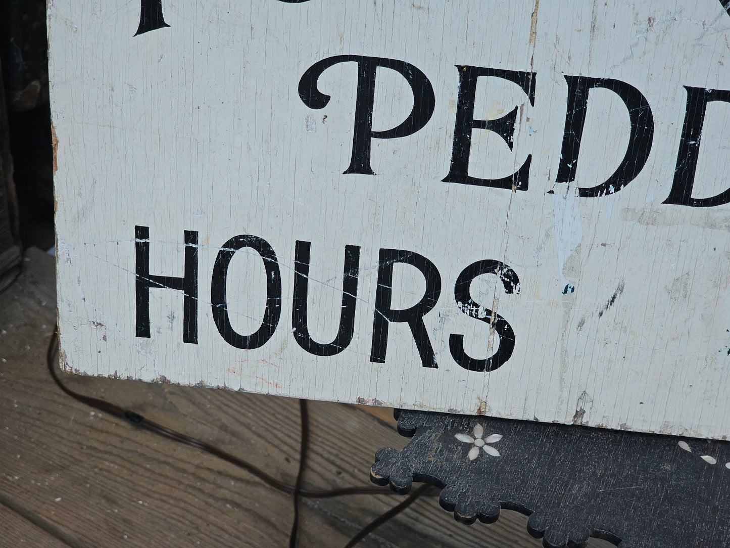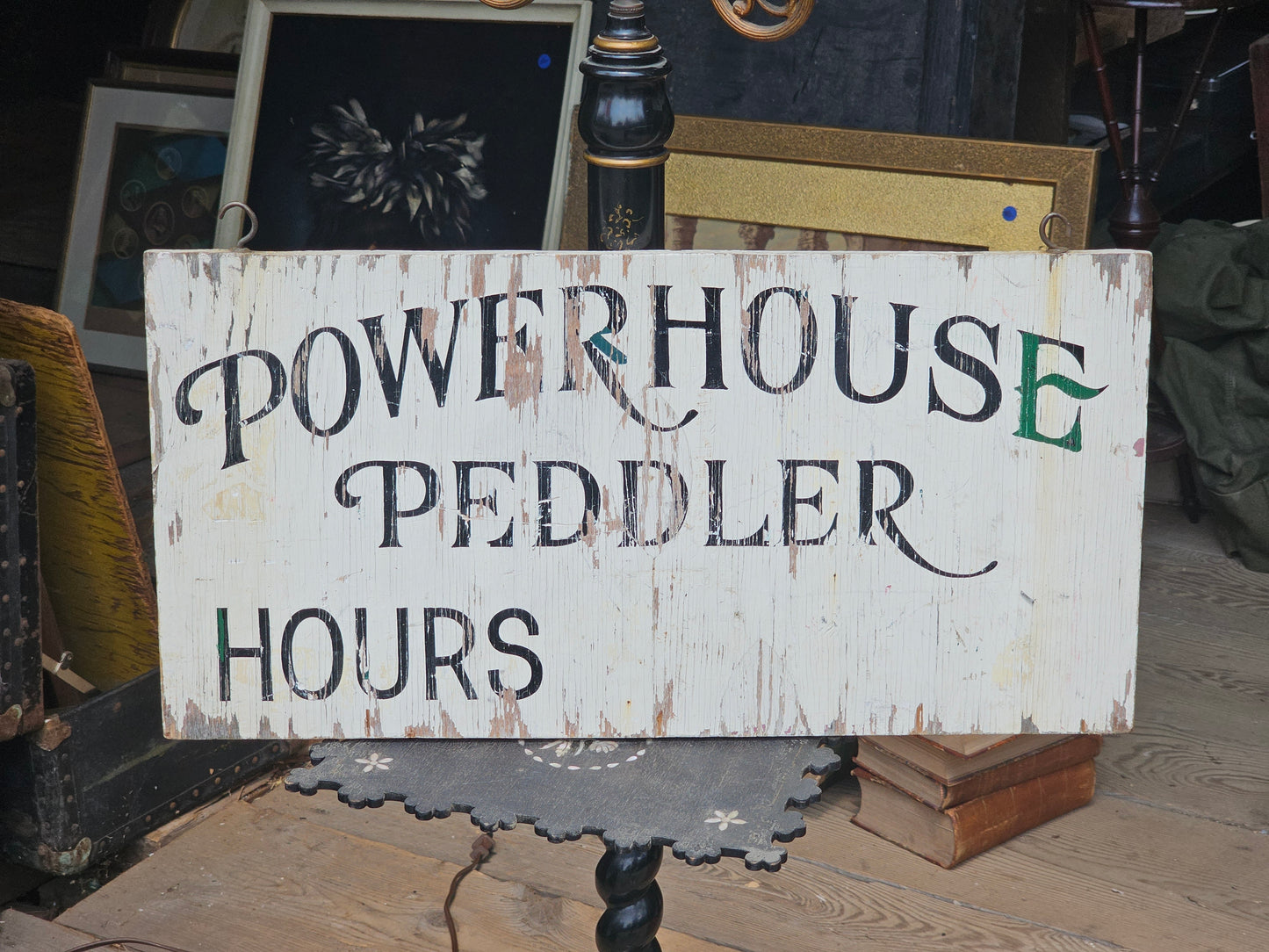 Vintage Powerhouse Peddler Antiques Store Hand Painted Hours Sign on Wood, With Hooks, 24" x 13"