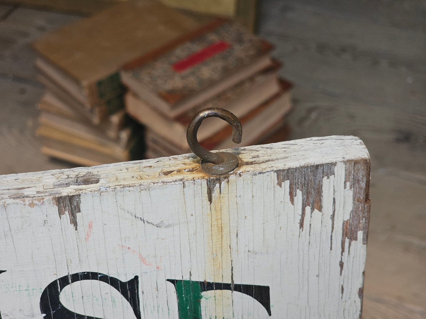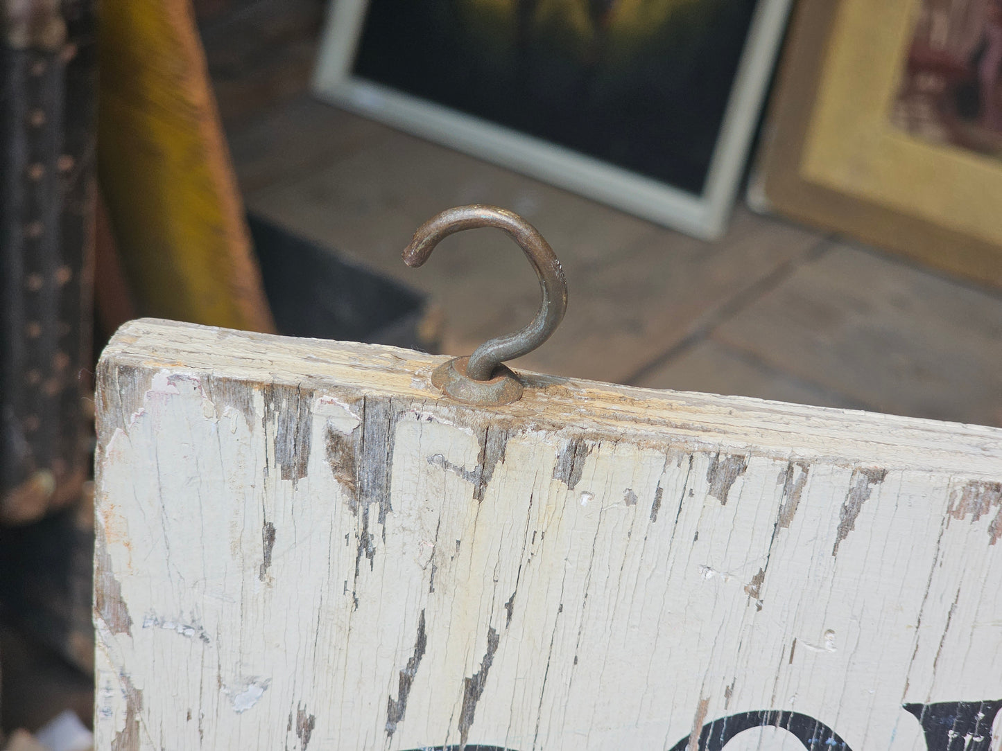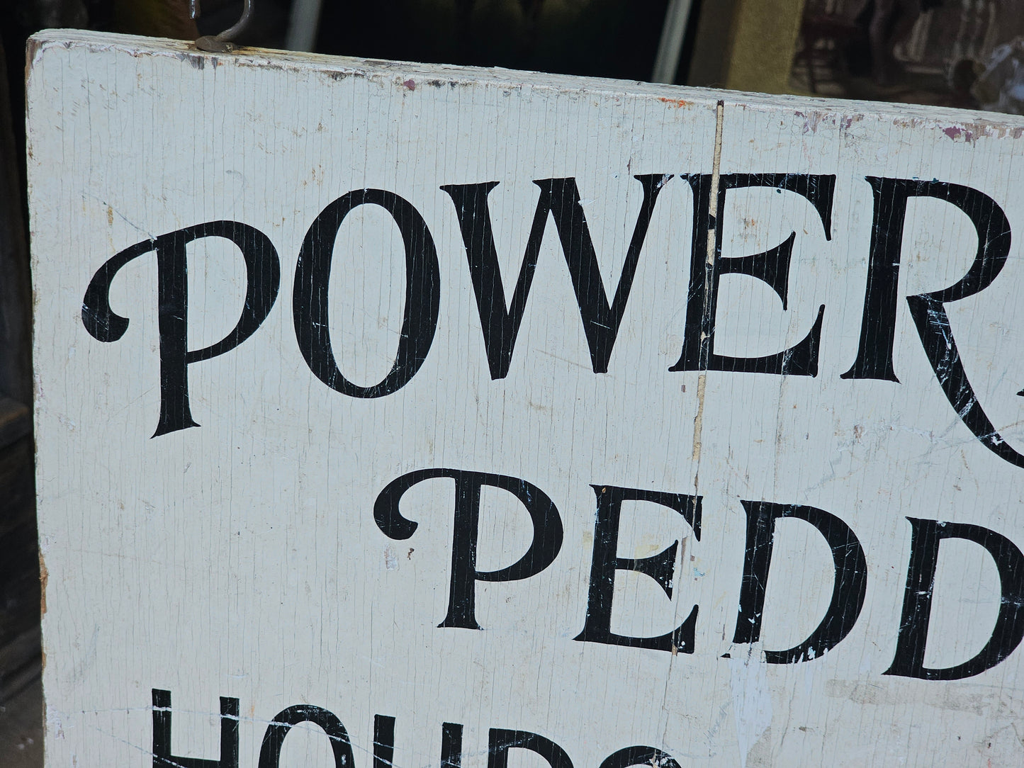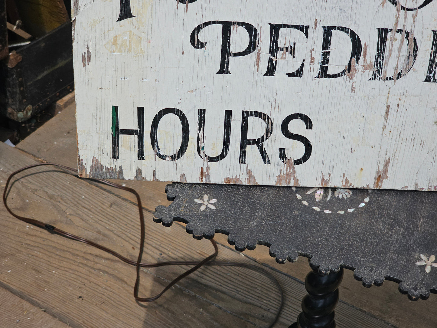 Vintage Powerhouse Peddler Antiques Store Hand Painted Hours Sign on Wood, With Hooks, 24" x 13"