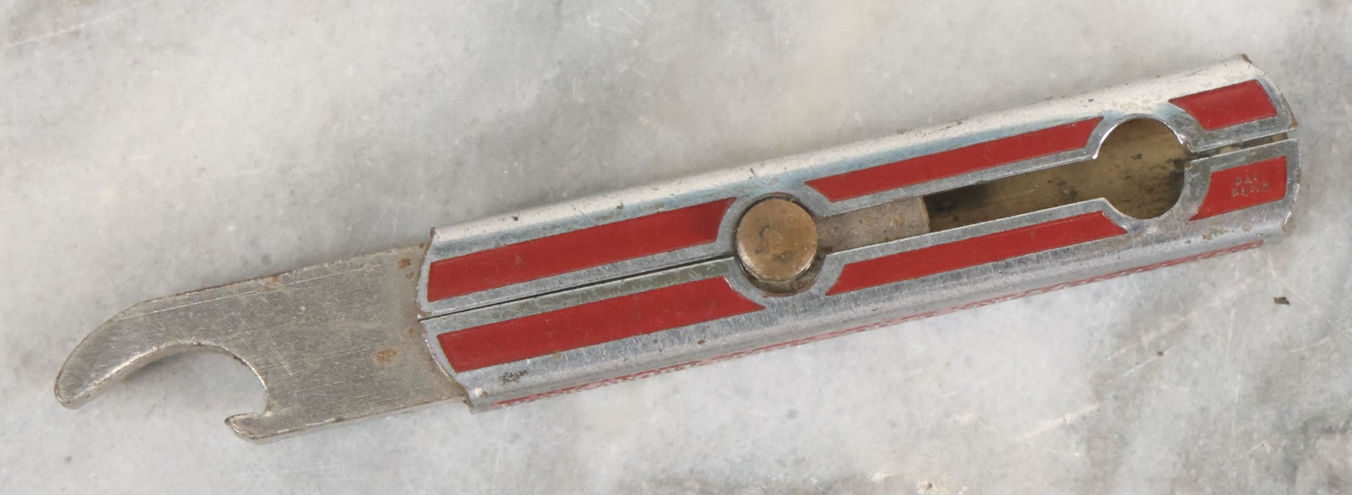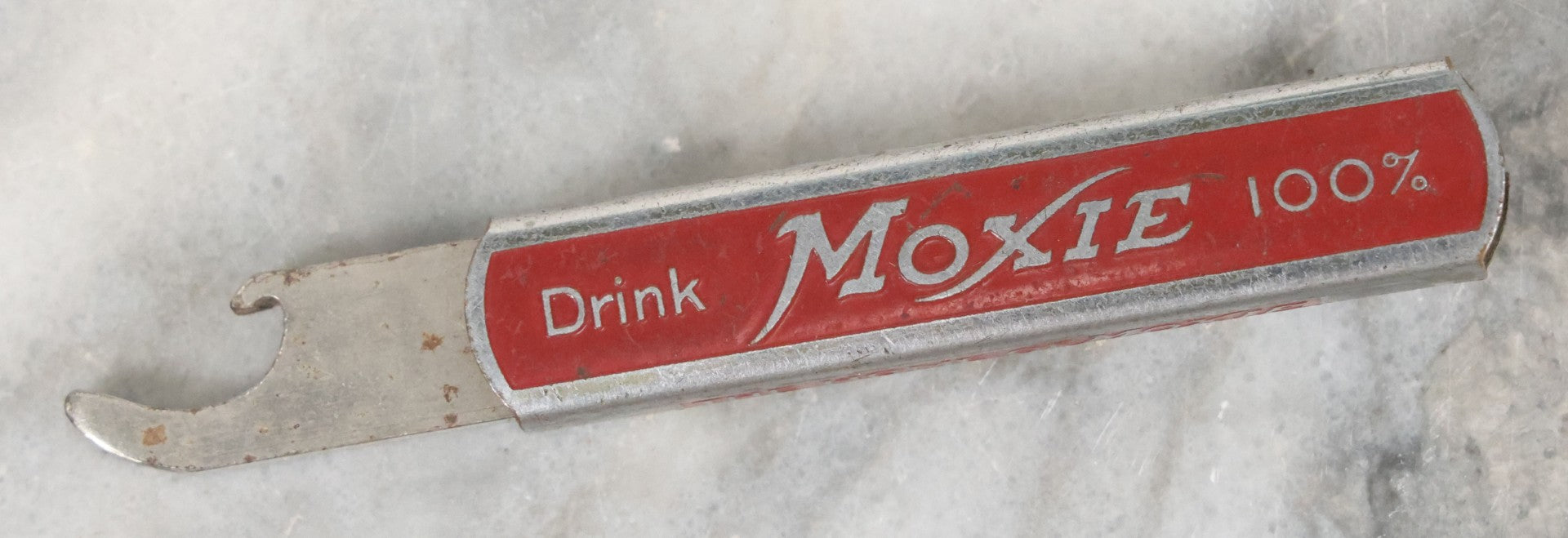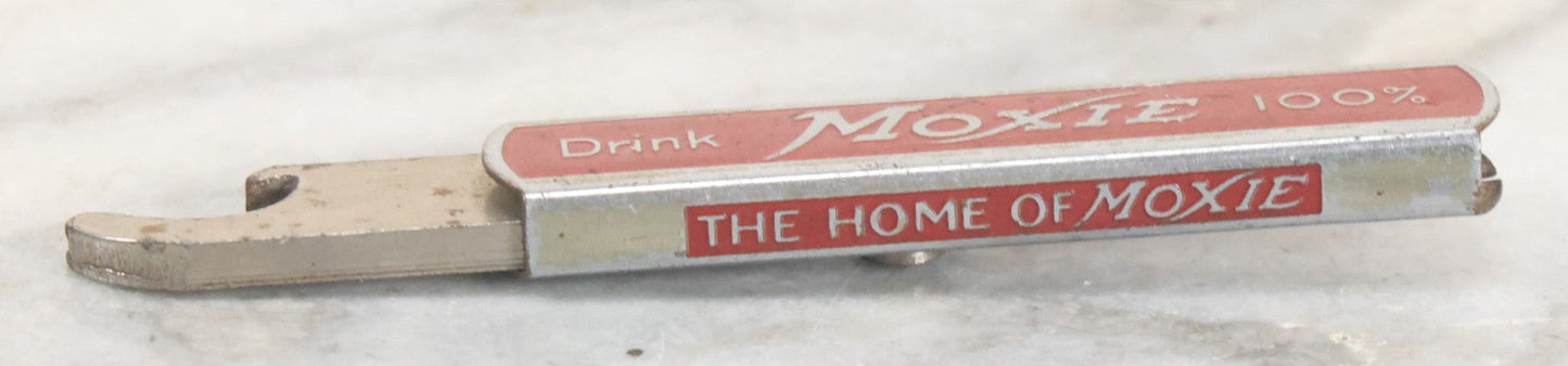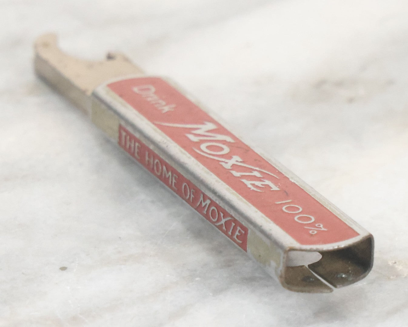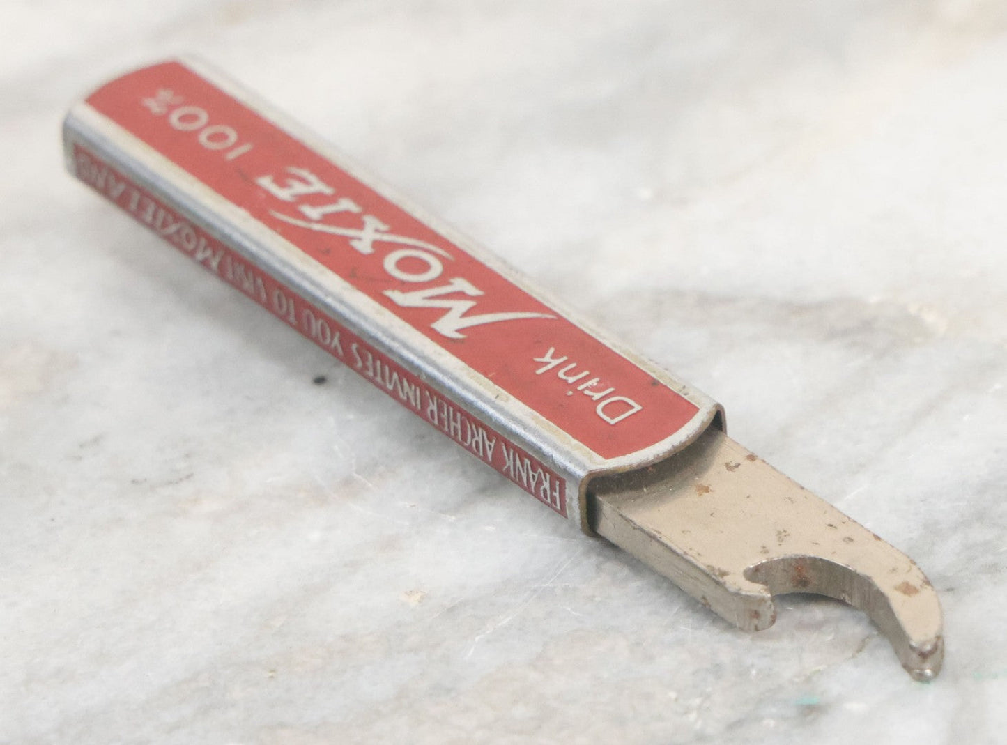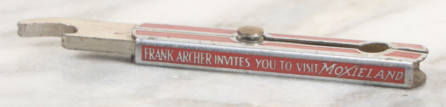 Lot 034 - Vintage Slide Up Bottle Opener Advertising Moxie Soda, "Frank Archer Invites You To Visit Moxie Land, The Home Of Moxie, Drink Moxie 100%" Marked Patent Pending