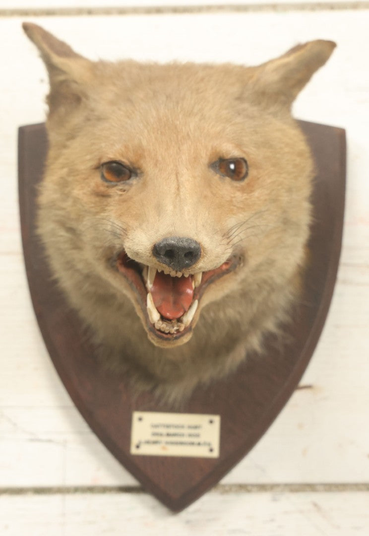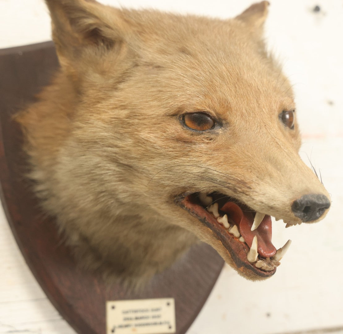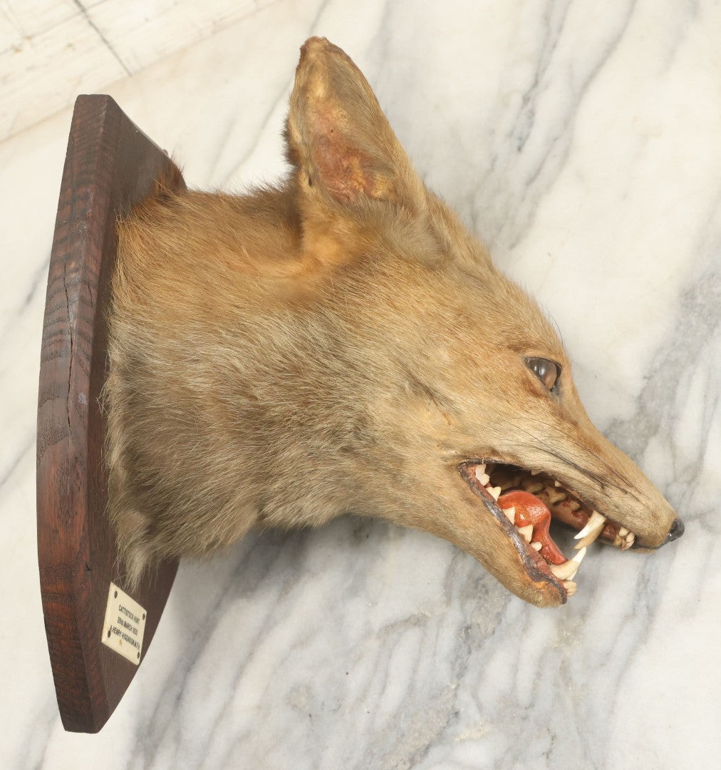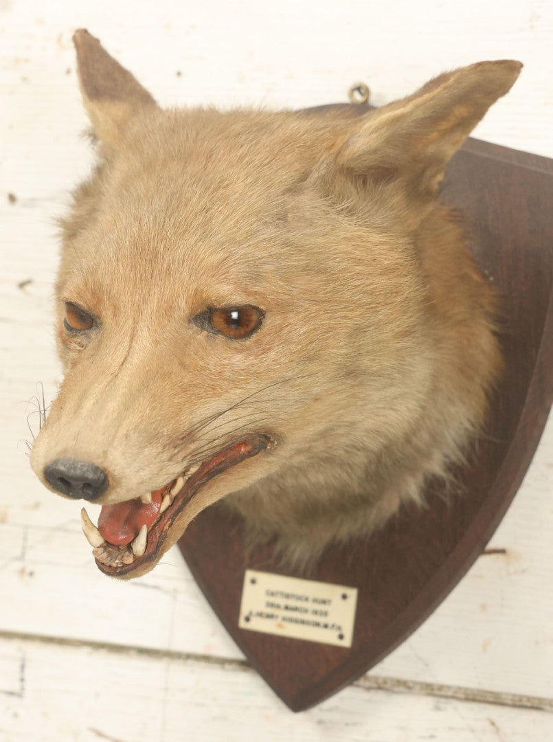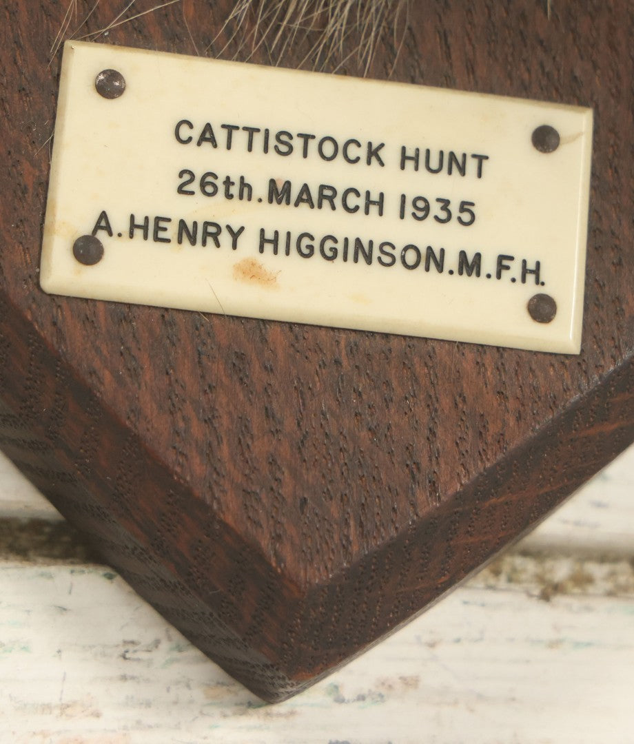 Lot 002 - Vintage Taxidermy Fox Head Mount With Plaque And Paper Label On Verso, Cattistock Hunt, Dorset, England, March 26th, 1935, Hunted By A. Henry Higginson, M.F.H. (Master Of Foxhounds), Taxidermy By F.W. Bartlett, Banbury, Mount 7-3/4" x 10-1/4"