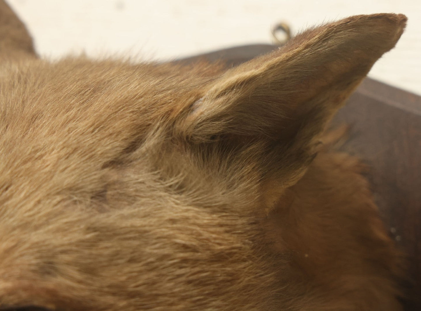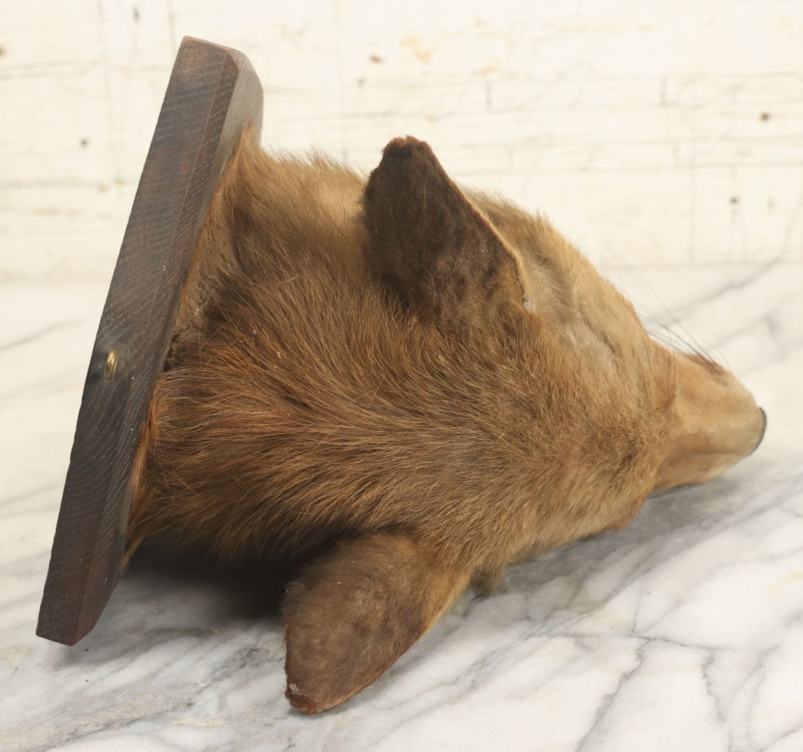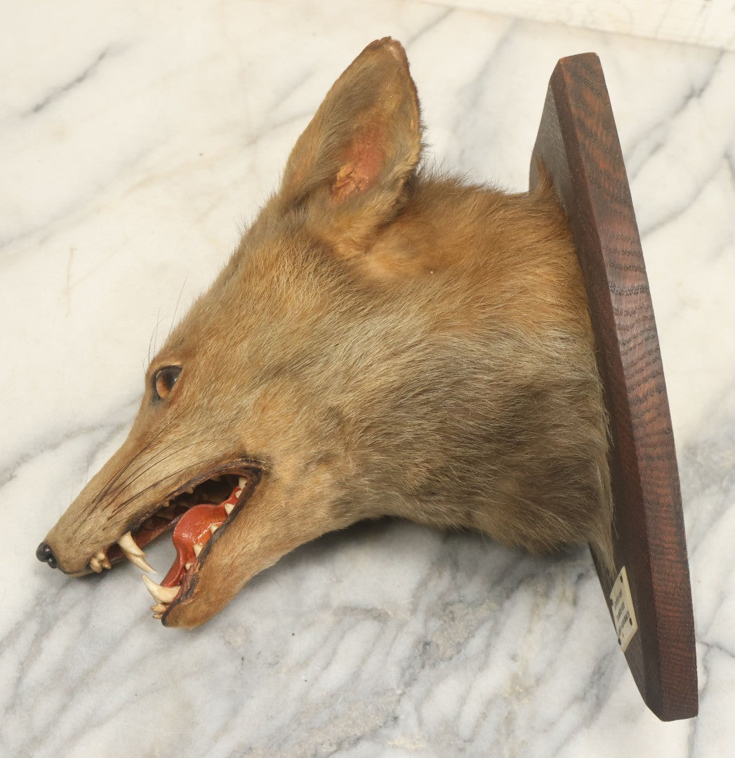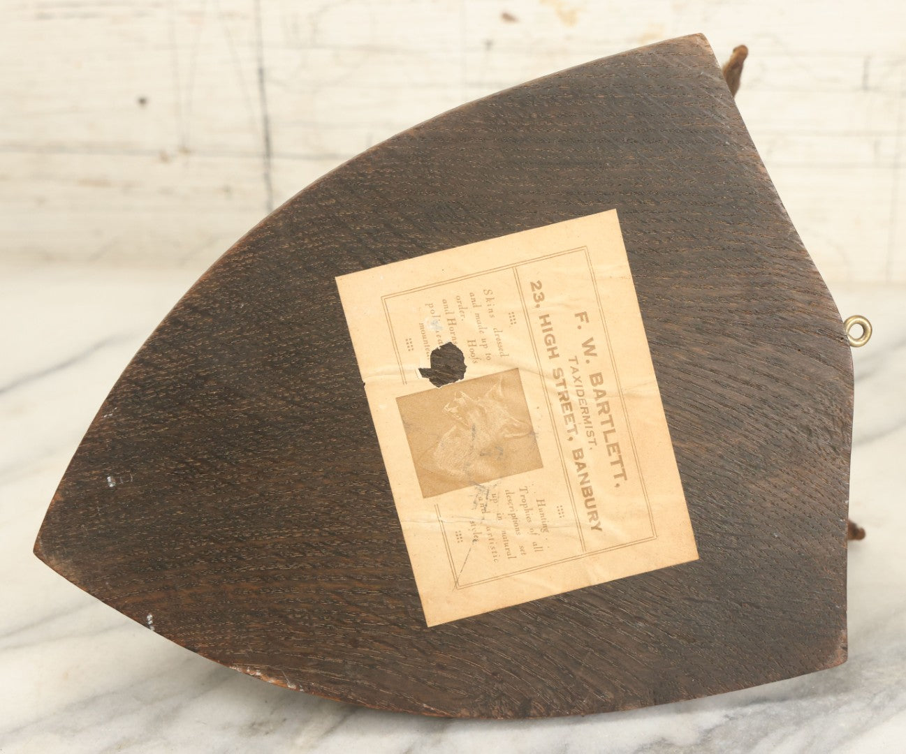 Lot 002 - Vintage Taxidermy Fox Head Mount With Plaque And Paper Label On Verso, Cattistock Hunt, Dorset, England, March 26th, 1935, Hunted By A. Henry Higginson, M.F.H. (Master Of Foxhounds), Taxidermy By F.W. Bartlett, Banbury, Mount 7-3/4" x 10-1/4"