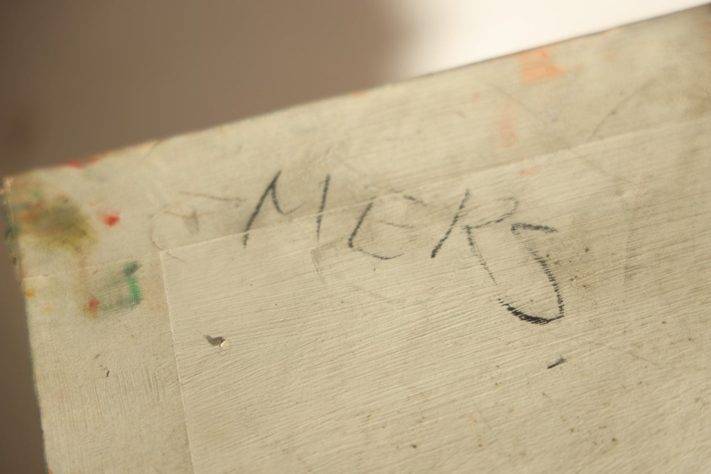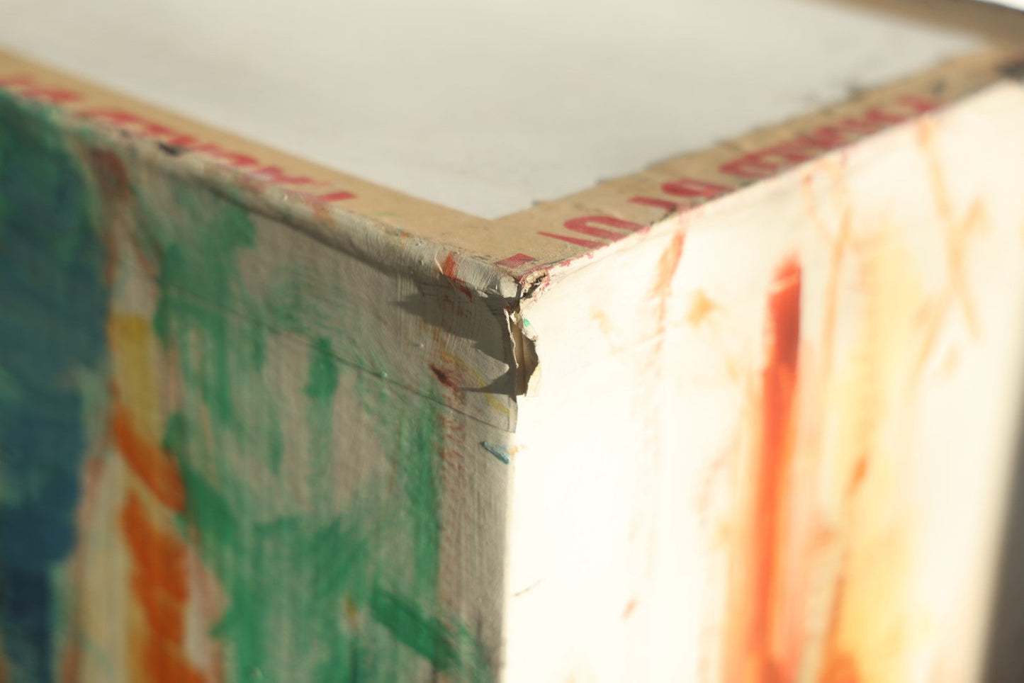 Various wear and losses. Possibly artist signed "Emers." Appears to be on cardboard or another paper art board, bound with drywall tape.