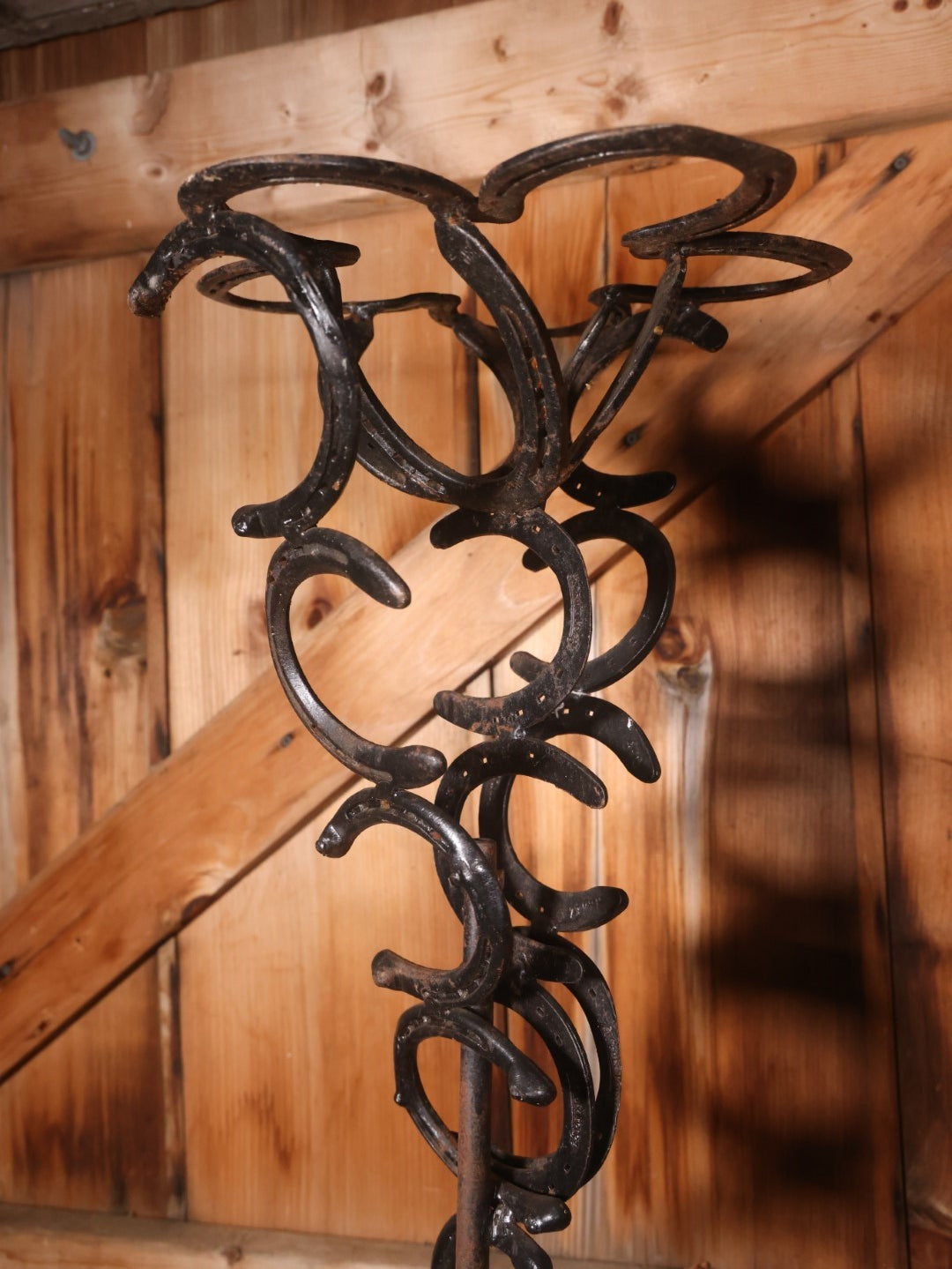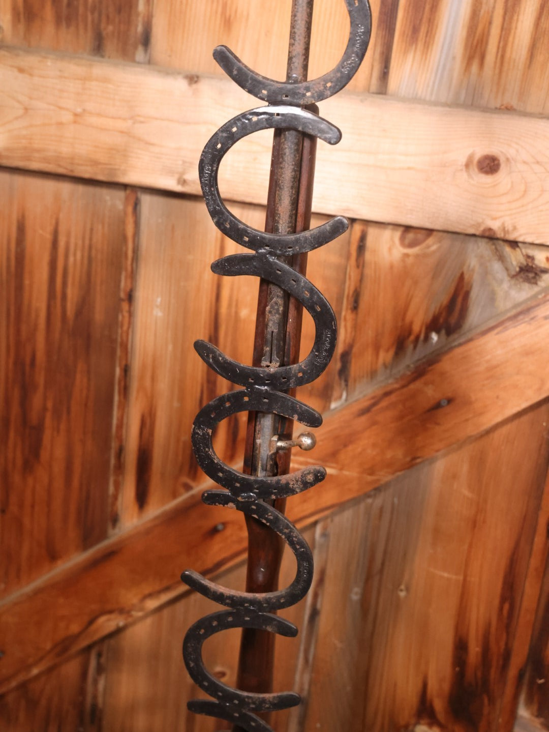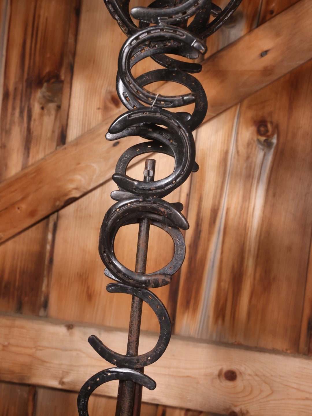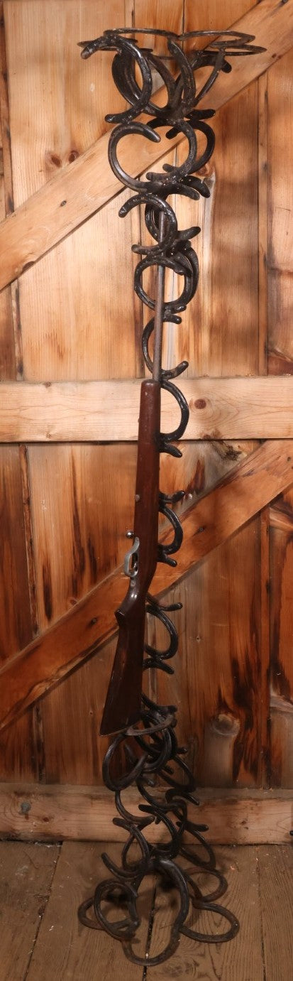 Vintage Western Folk Art Sculpture, Welded Horseshoes And Antique Rifle, Coat Stand Or Lamp, Likely Unfinished