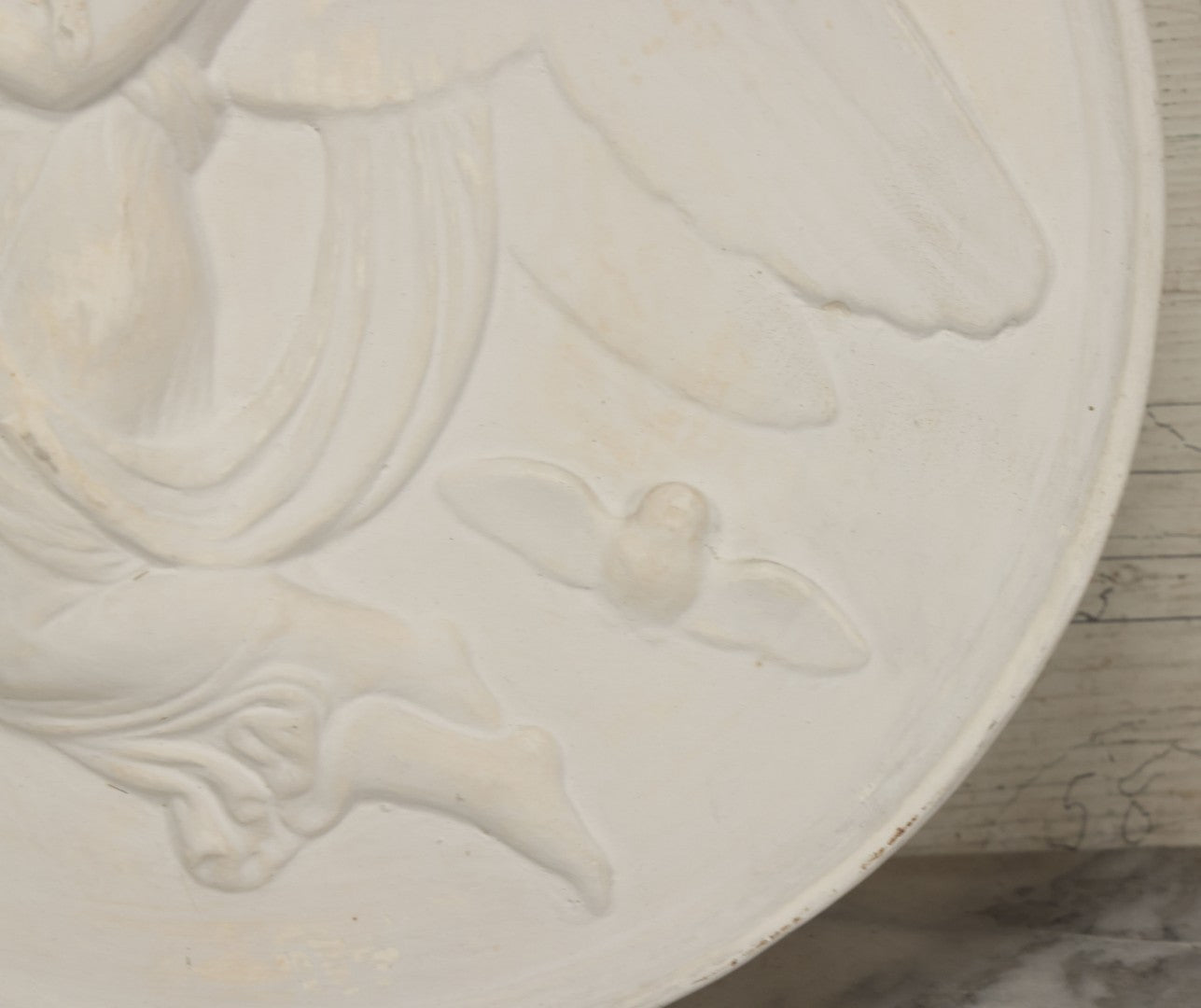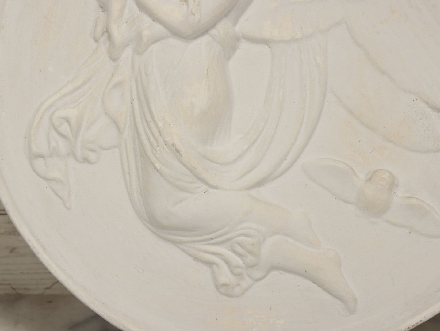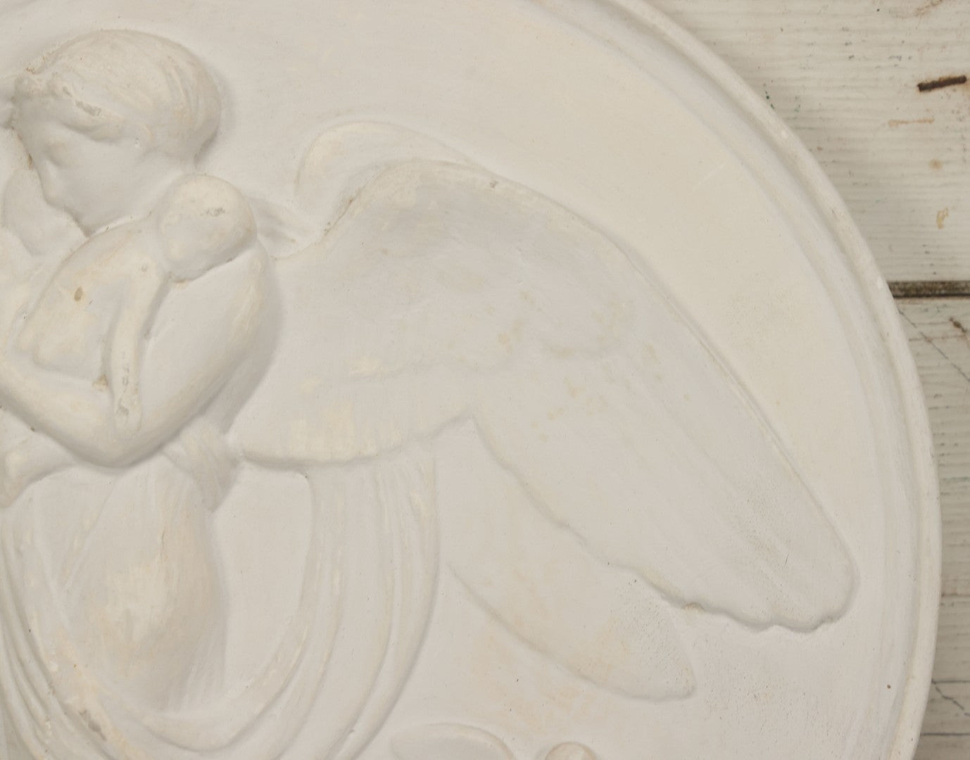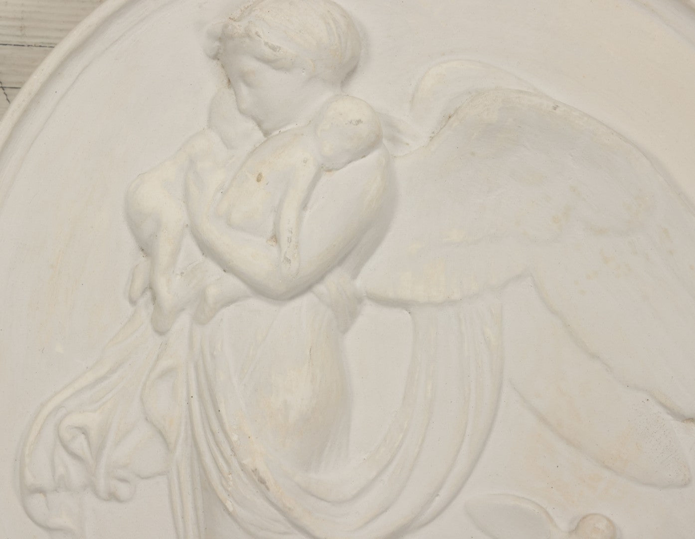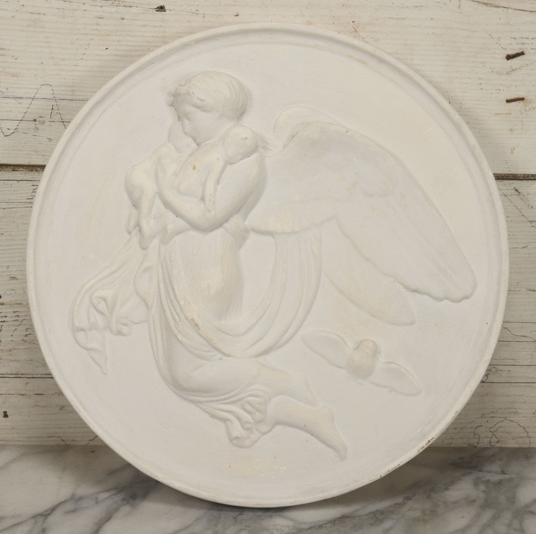 Lot 099 - Vintage White Plaster Relief Plaque, Winged Angel Holding Child, With Owl, 13-3/8" Diameter