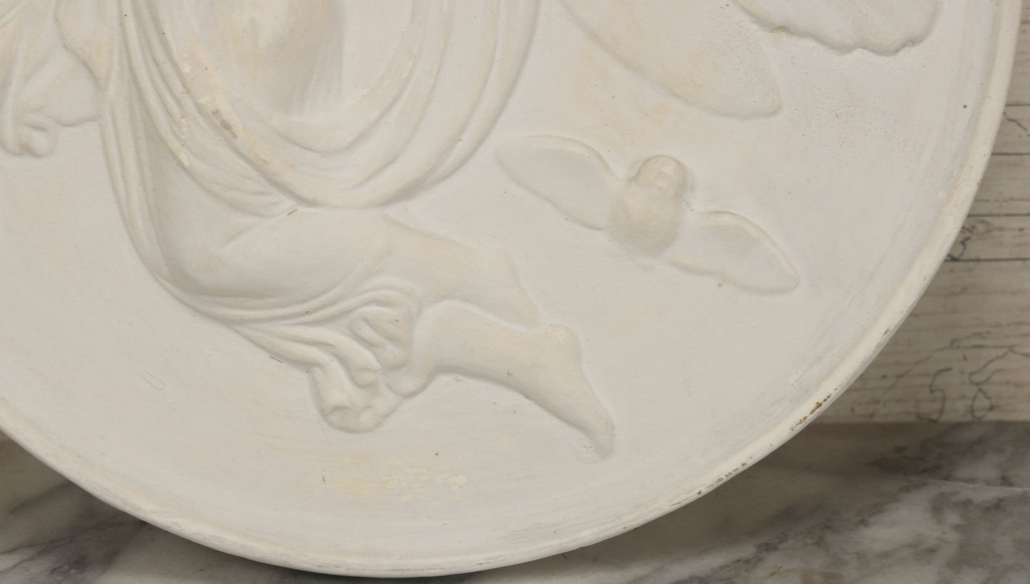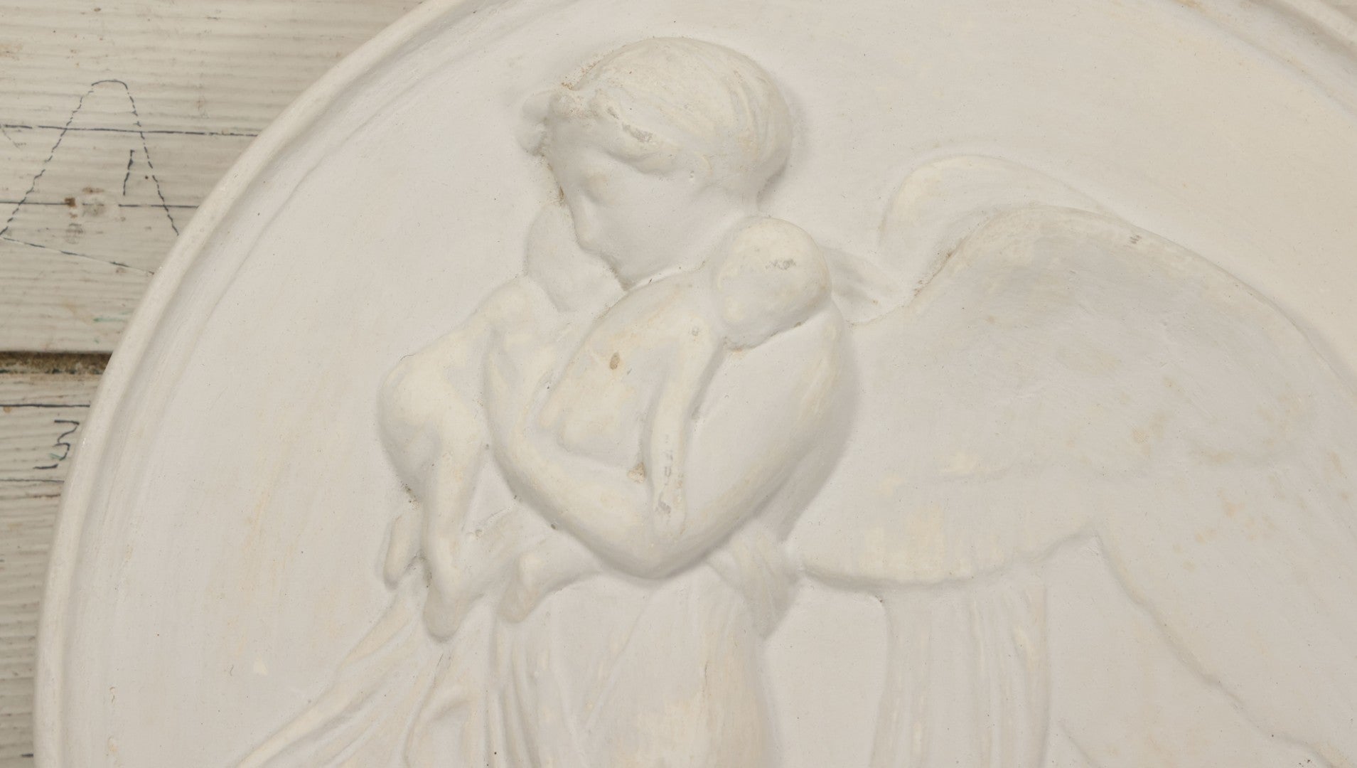 Your absentee bid for Lot 099 - Vintage White Plaster Relief Plaque, Winged Angel Holding Child, With Owl, 13-3/8" Diameter was successfully submitted—thank you for bidding with us!