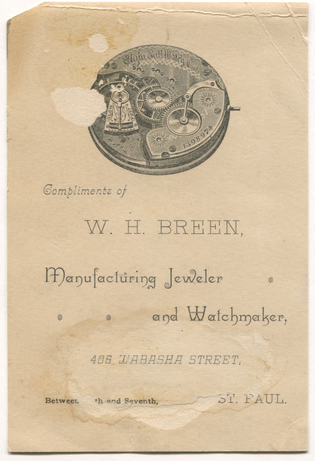 W.H. Brteen Jeweler & Watchmaker, St. Paul, MN Antique Lithographed Trade Card