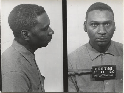 Here is an opportunity to own a piece of true crime history! This true original mugshot photograph includes arrest and suspect information on the back side. It comes in a transparent archival hard plastic case to protect and display it. The image shown here is an exact scan of the mugshot and back side you will receive.