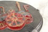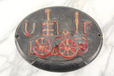 Here is a beautiful antique cast iron "UF" fire marker, indicating the United Firemen’s Insurance Company, out of Philadelphia. This marker was manufactured by Wilton, which is marked in the cast iron on the back side beneath some rust. The marker features original red, gold, and black paint. Please note that I am unsure if this is an original period insurance mark, but if it is a reproduction, it is indeed an antique one.