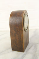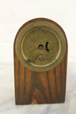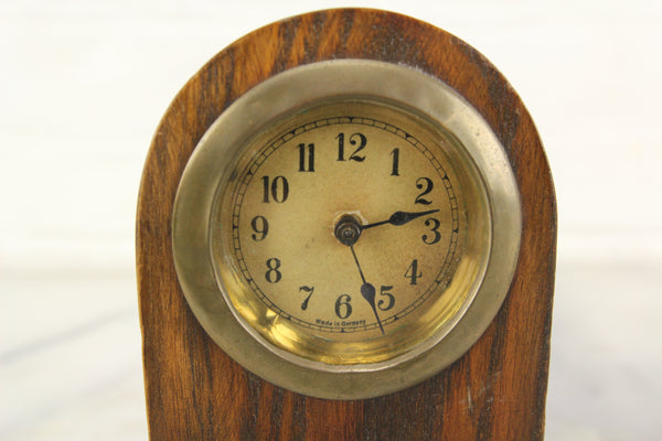 Here is a charming little wooden clock body with a nice wind-up clock movement marked "Made in Germany." The movement winds as it should, ticks consistently, and appears to keep time. The simple wood body is in good condition with nice patina. There is a chip in the wood on the back side. The rim of the clock is slightly bent on the inside lower left and there appears to be a minor chip in the bottom part of the glass. Please see the photographs to fully understand the condition of this item.