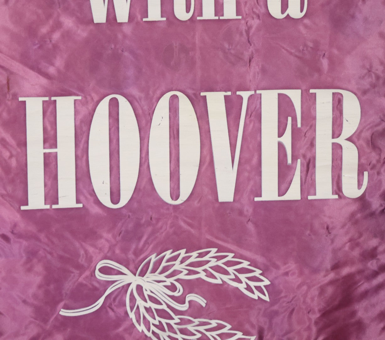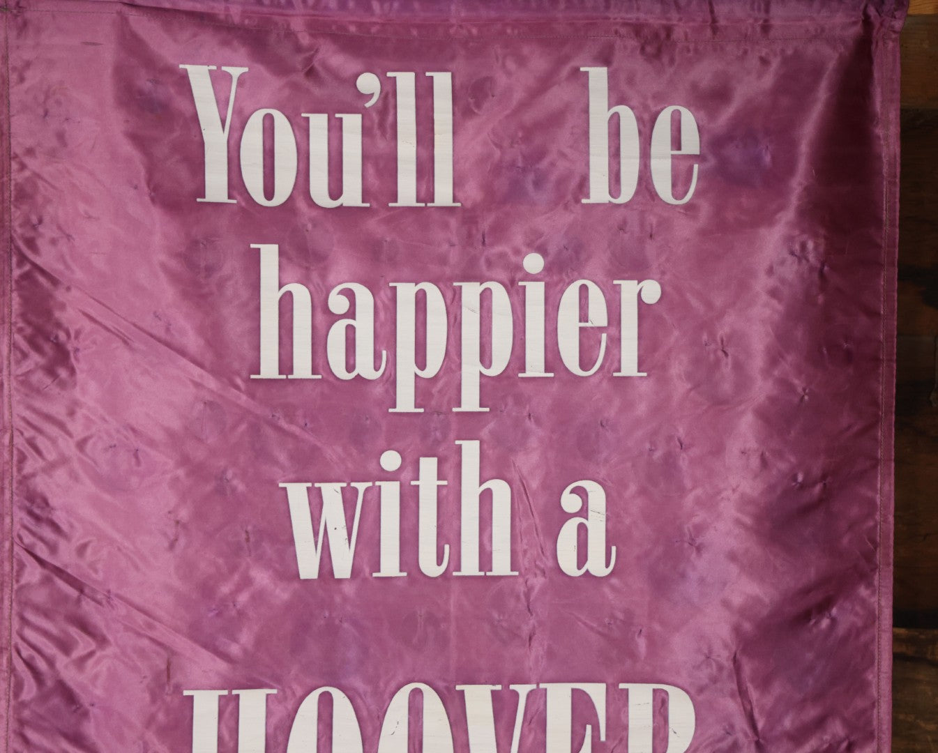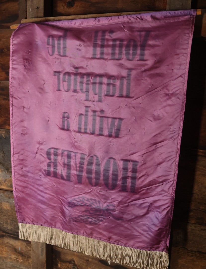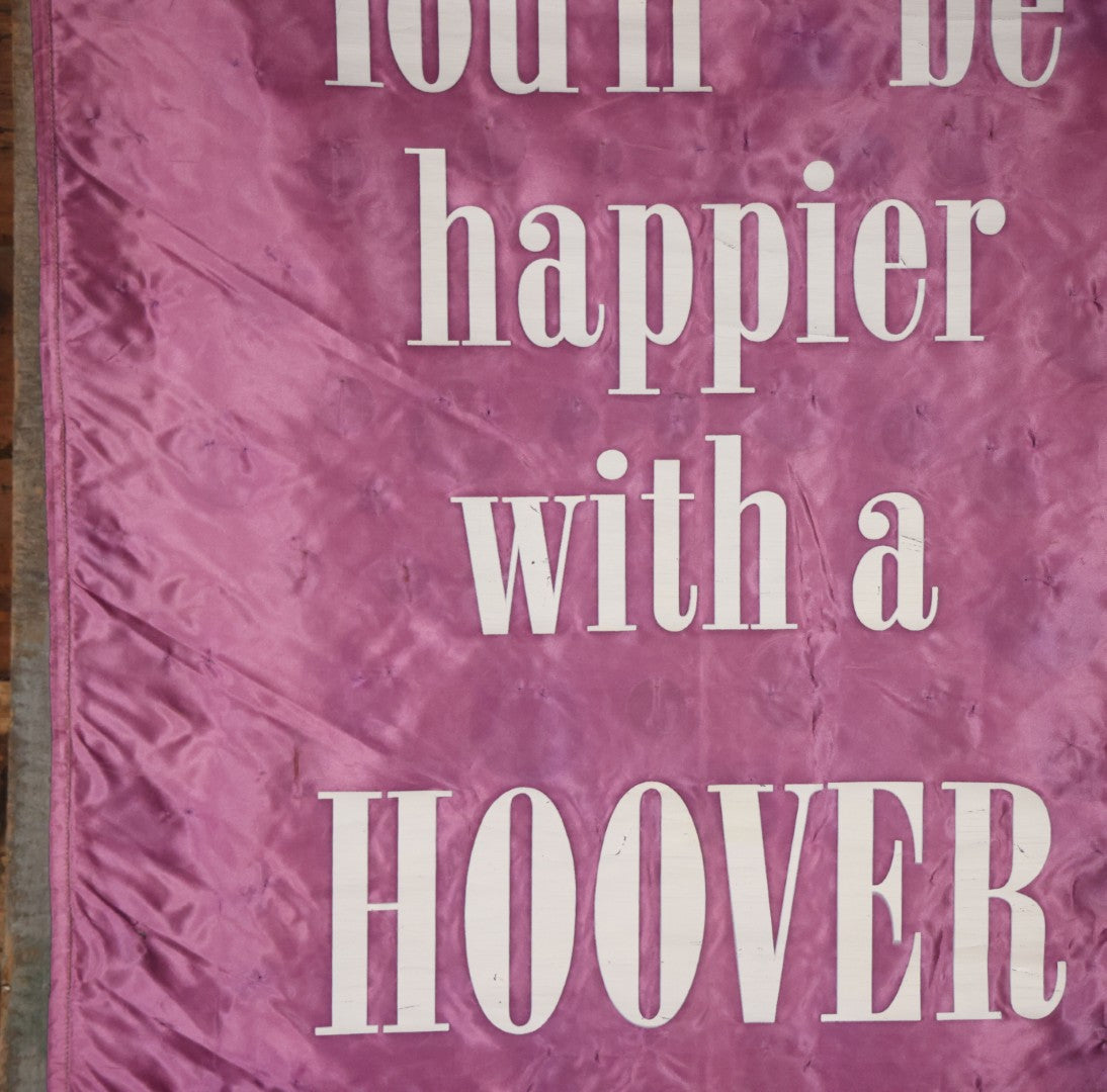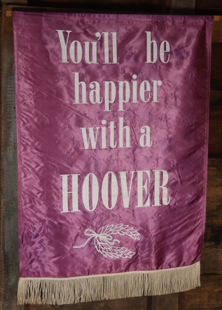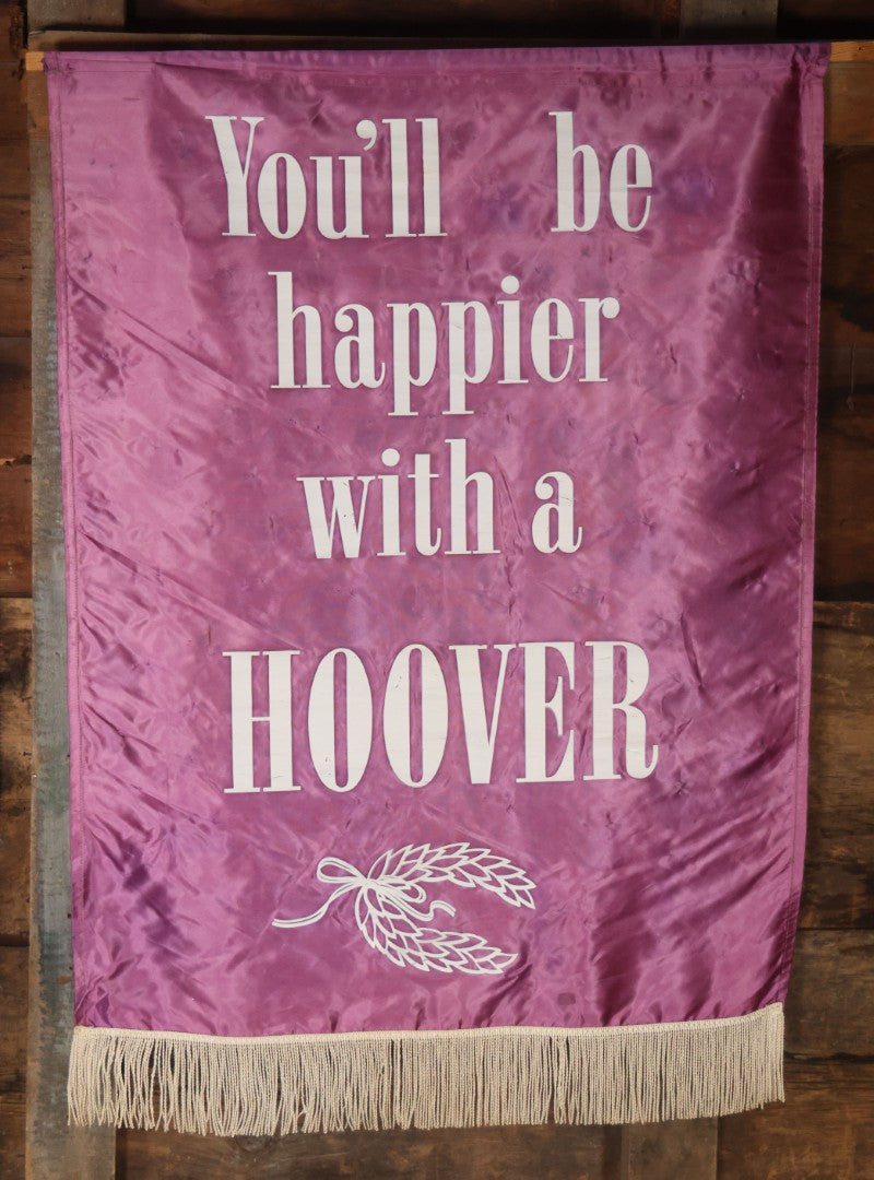 "You'll Be Happier With A Hoover" Vintage Purple Silken Advertising Banner For Hoover Vacuum Cleaners, With White Fringe On Bottom