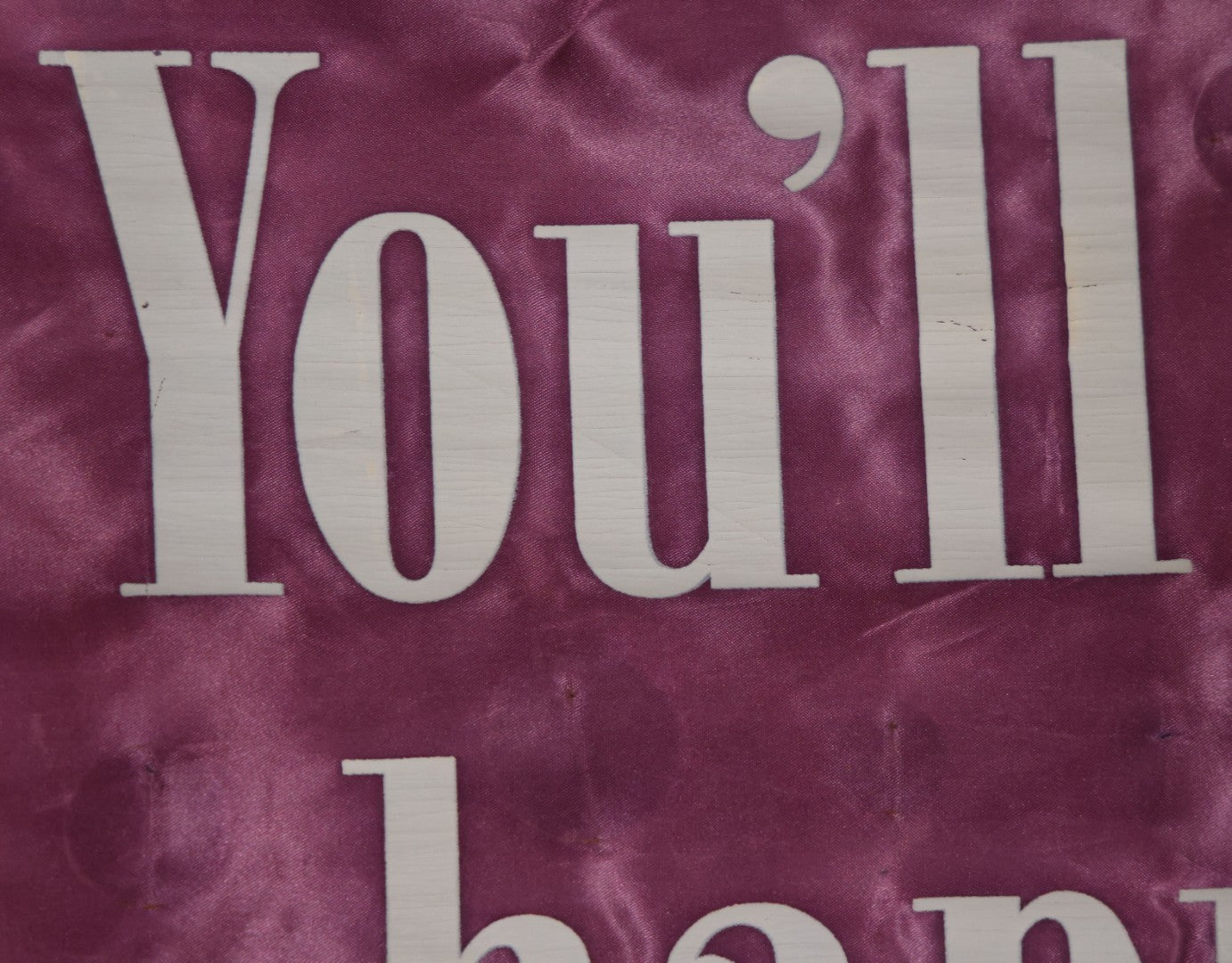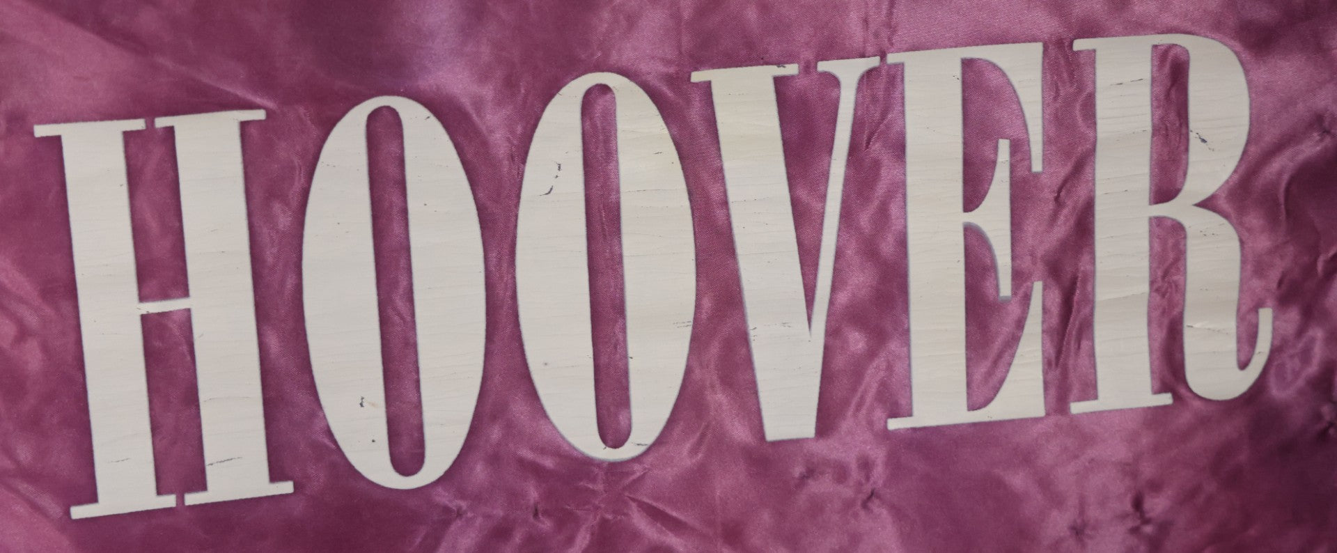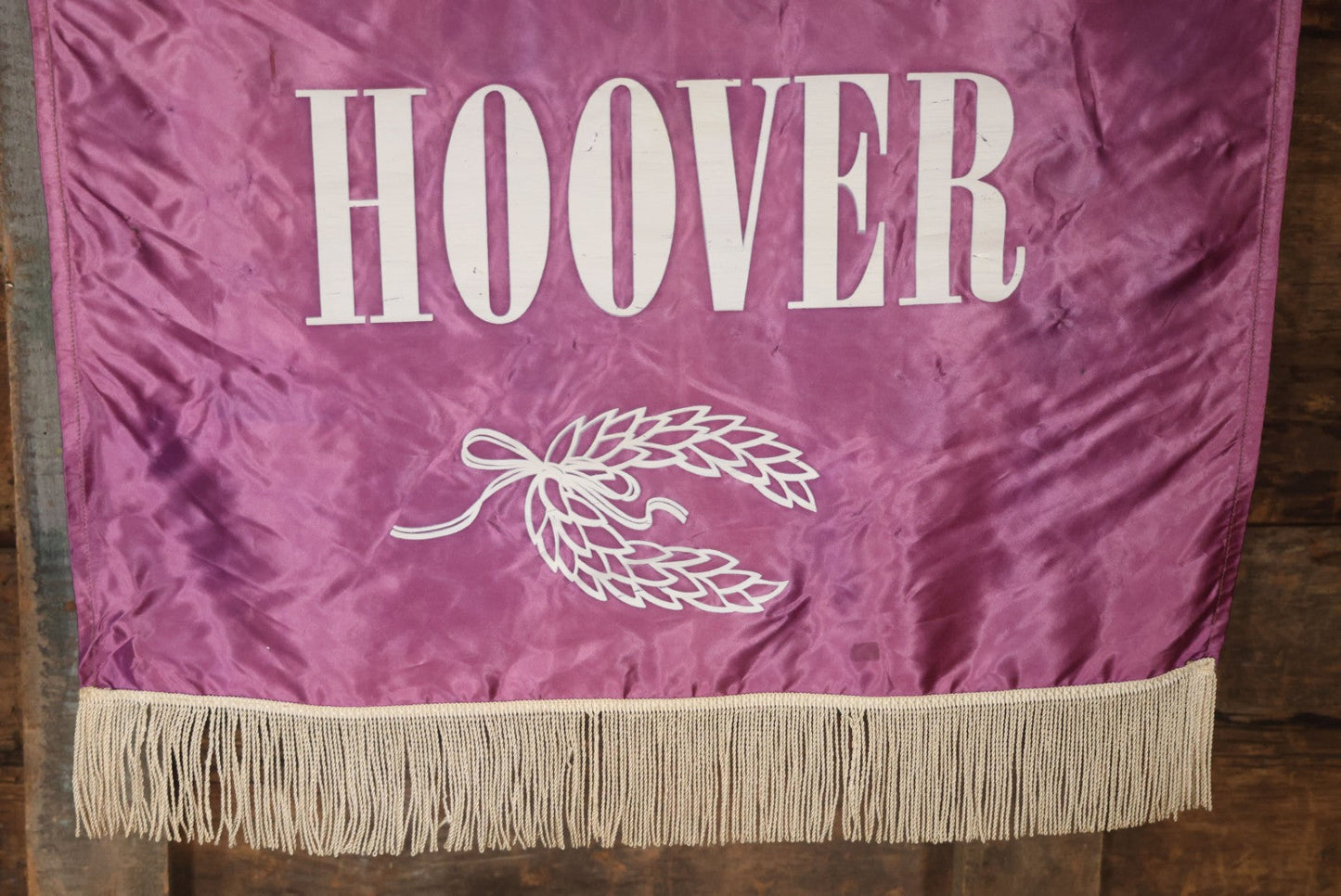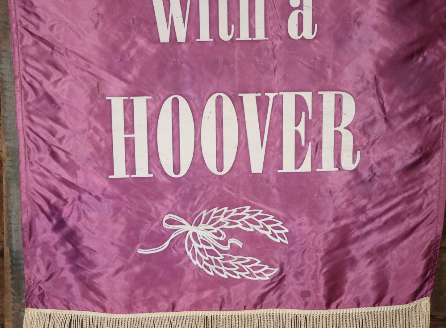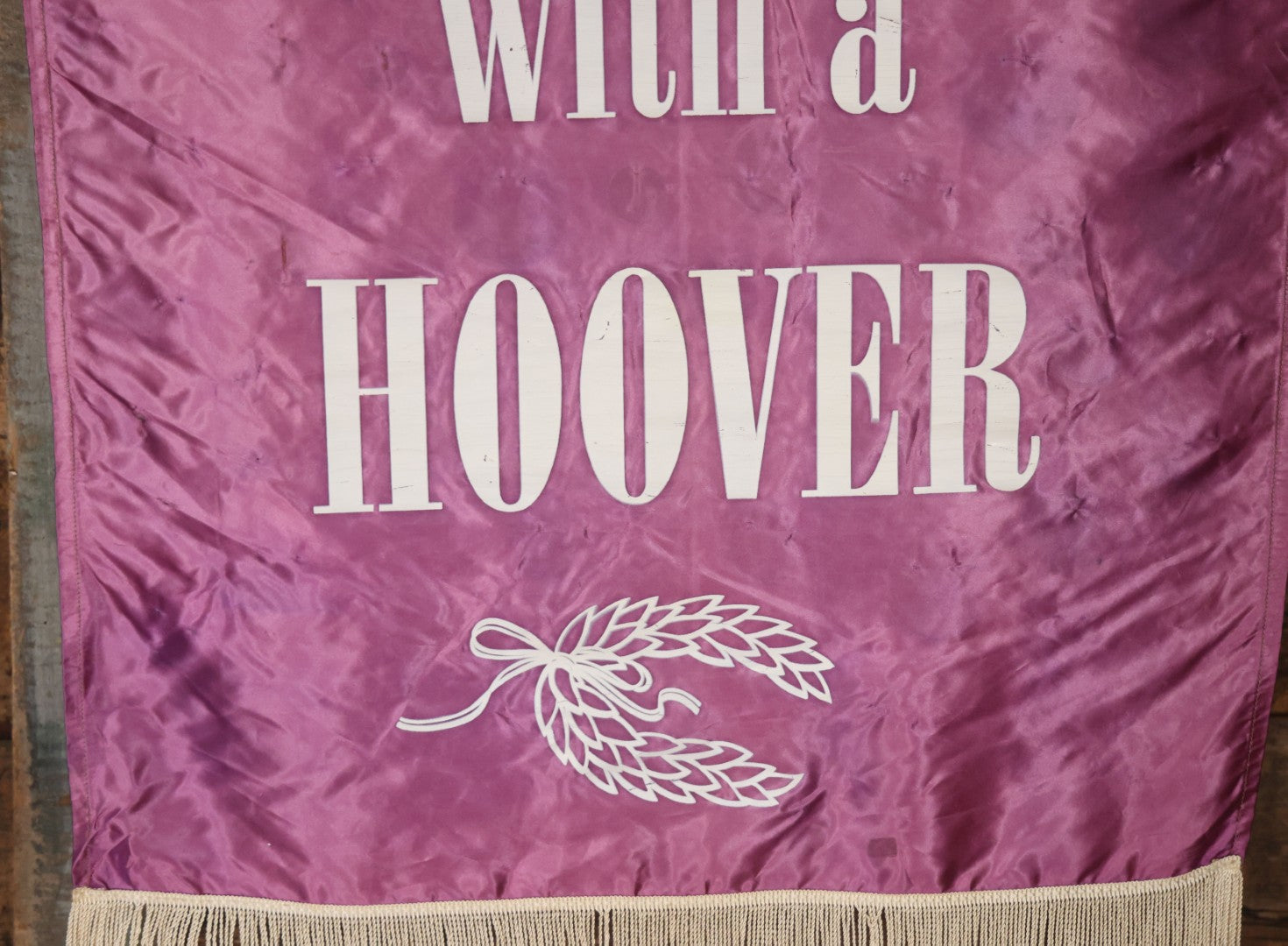 "You'll Be Happier With A Hoover" Vintage Purple Silken Advertising Banner For Hoover Vacuum Cleaners, With White Fringe On Bottom