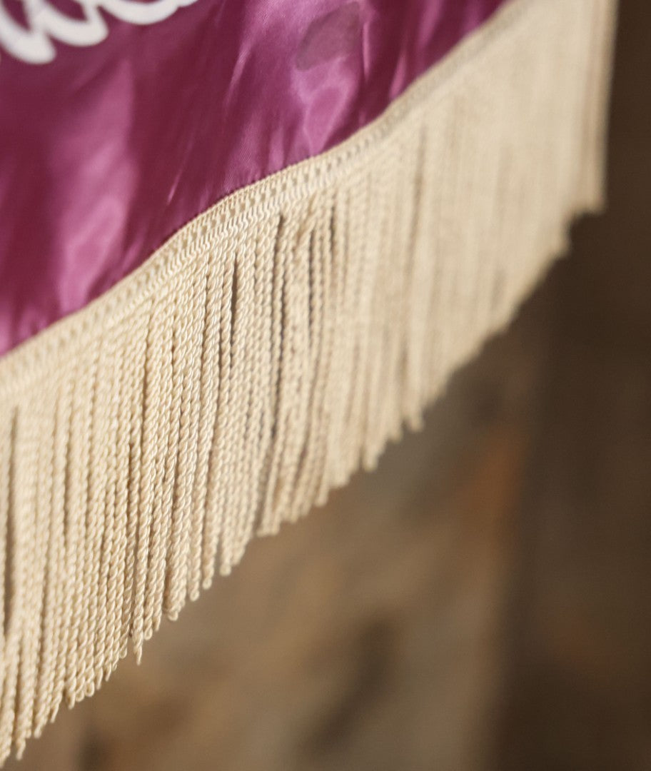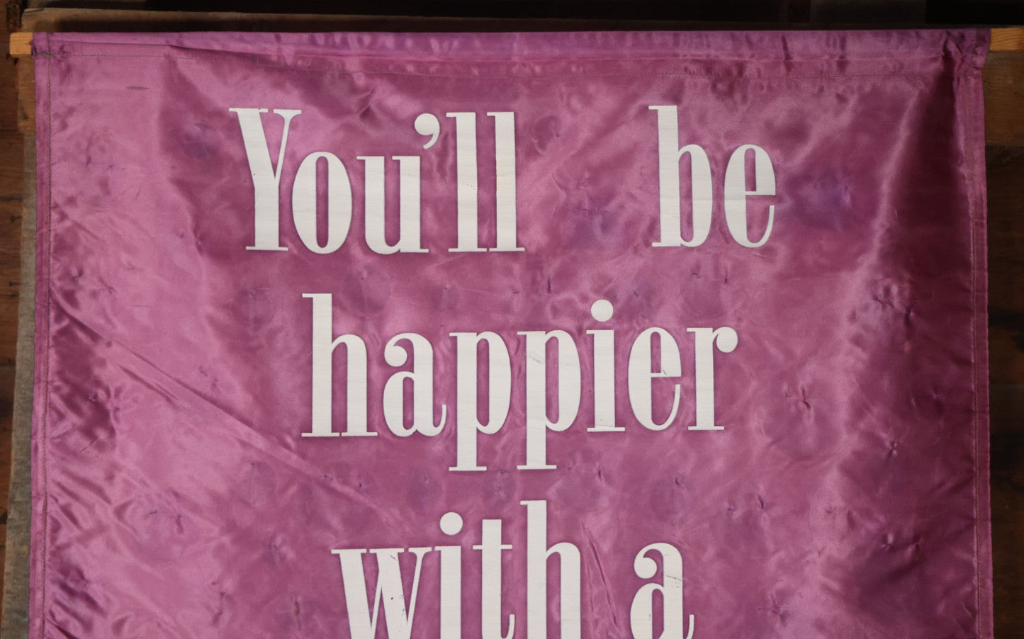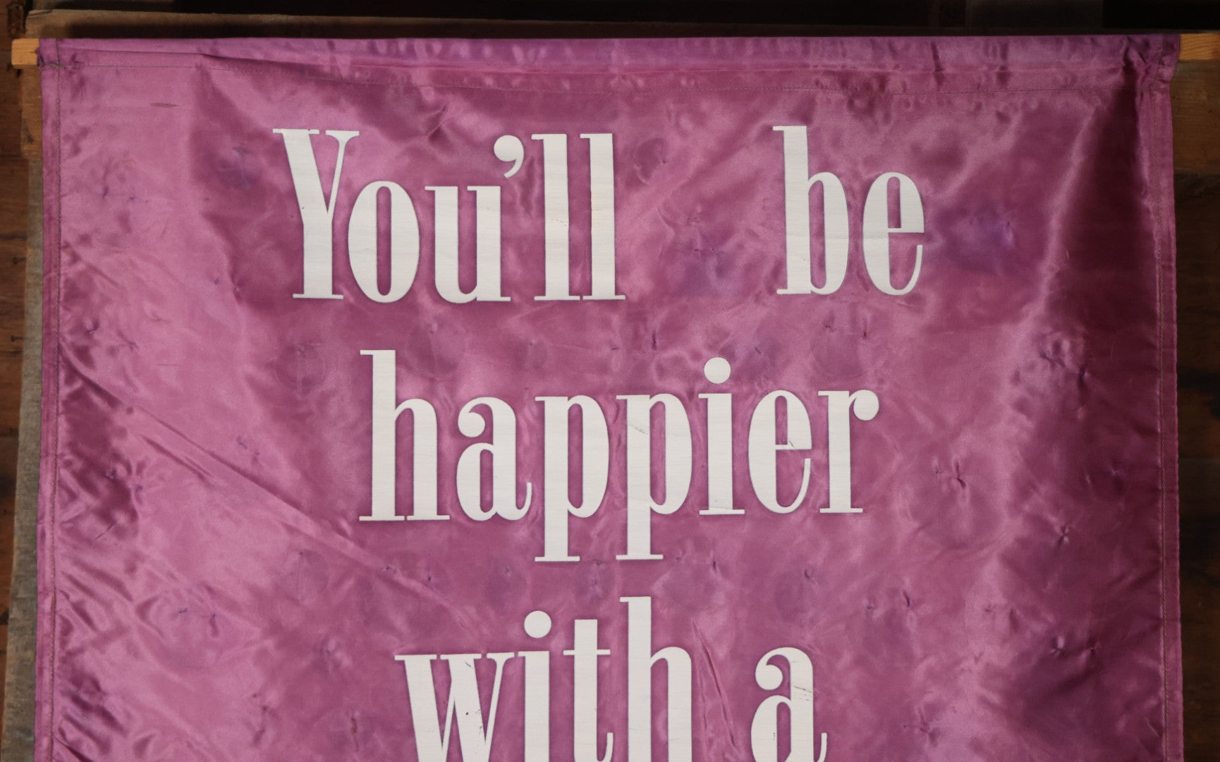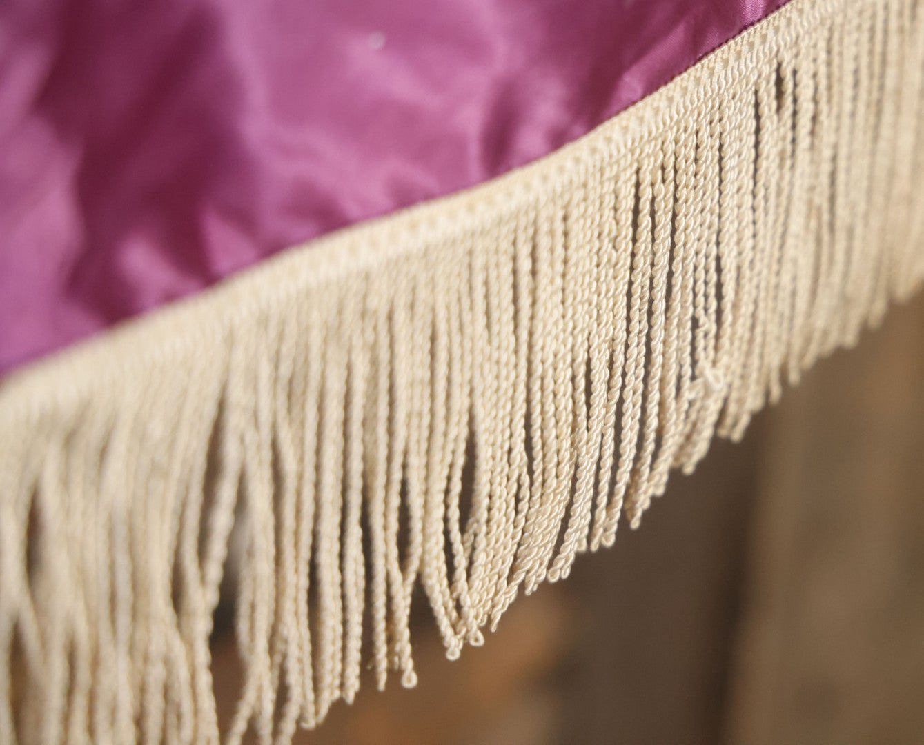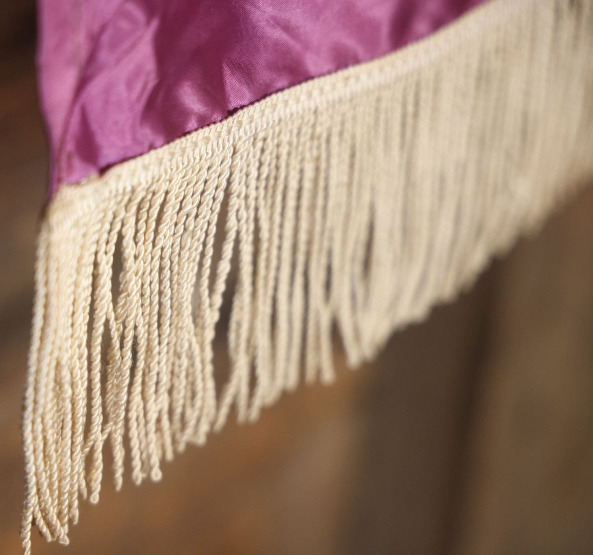 "You'll Be Happier With A Hoover" Vintage Purple Silken Advertising Banner For Hoover Vacuum Cleaners, With White Fringe On Bottom