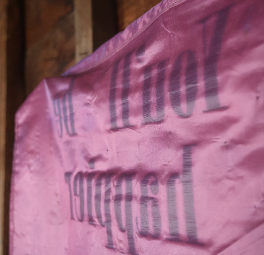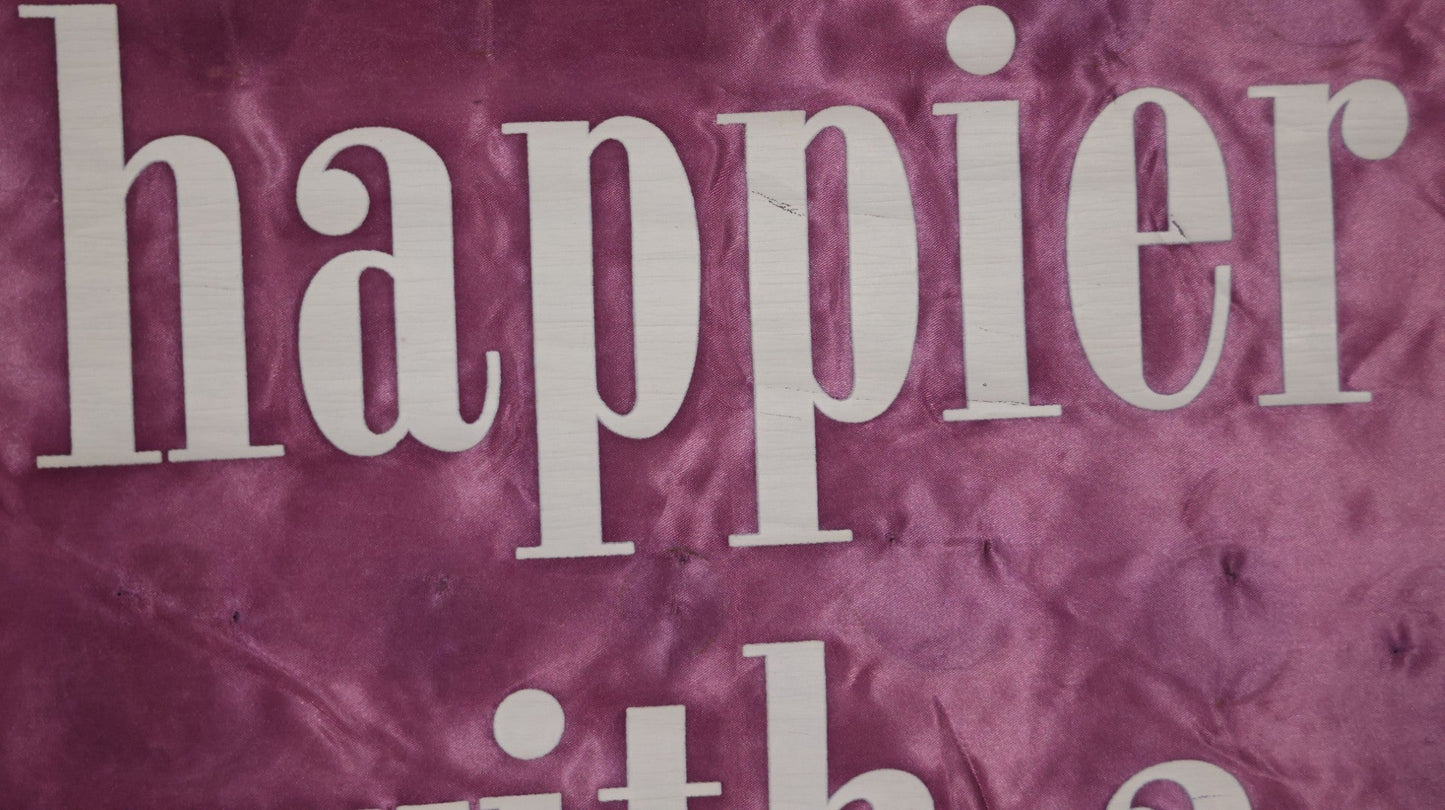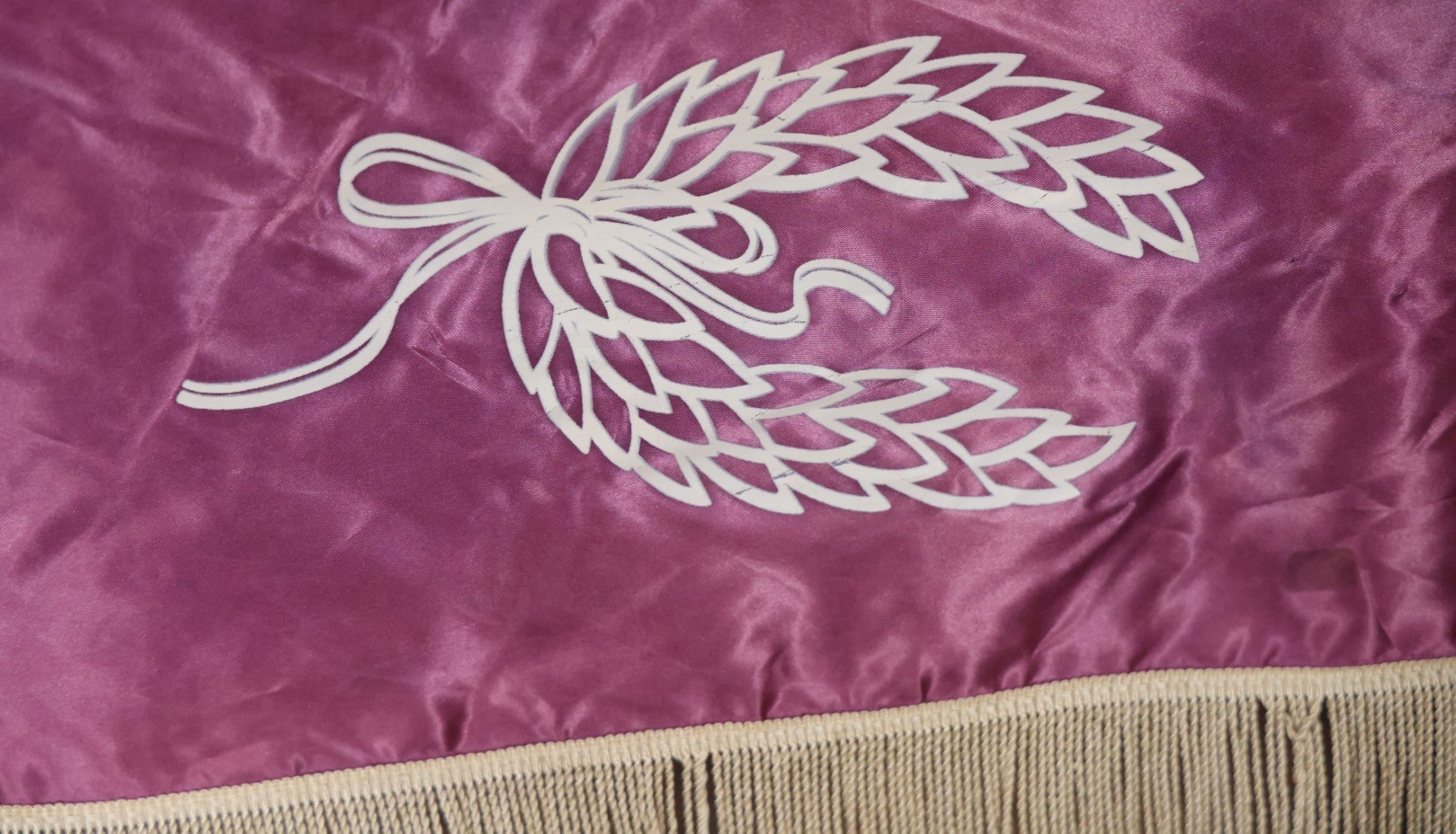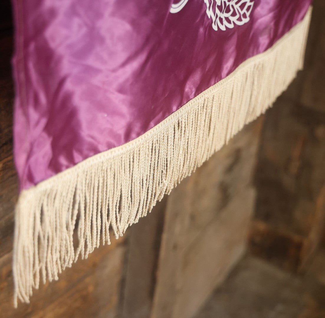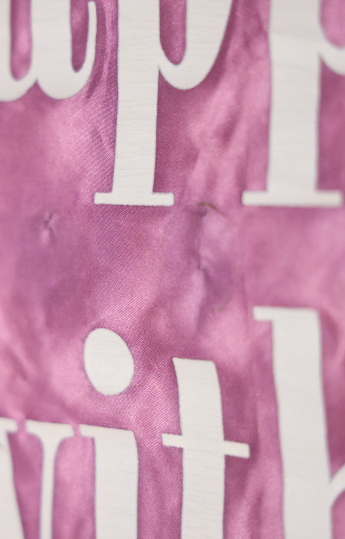 "You'll Be Happier With A Hoover" Vintage Purple Silken Advertising Banner For Hoover Vacuum Cleaners, With White Fringe On Bottom