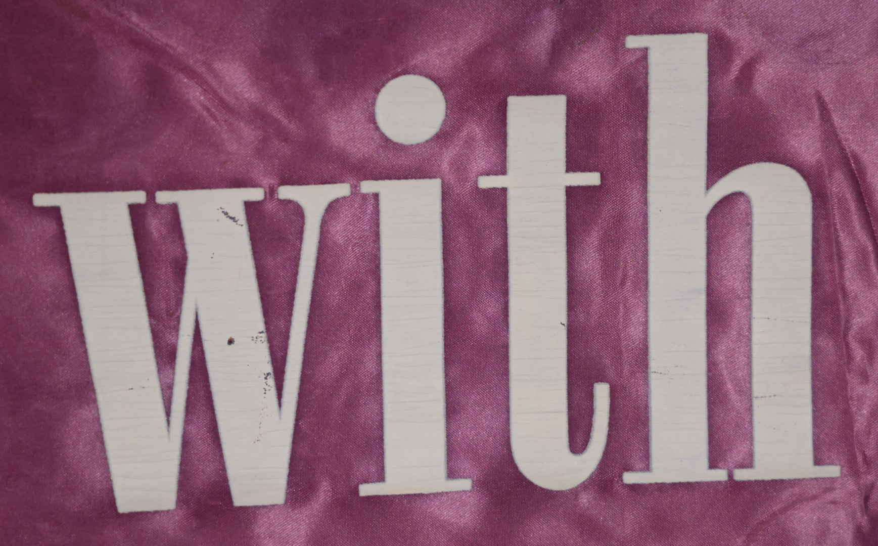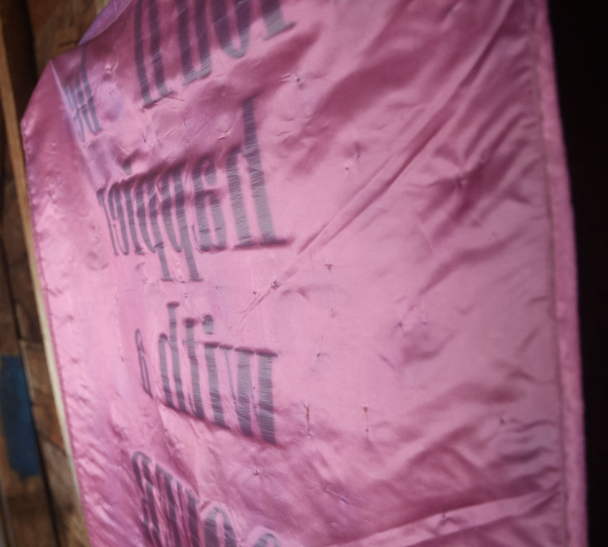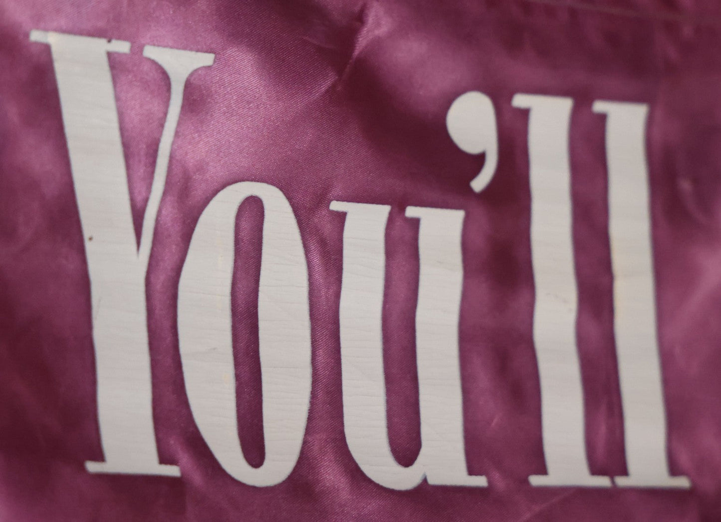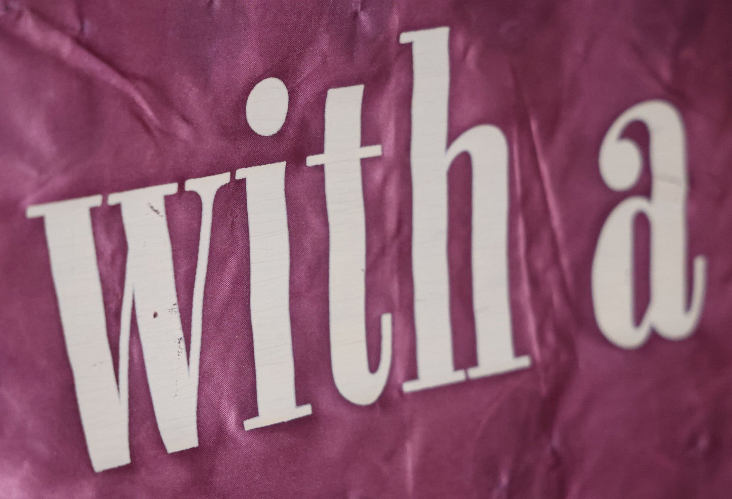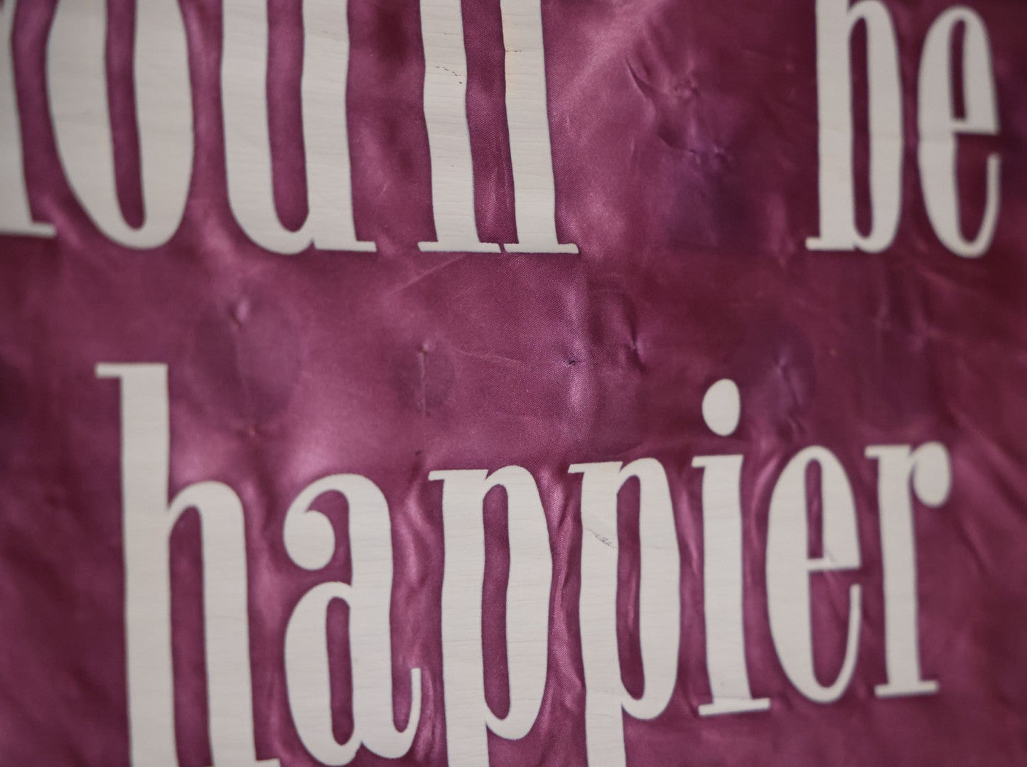 "You'll Be Happier With A Hoover" Vintage Purple Silken Advertising Banner For Hoover Vacuum Cleaners, With White Fringe On Bottom