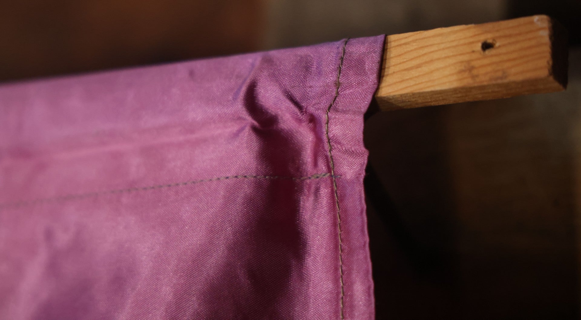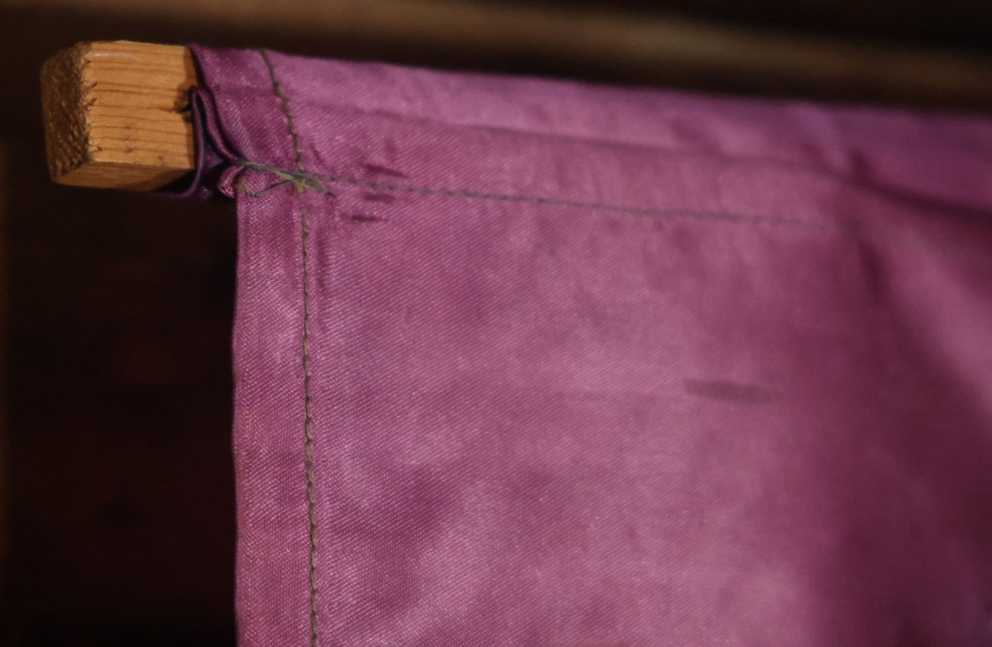 Various wear and tear, including creases, pin holes, etc. Overall width and height includes hanger and fringe.